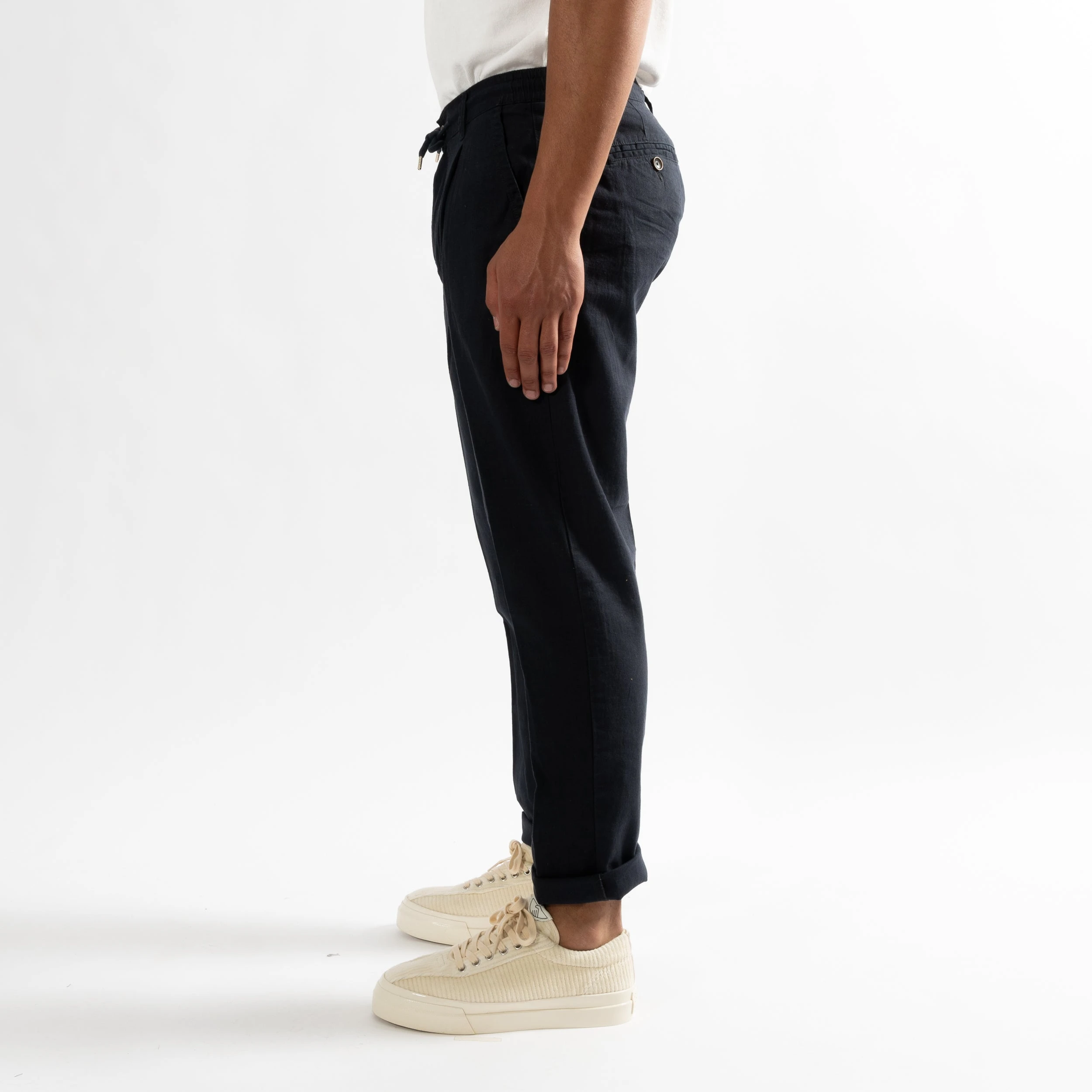 • Byxan är medelhög i midjan och har enkla frontveck. Byxan stängs med knapp och dras åt med dragsko. Byxan är succesivt avsmalnande ner till ett normalbrett fotslut.