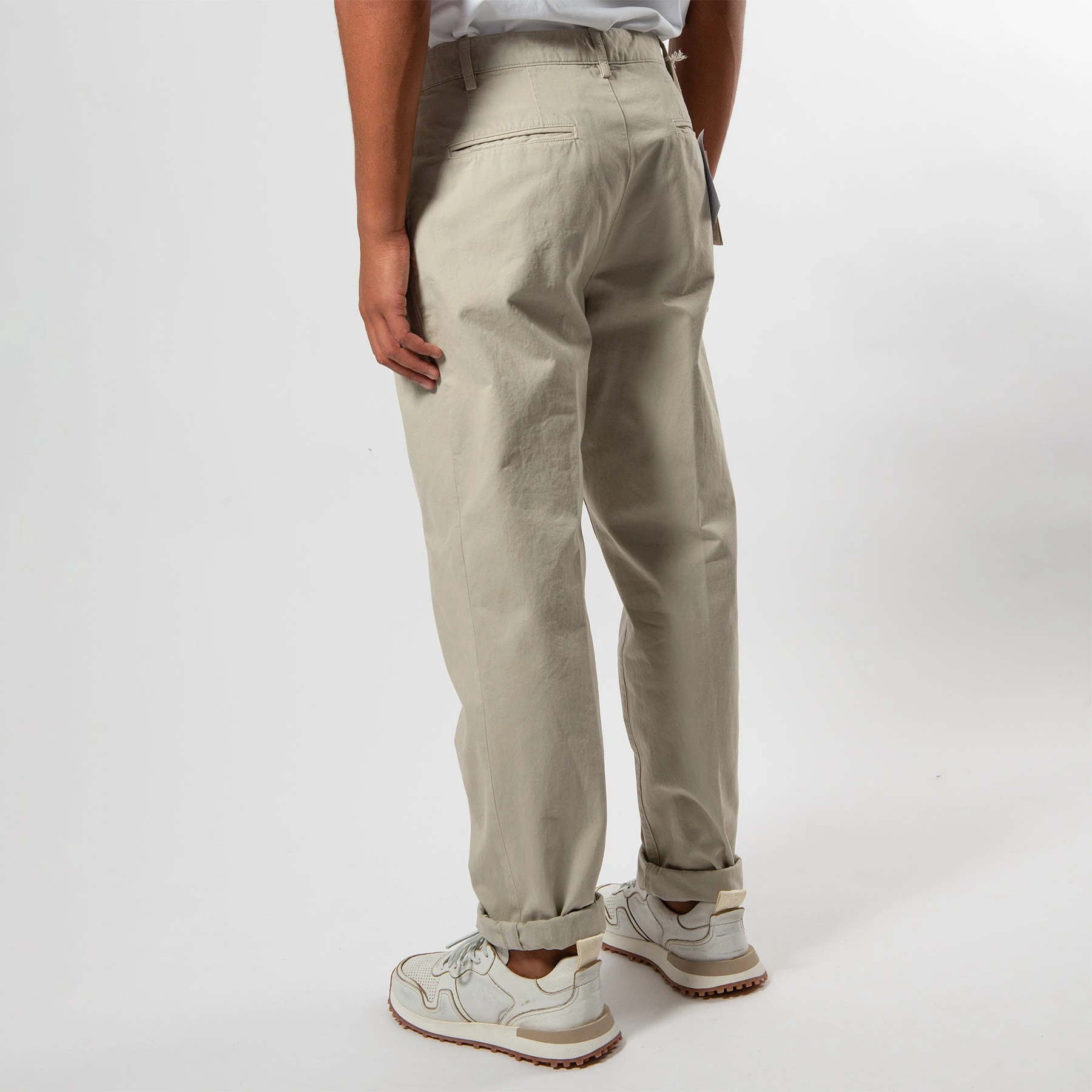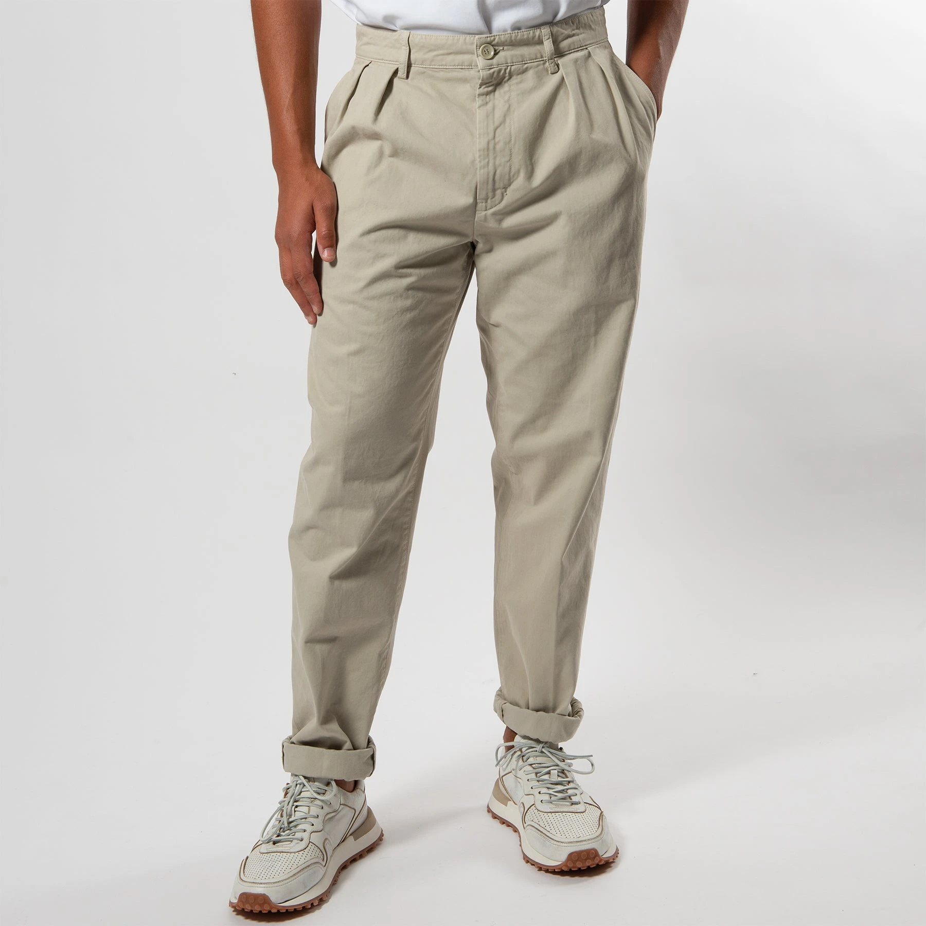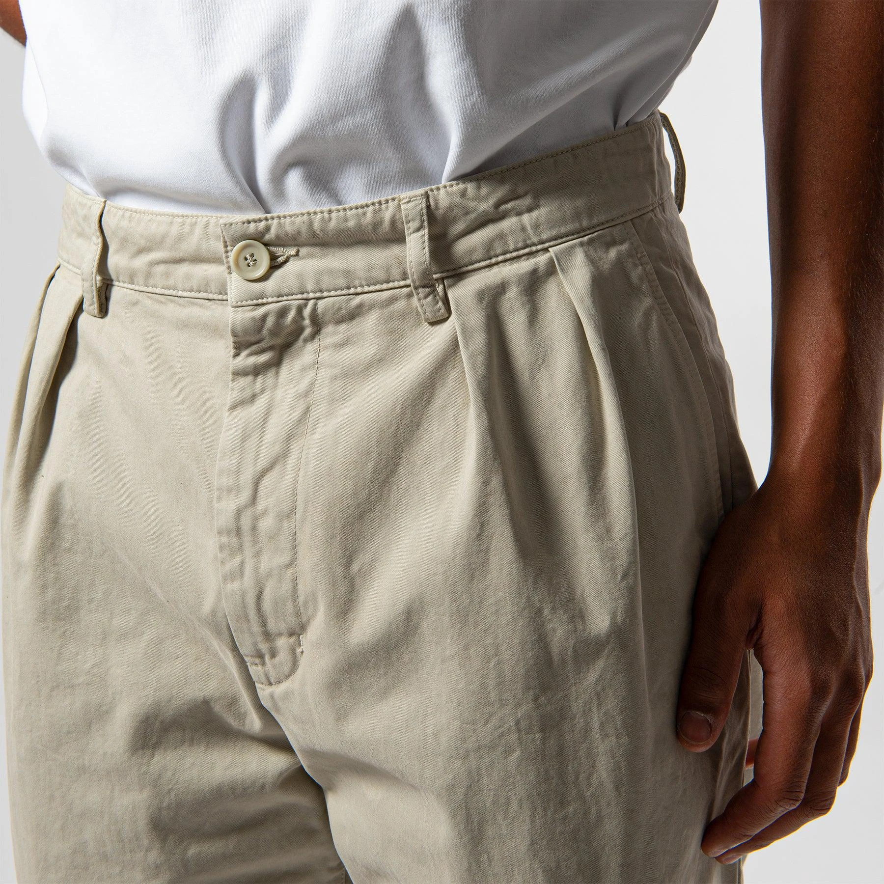 • Byxan är hög i midjan och bred över låren ner till ett normalbrett fotslut. Byxan har dubbla frontveck och två snedställda sidofickor samt två bakfickor.