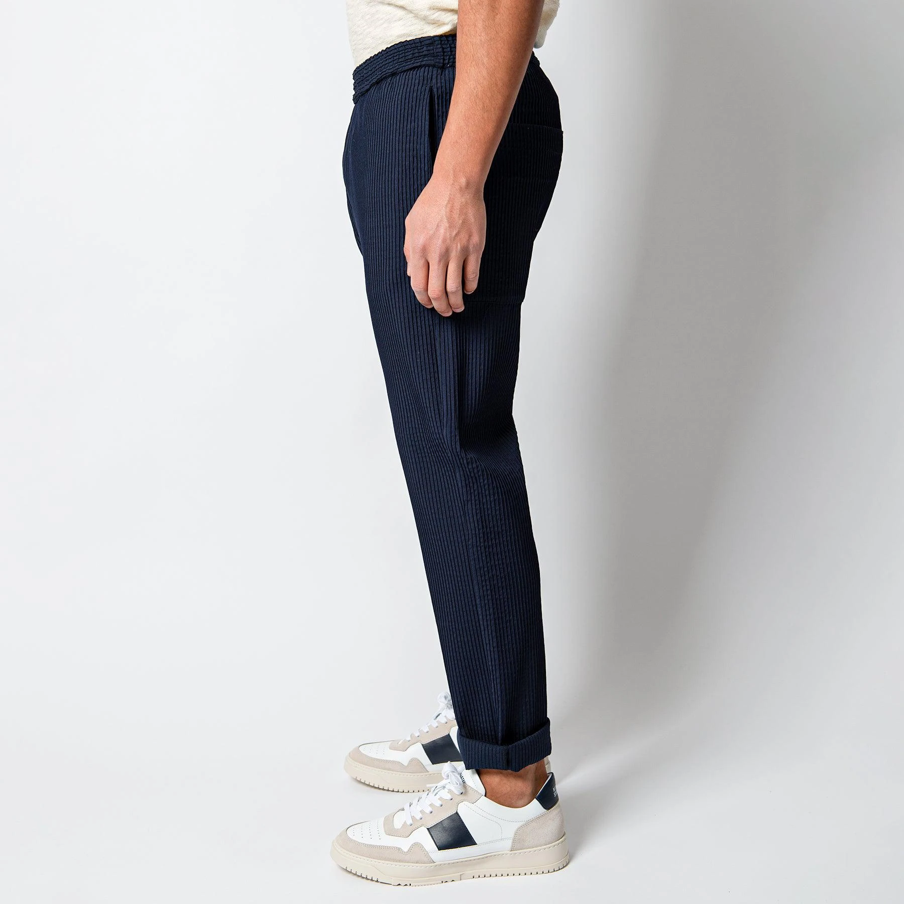 • Byxan är hög i midjan och bred över låren ner till ett normalbrett fotslut. Byxan har en resor i midjan och spänns med snörning.