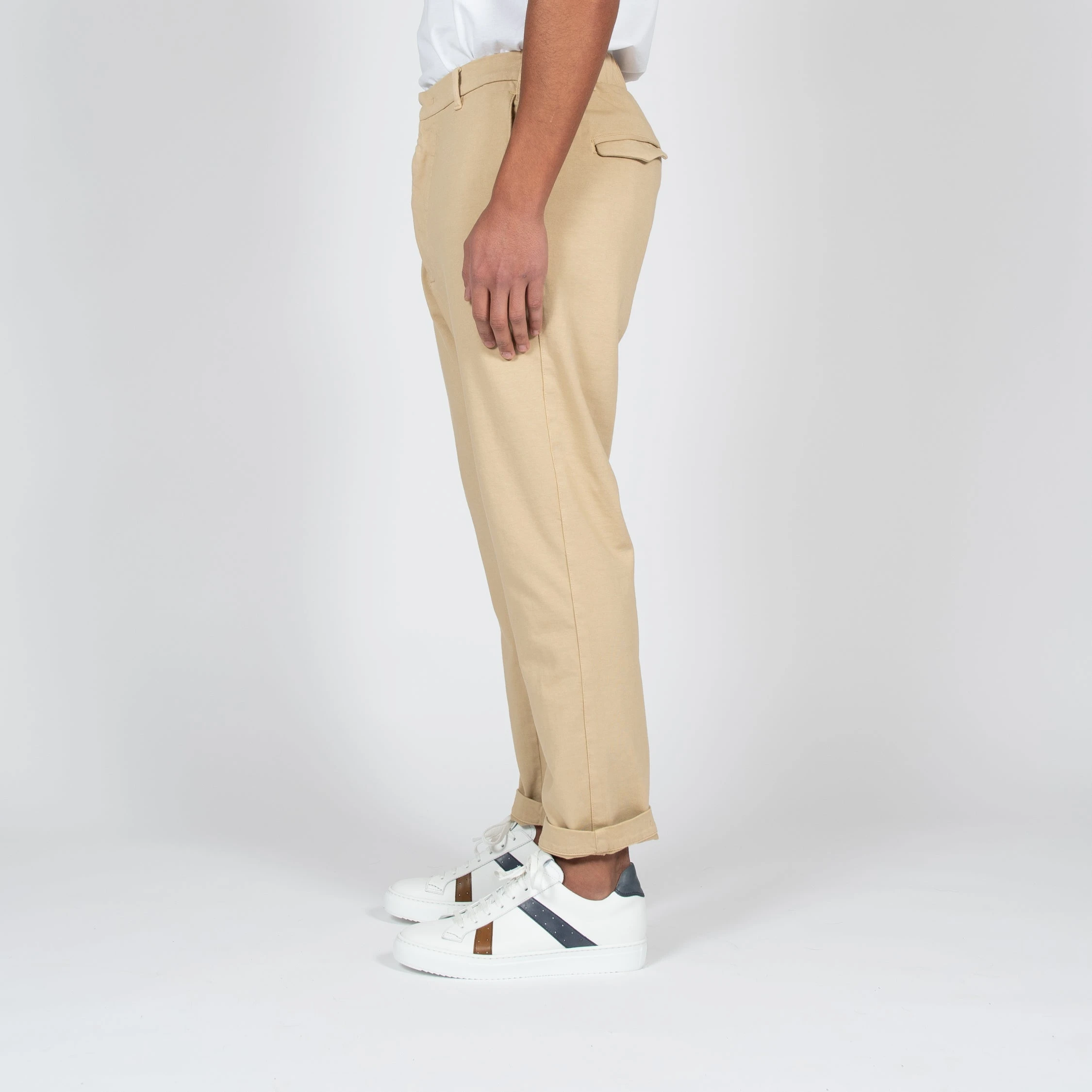 • Byxan är hög i midjan och bred över låren ner till ett normalbrett fotslut. Byxan har två snedställda framfickor samt två bakfickor med knapp.