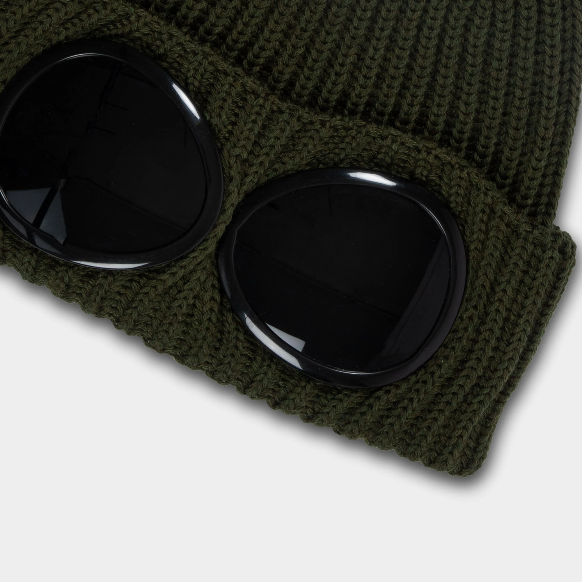 • En ribbstickad mössa med två stycken glasögon vid mössans vikning.