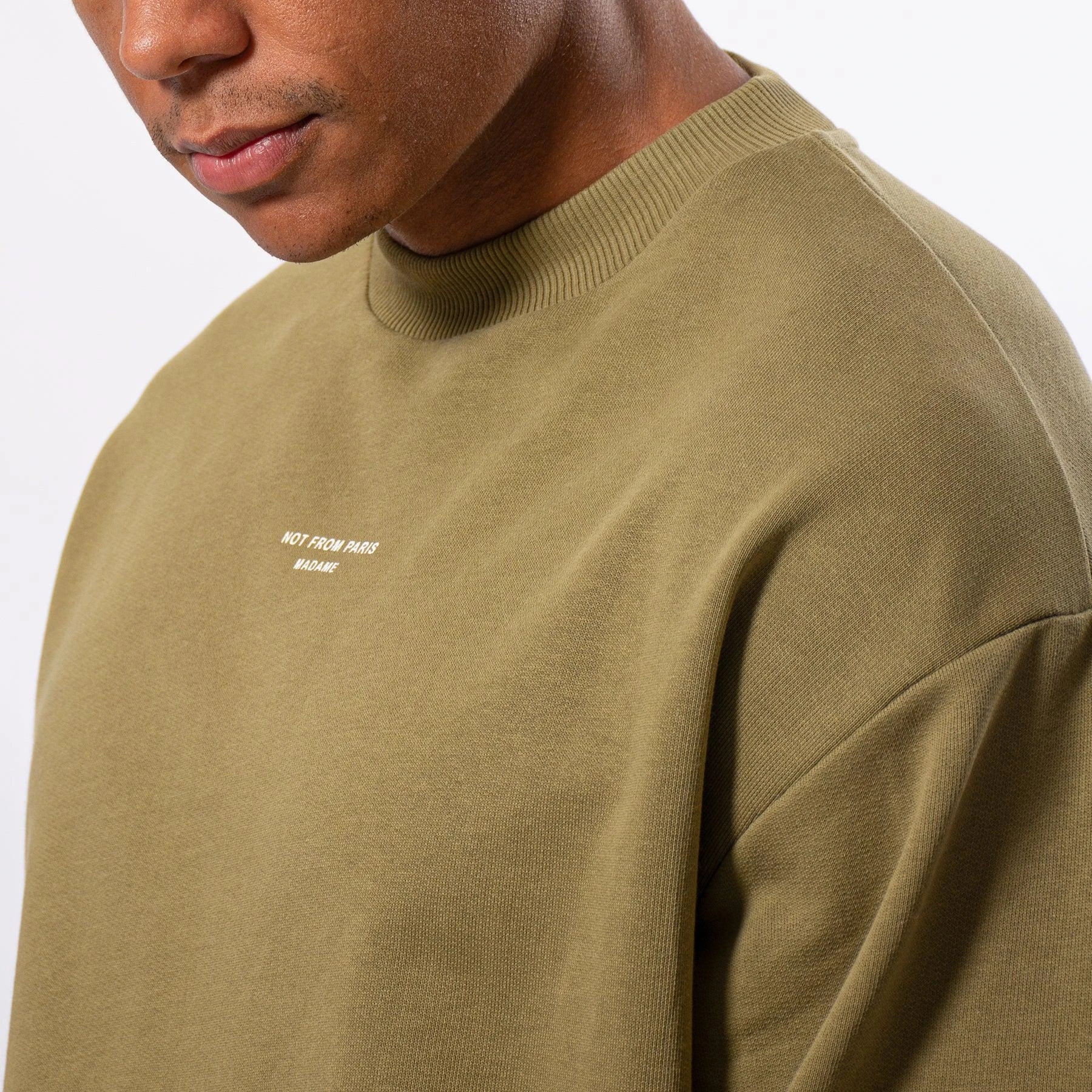 • Tröjan är boxig i modellen och har en rundad normalstor hals. Tröjan har märkets motto (not from paris madame) tryckt på bröstet och har normalt åtsittande muddar vid ärm- samt plaggslut. Tröjan är midjelång och har en kraftigt droppad axel.