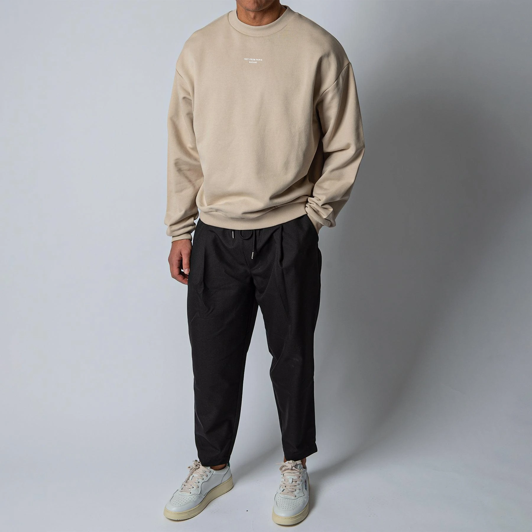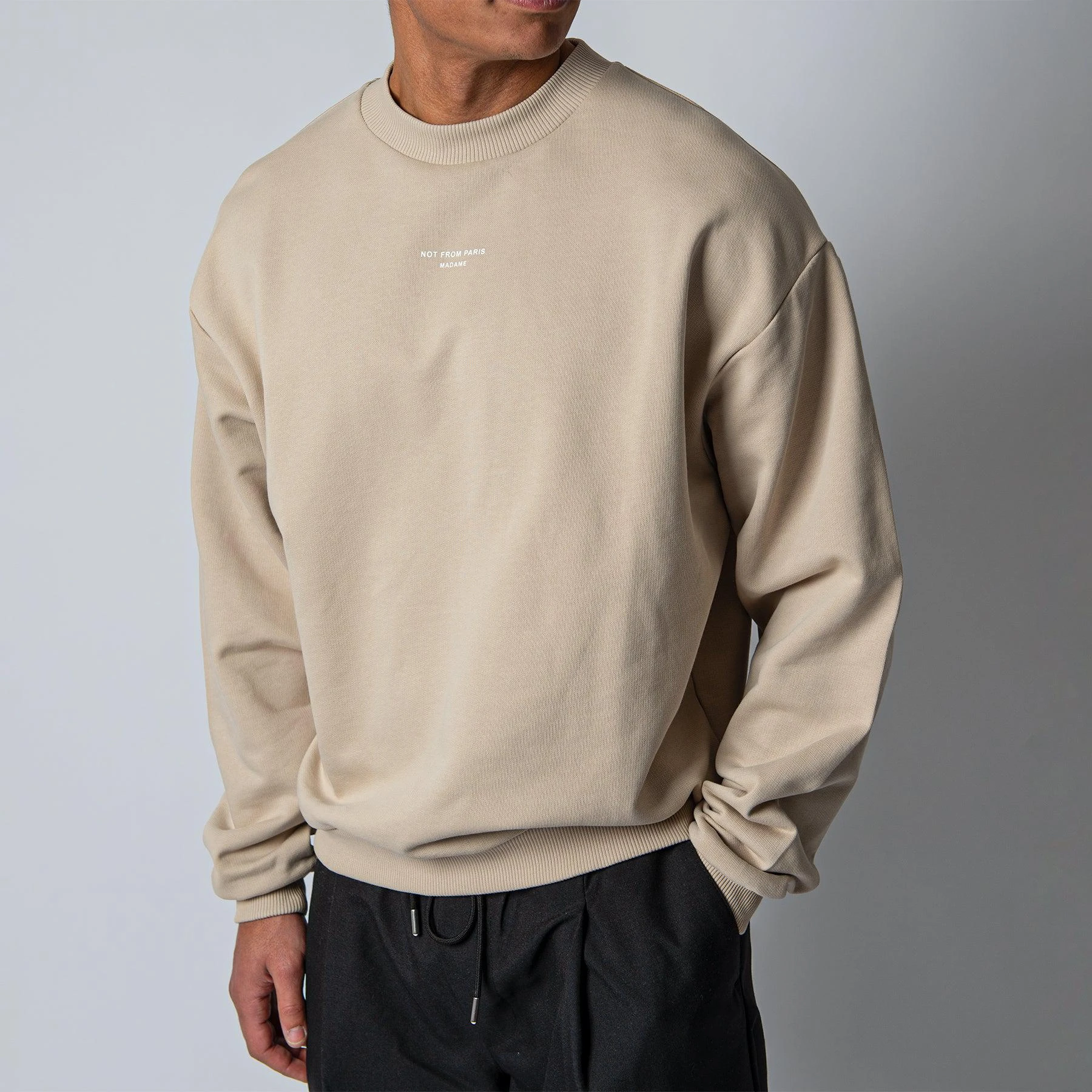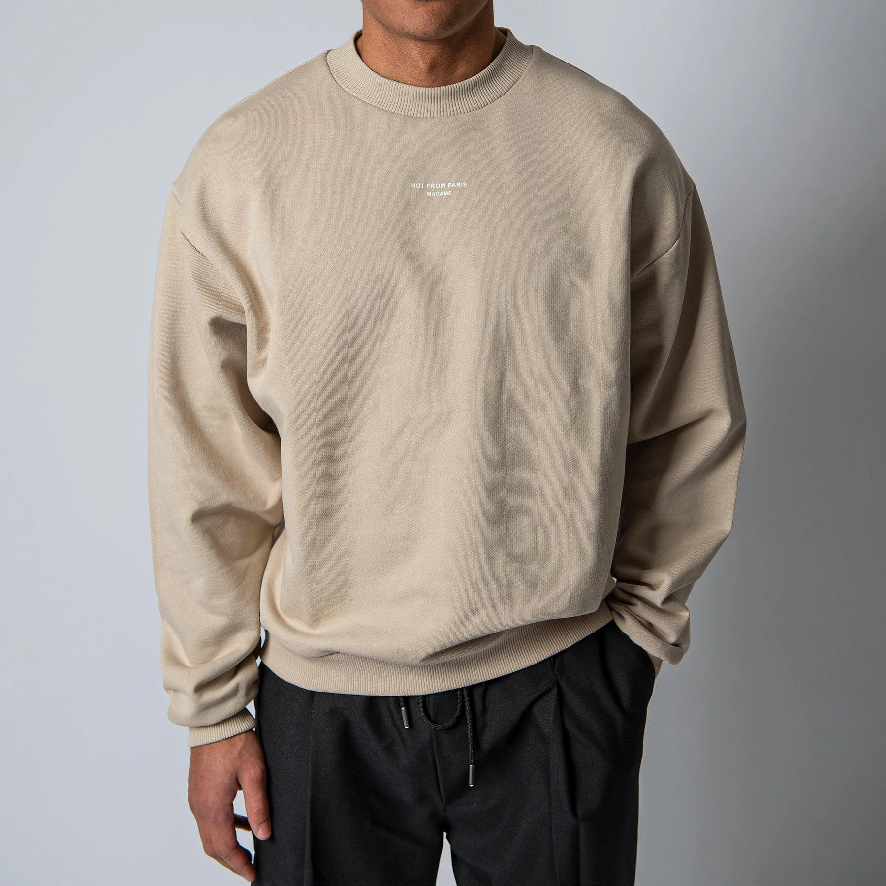• Tröjan är boxig i modellen och har en rundad normalstor hals. Tröjan har märkets motto (not from paris madame) tryckt på bröstet och har normalt åtsittande muddar vid ärm- samt plaggslut. Tröjan är midjelång och har en kraftigt droppad axel.