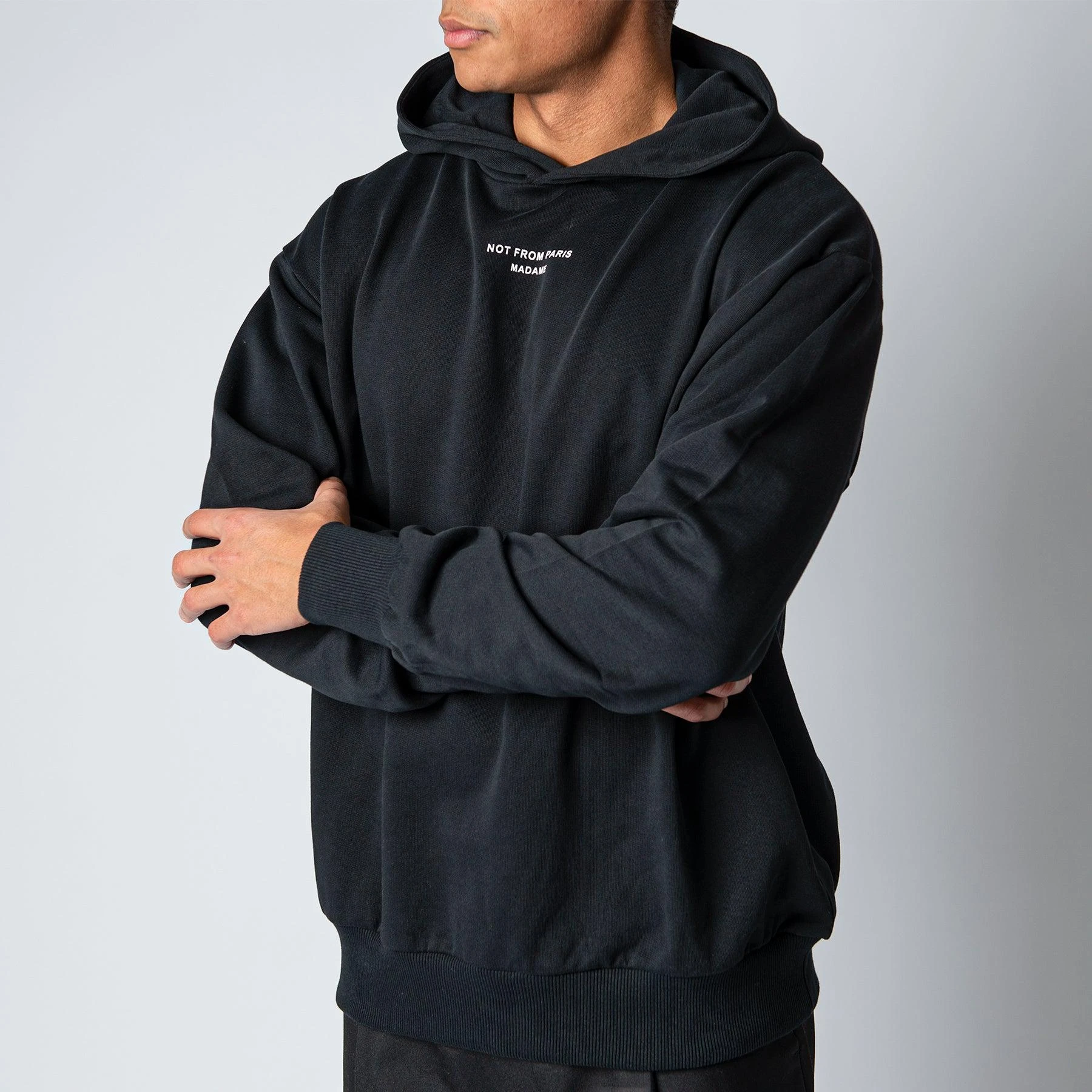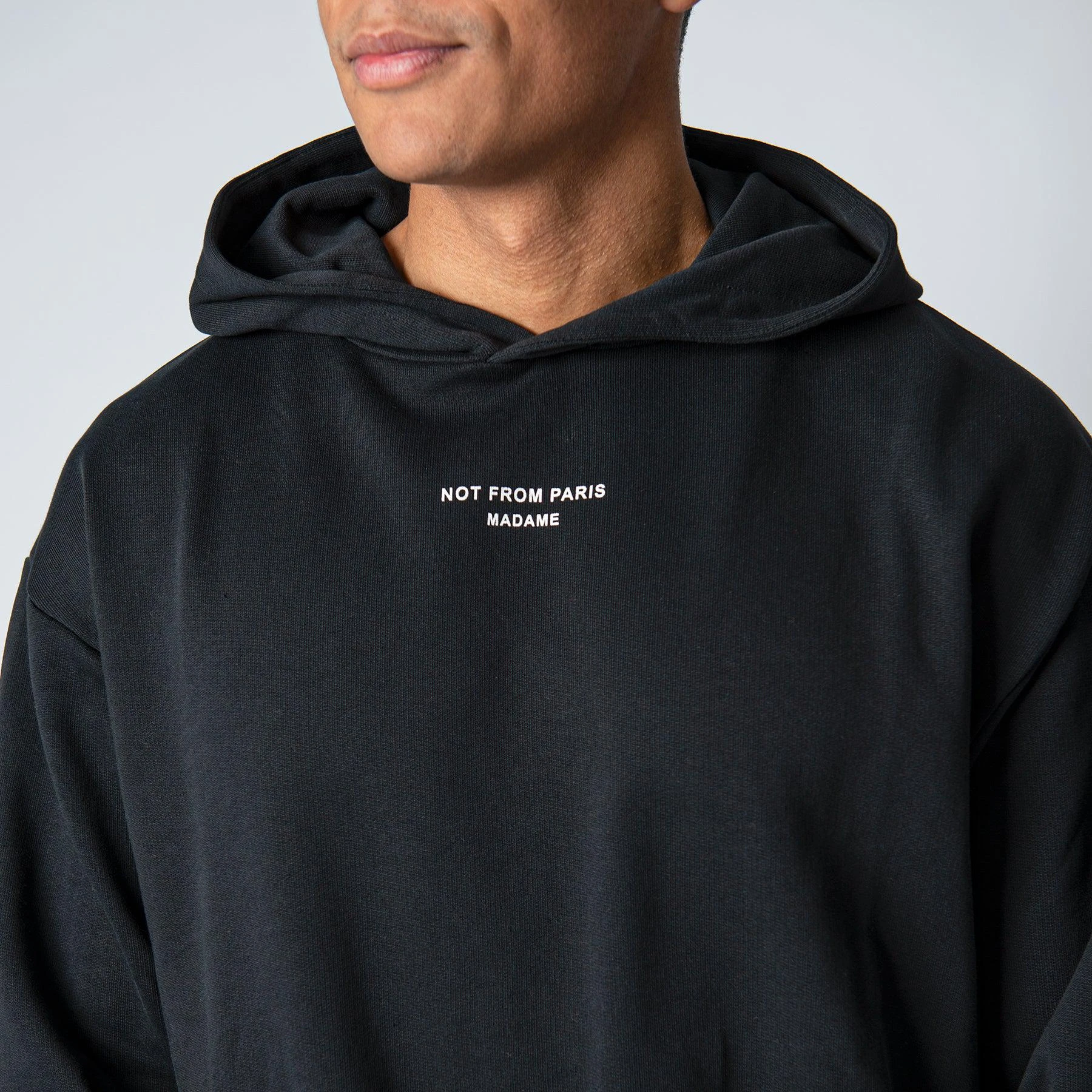 • Hoodien är boxig i modellen och har en rymlig luva med dragsko. Hoodien har märkets ikoniska mott ”Not From Paris Madame” tryckt på bröstet. Hoodien är midjelång och har en kraftigt droppad axel.