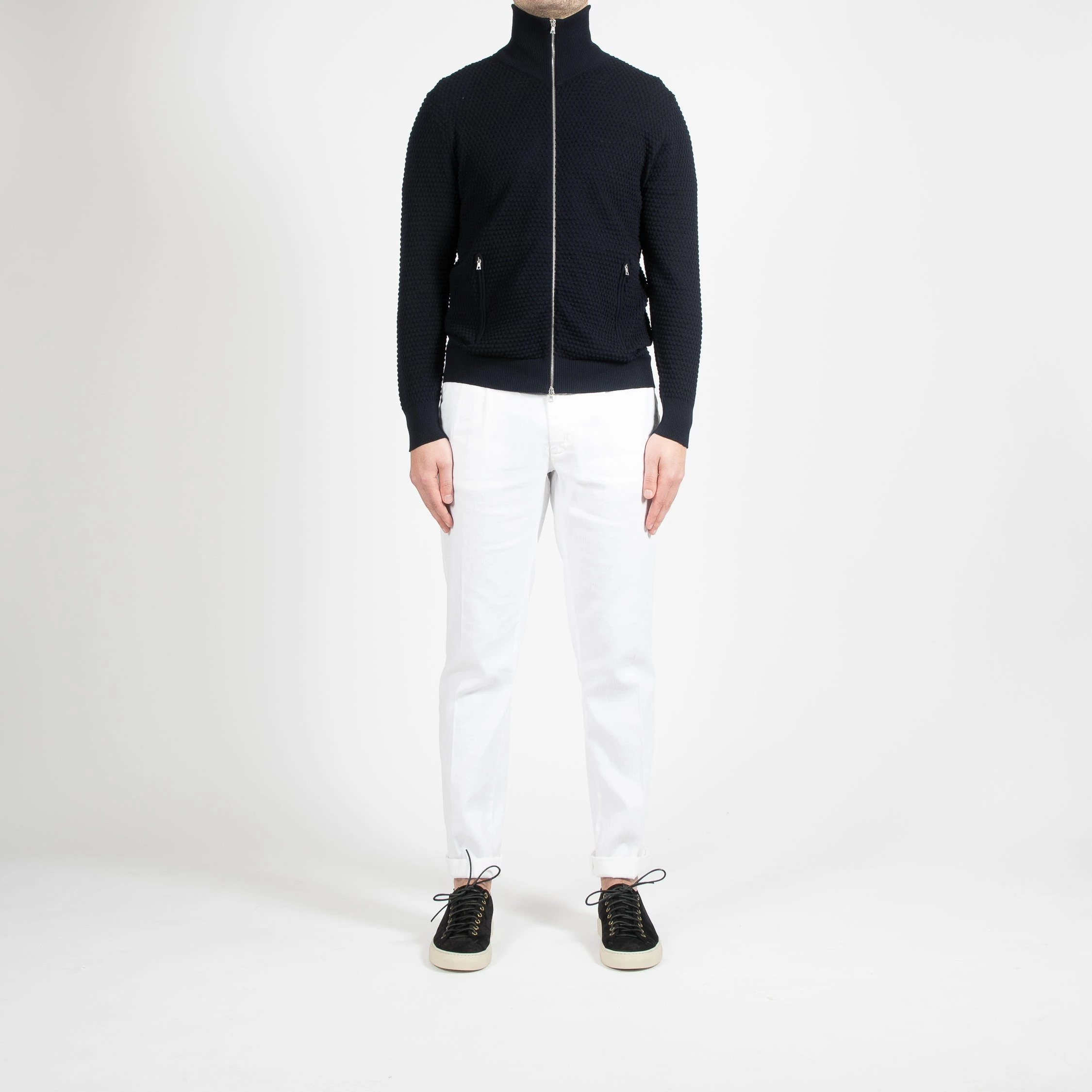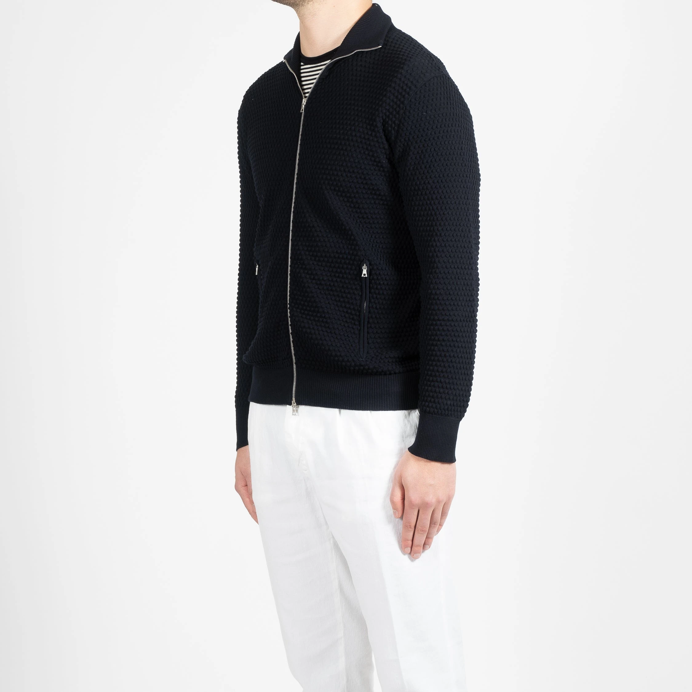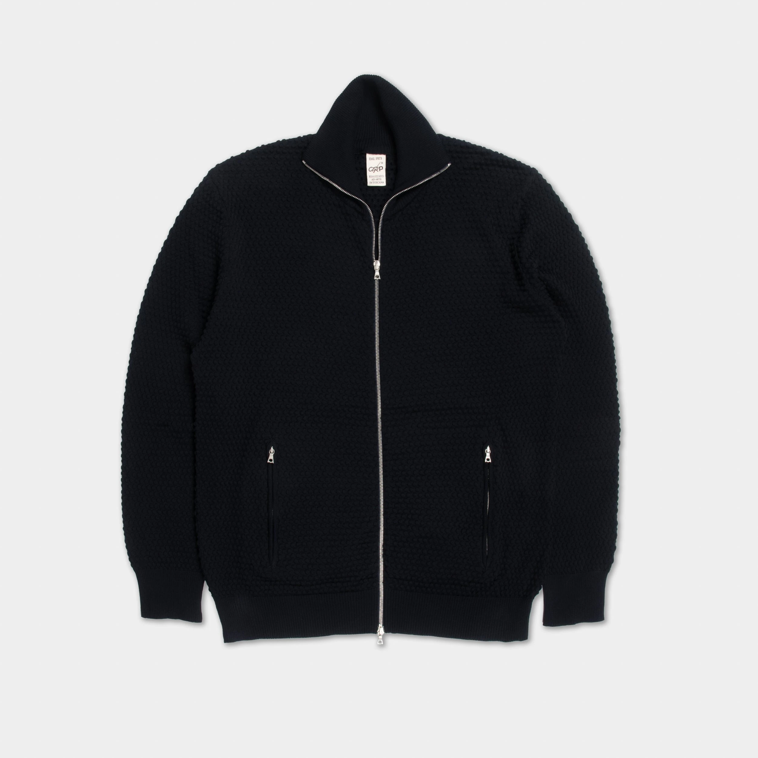 • Tröjan stängs med dubbla dragkedjor och har två stycken sidofickor med dragkedja. Tröjan har en stå-krage och är utvidgat i ett prickigt tyg. Tröjan har normalhårt åtsittande muddar vid ärm- samt plaggslut.