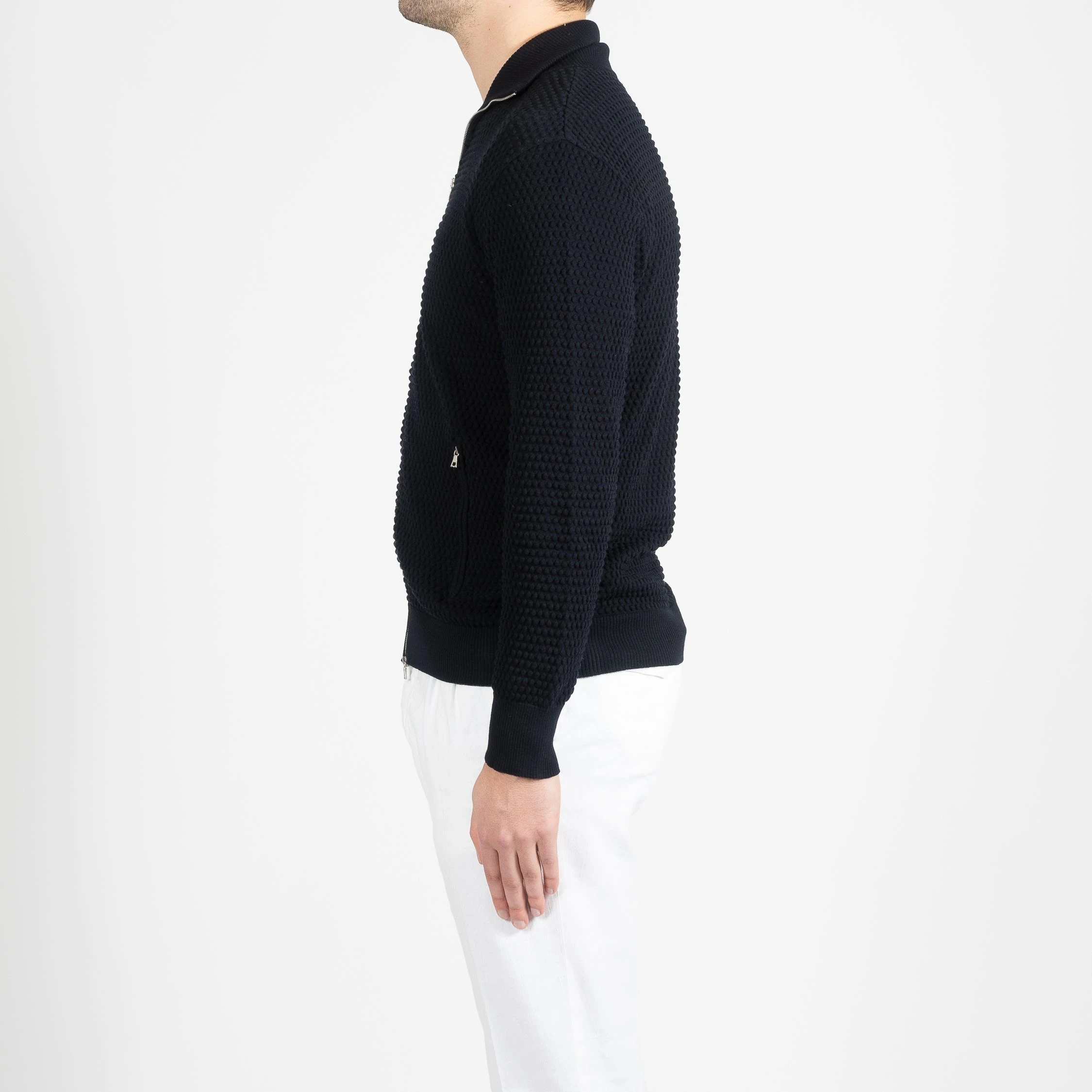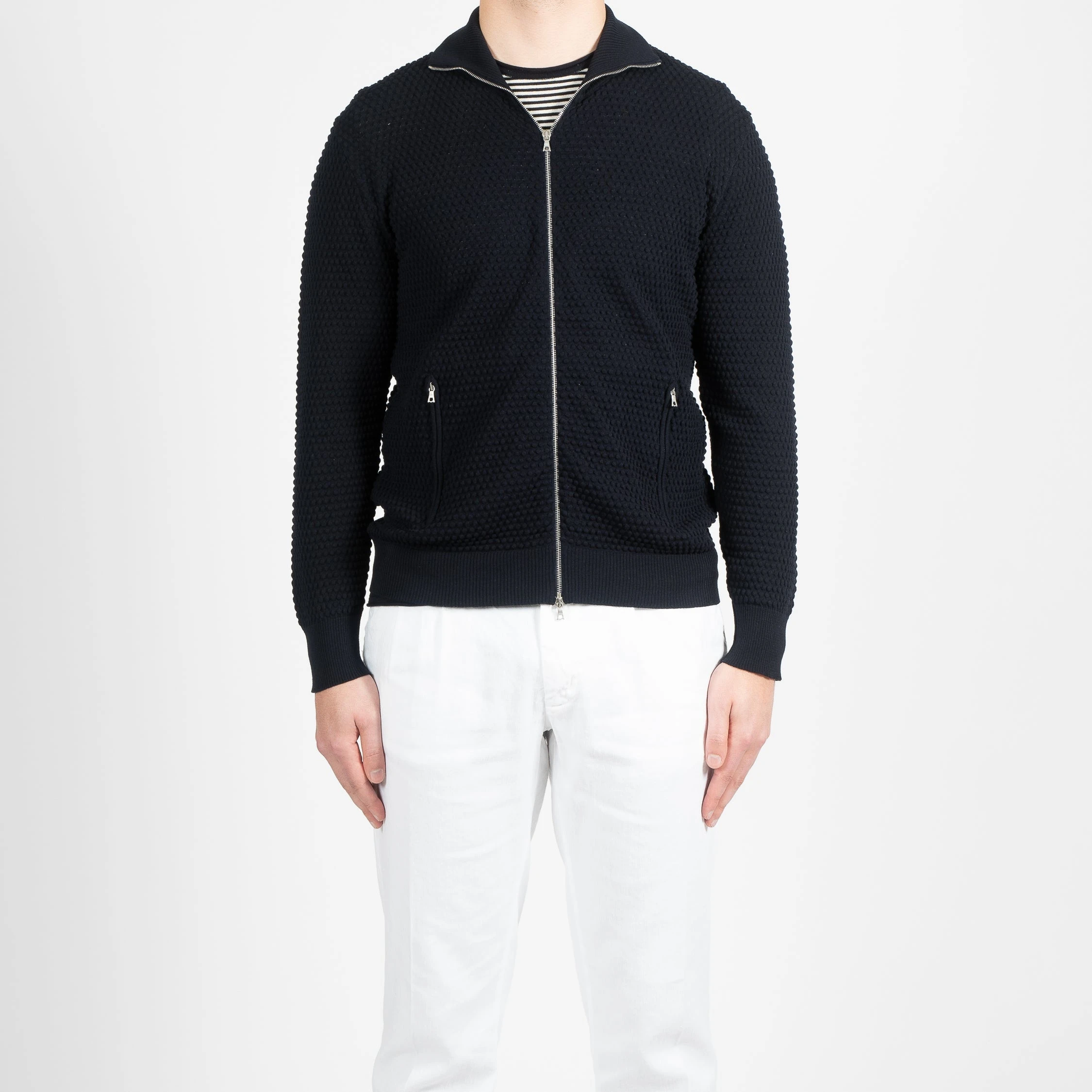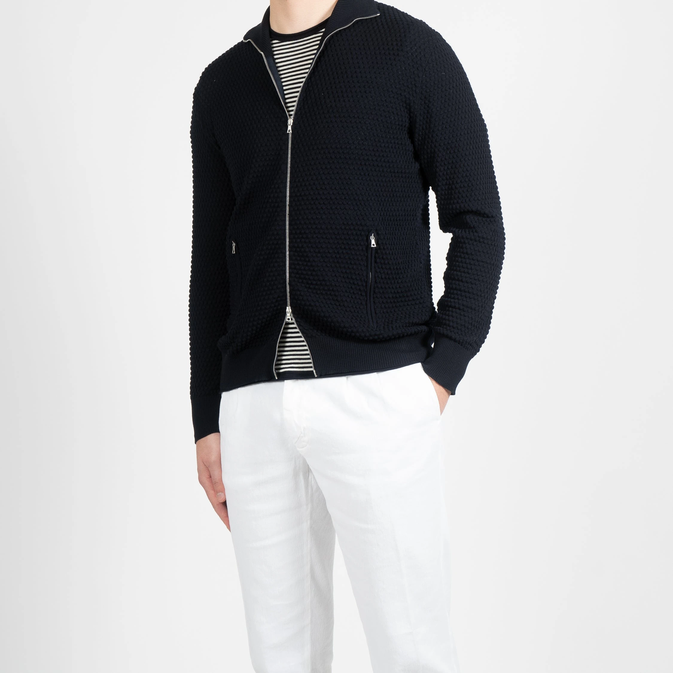 • Tröjan stängs med dubbla dragkedjor och har två stycken sidofickor med dragkedja. Tröjan har en stå-krage och är utvidgat i ett prickigt tyg. Tröjan har normalhårt åtsittande muddar vid ärm- samt plaggslut.