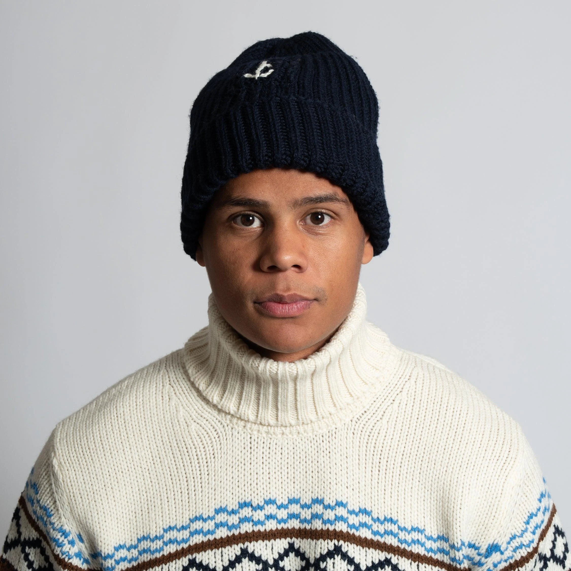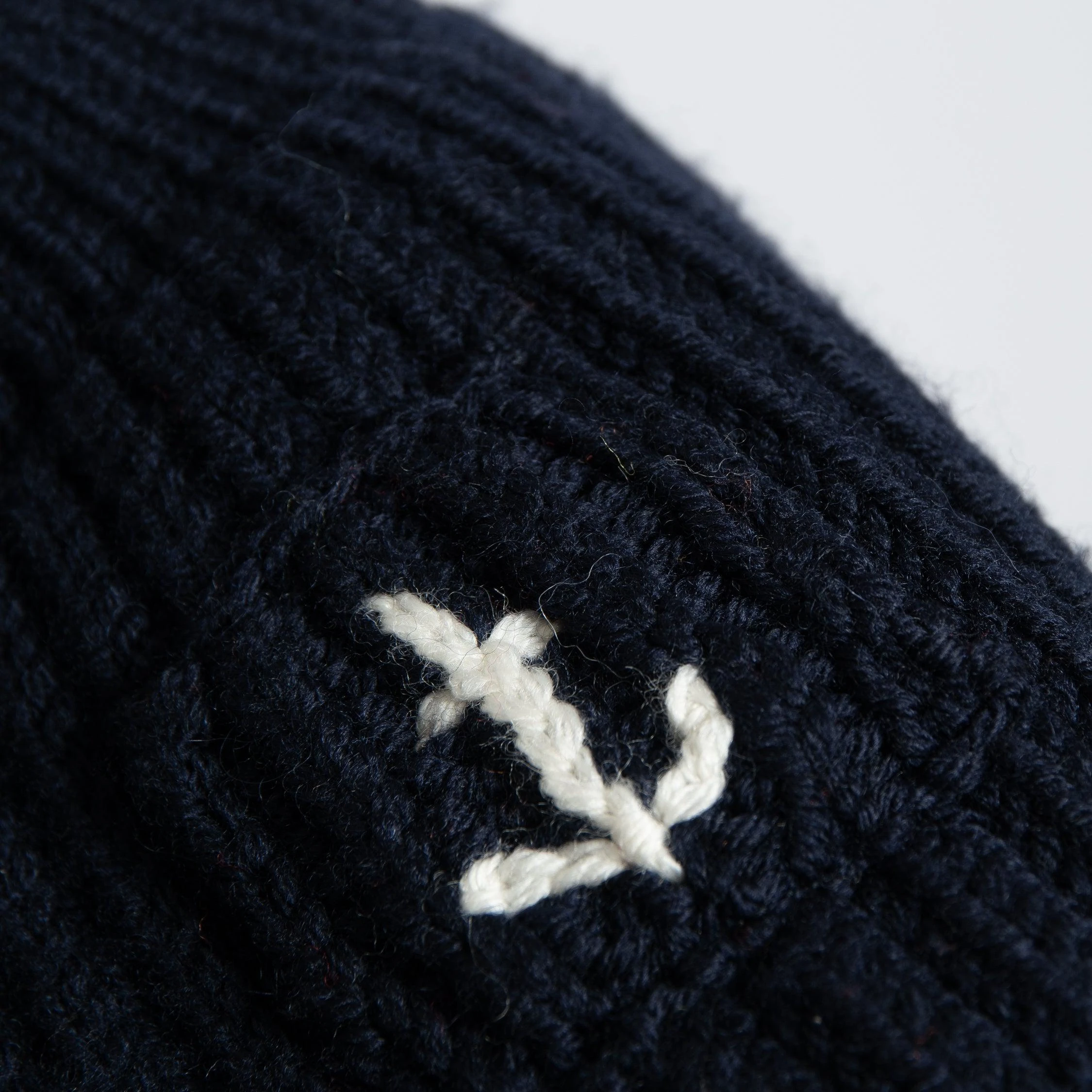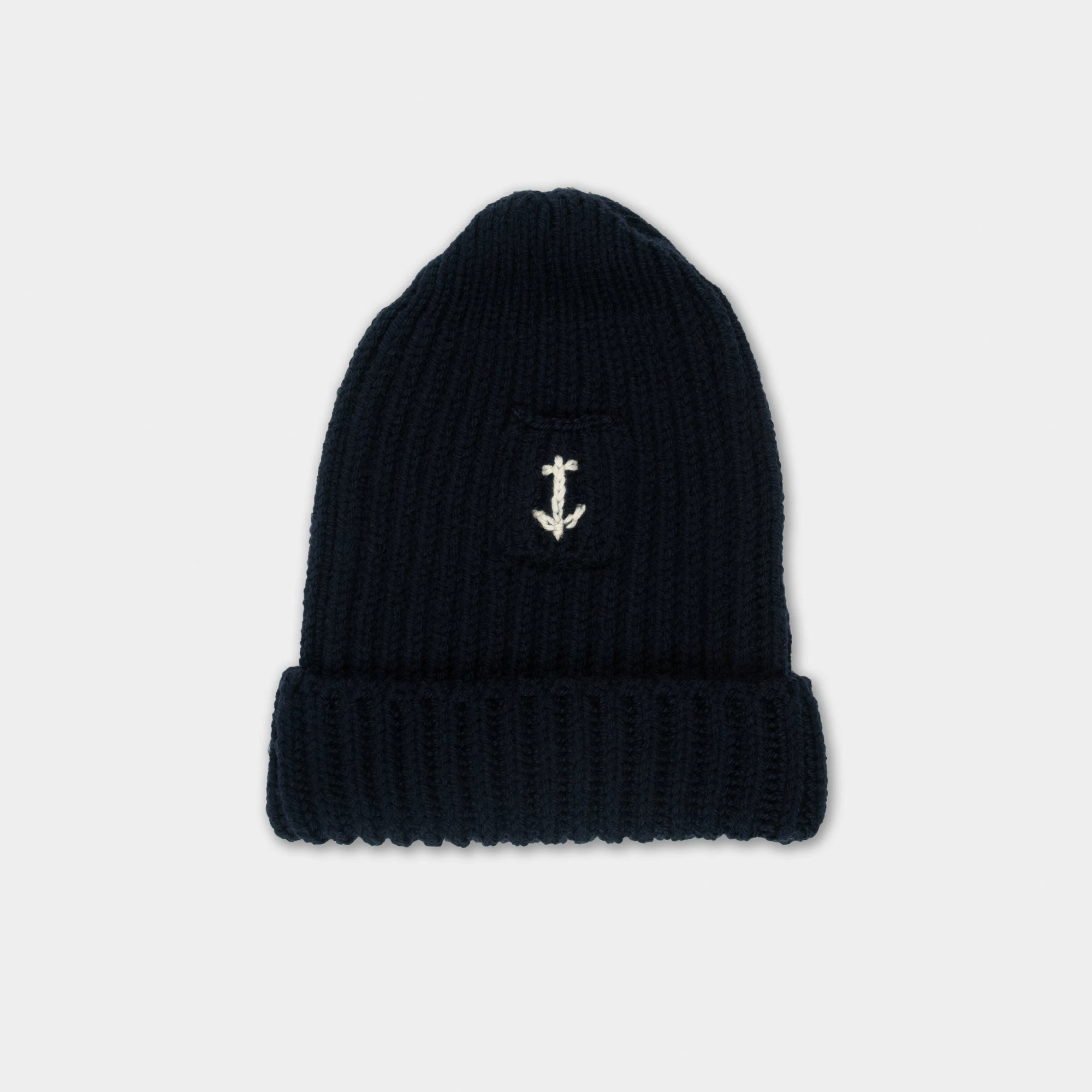 • En mössa som är hög med ett stickat ankare och en ficka under ankaret. Mössan är vikt.