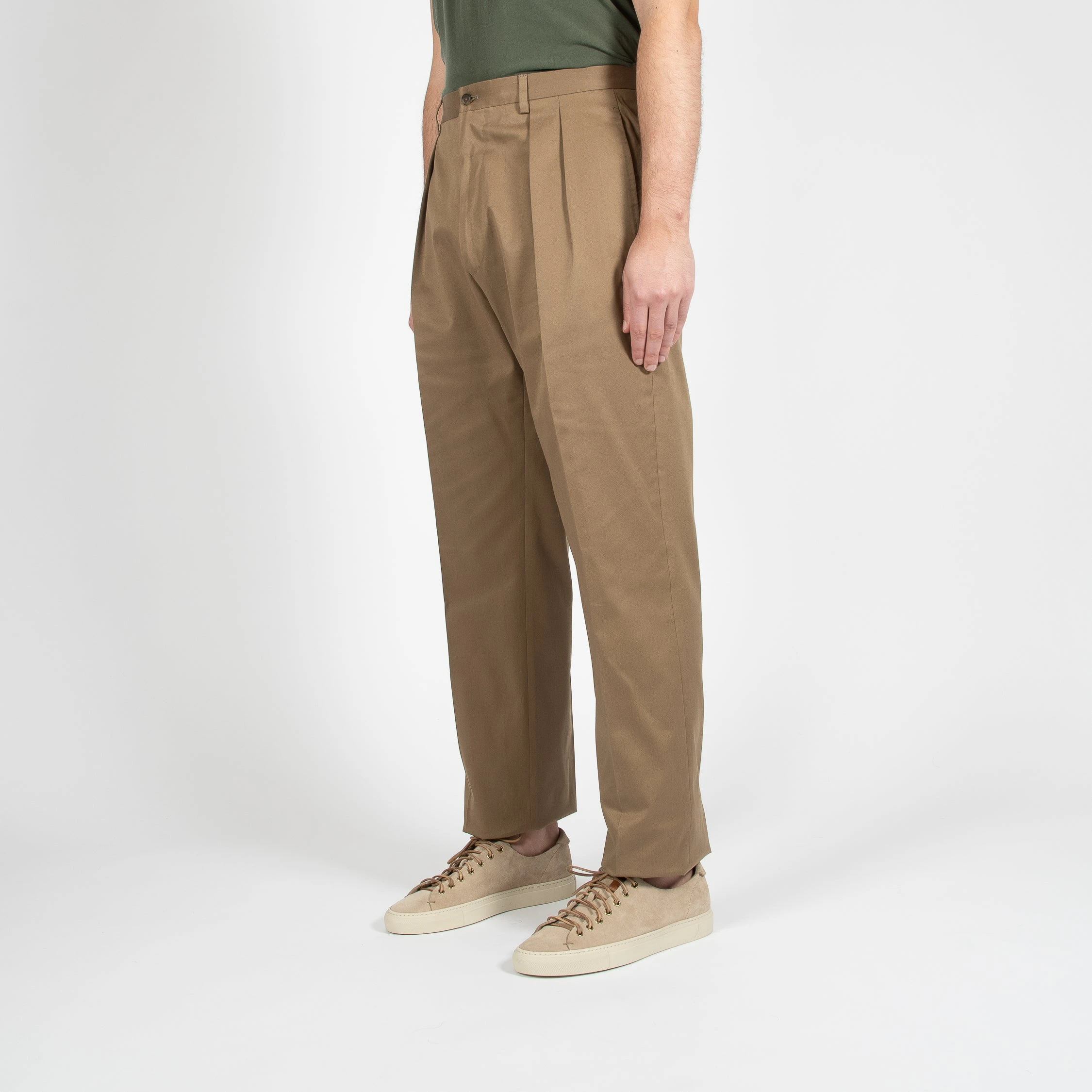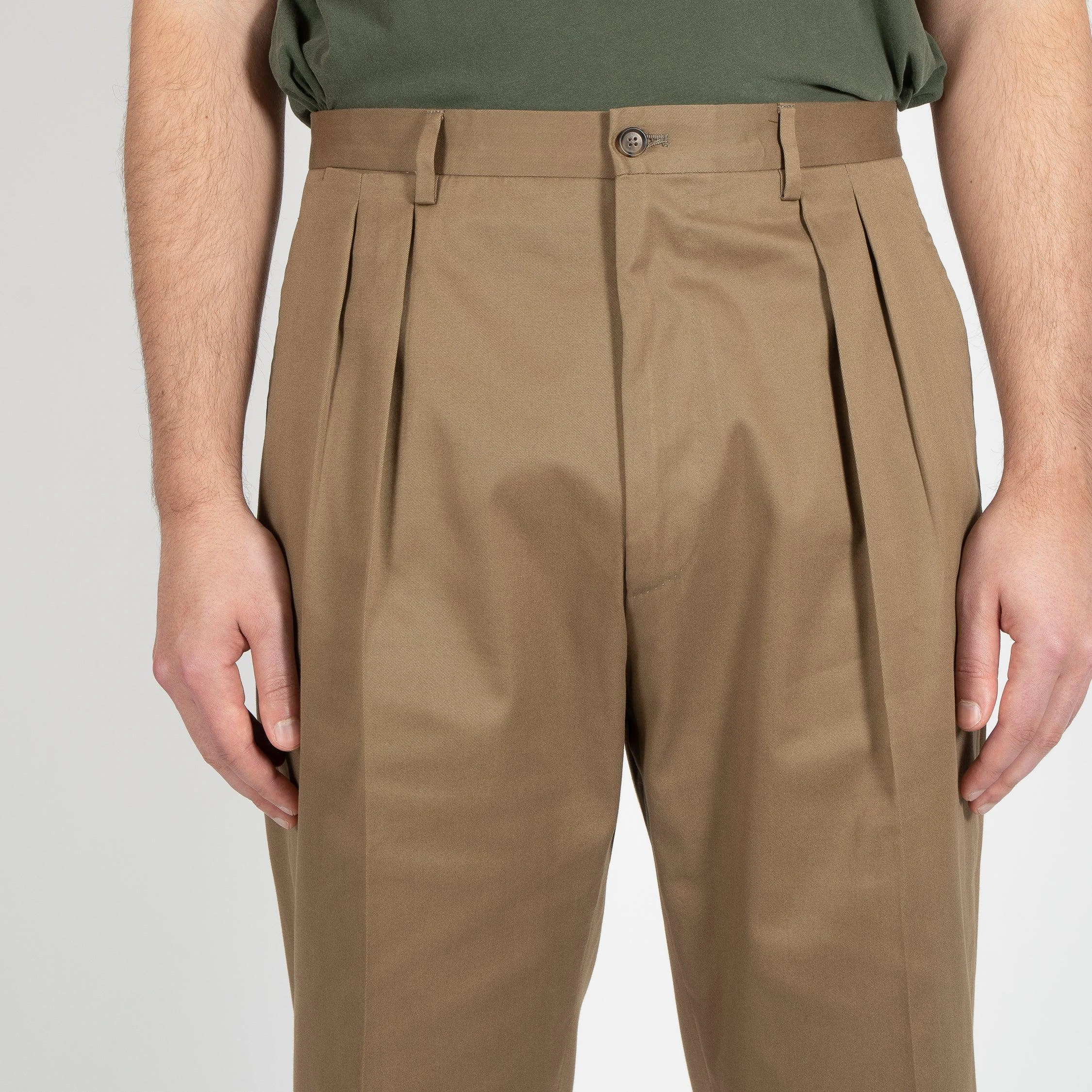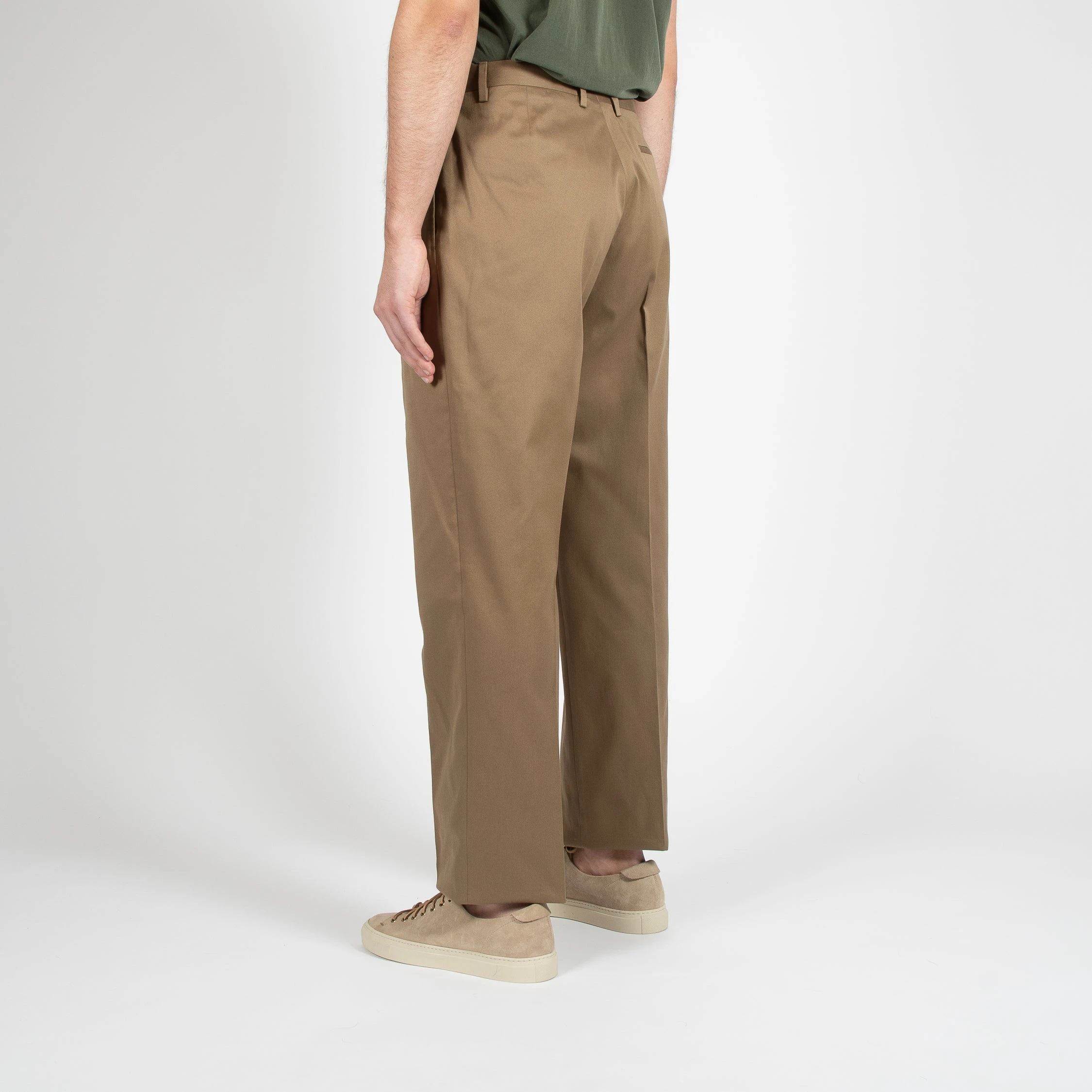 • Byxan är hög i midjan och har två frontveck på vardera ben. Byxan är bred över låren och avsmalnande ner till ett normalbrett fotslut. Byxan har en ficka på höger baksida och stängs med knappar.