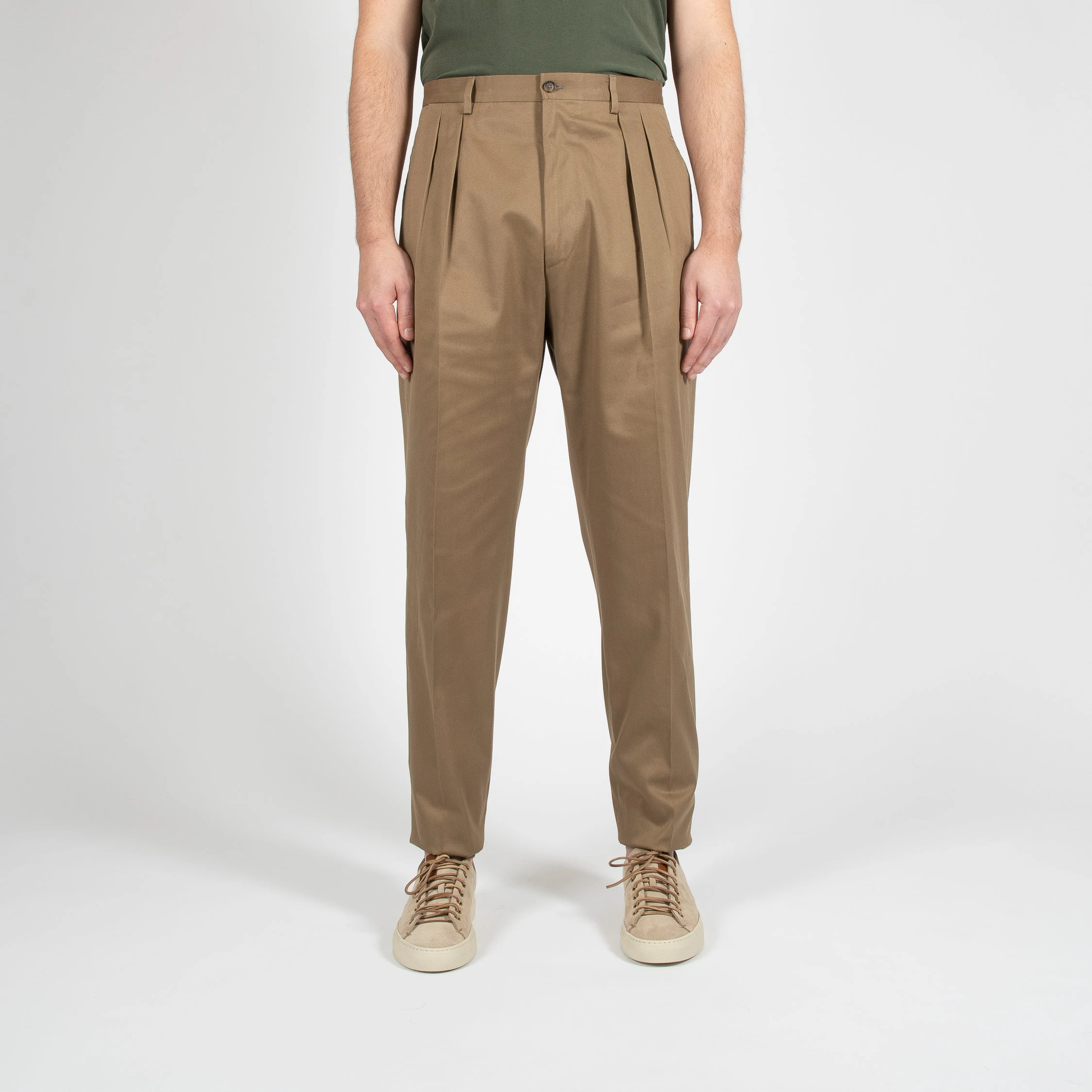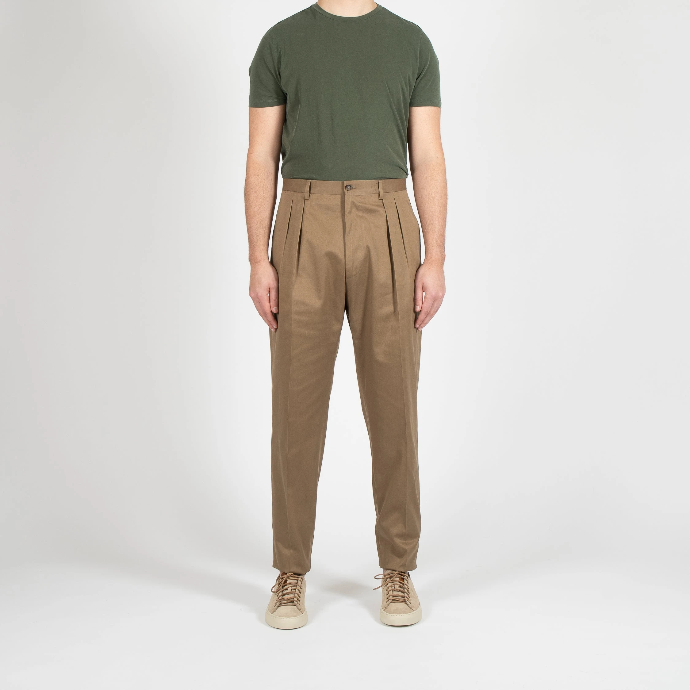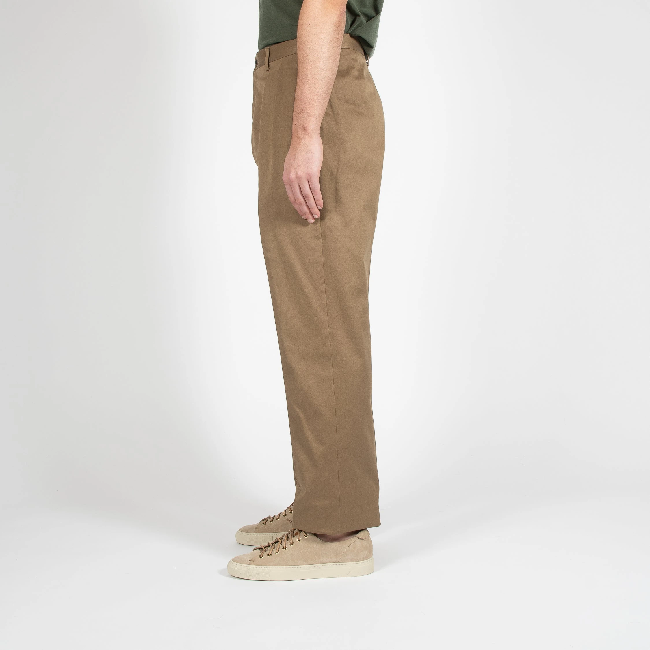 • Byxan är hög i midjan och har två frontveck på vardera ben. Byxan är bred över låren och avsmalnande ner till ett normalbrett fotslut. Byxan har en ficka på höger baksida och stängs med knappar.