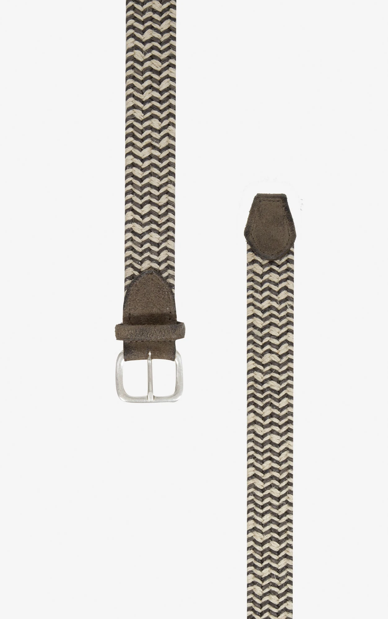 • Bältet är vävt och har ett silvrigt spänne. Bältet är vävt i bomull och läder.