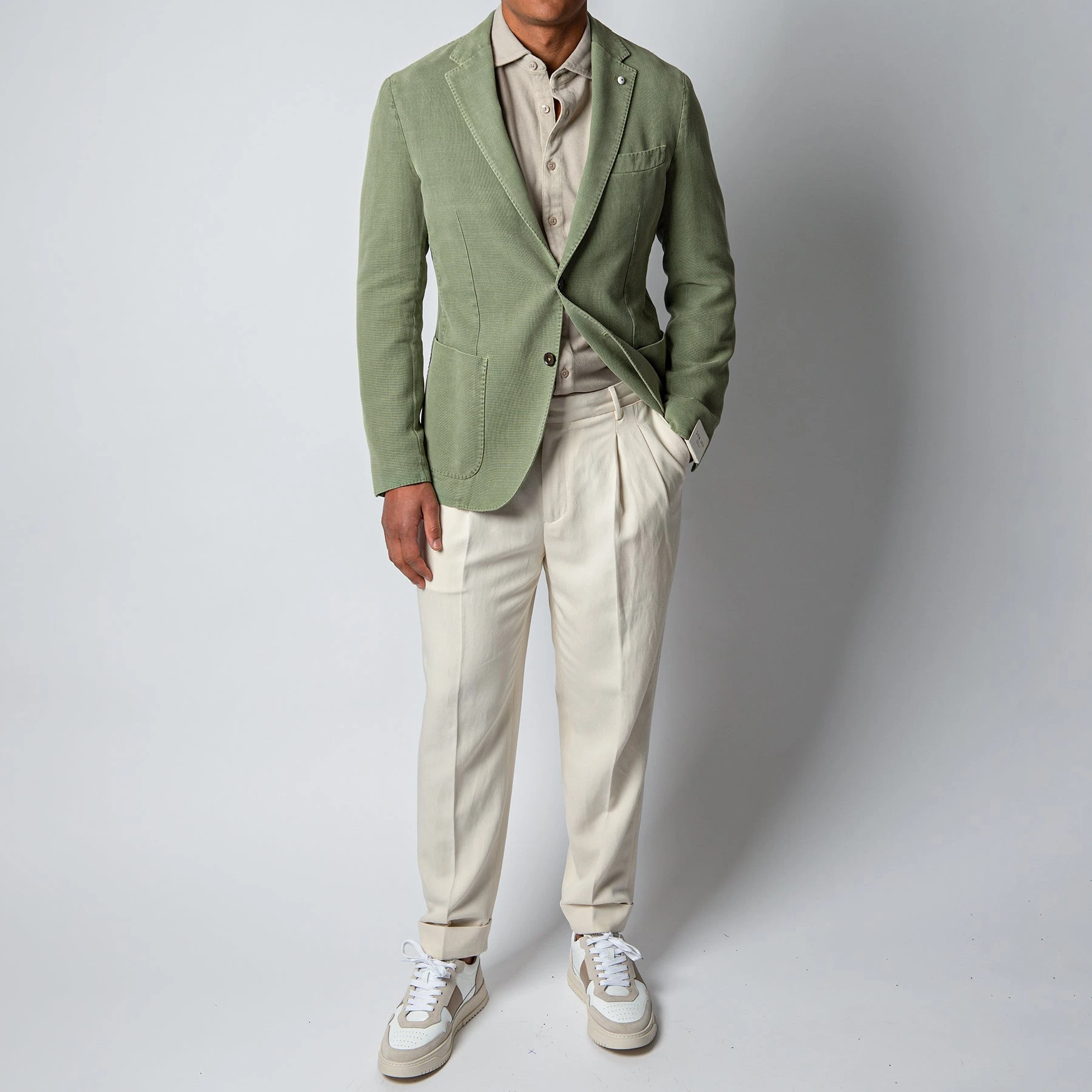 • Kavajen har normalbreda slag och stängs med en matchande pärlemoknapp. Kavajen har två stycken lappade sidfickor och har en bröstficka på vänster bröst. Kavajen har en svag struktur i tyget och är avslappnad i passformen.