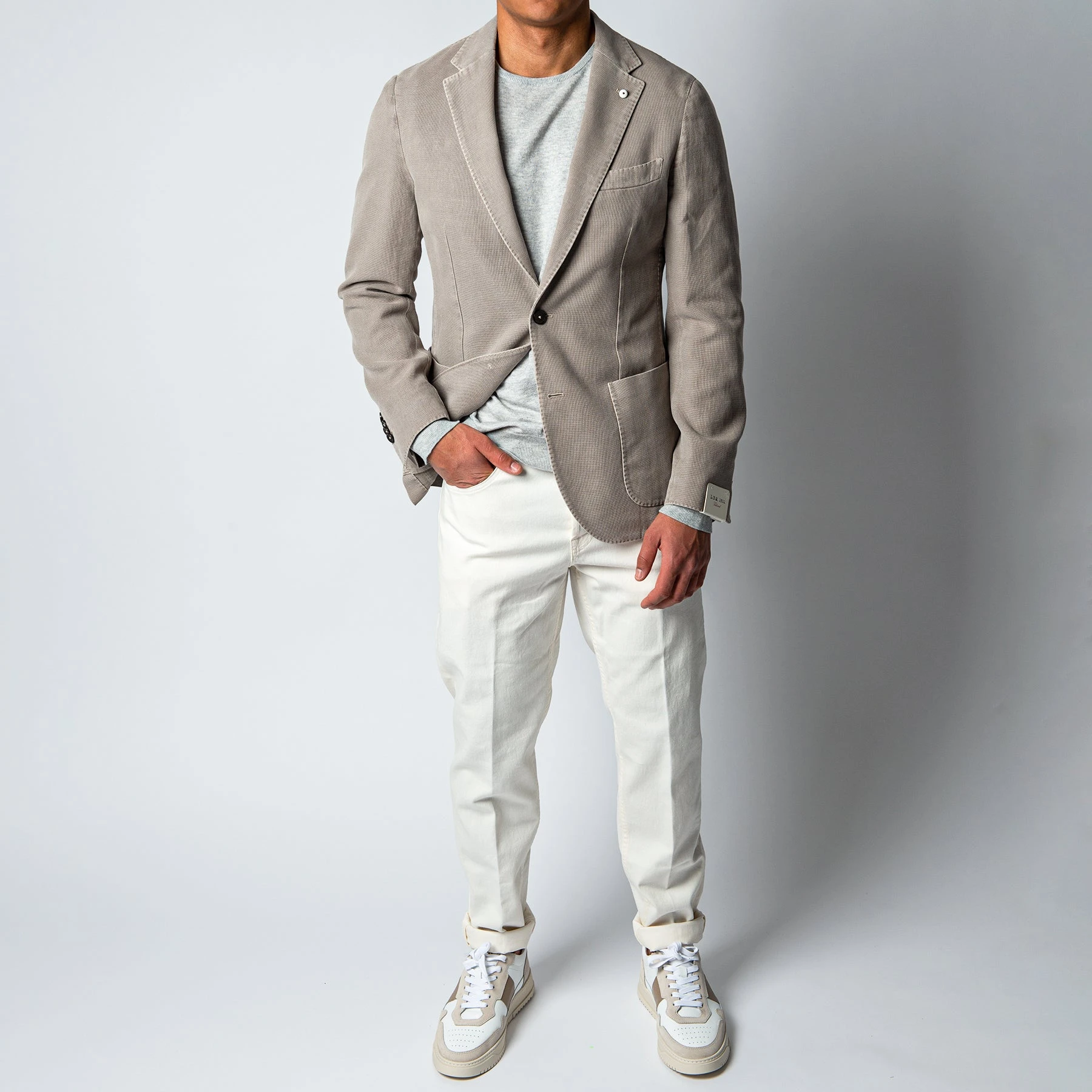 • Kavajen har normalbreda slag och stängs med en matchande pärlemoknapp. Kavajen har två stycken lappade sidfickor och har en bröstficka på vänster bröst. Kavajen har en svag struktur i tyget och är avslappnad i passformen.