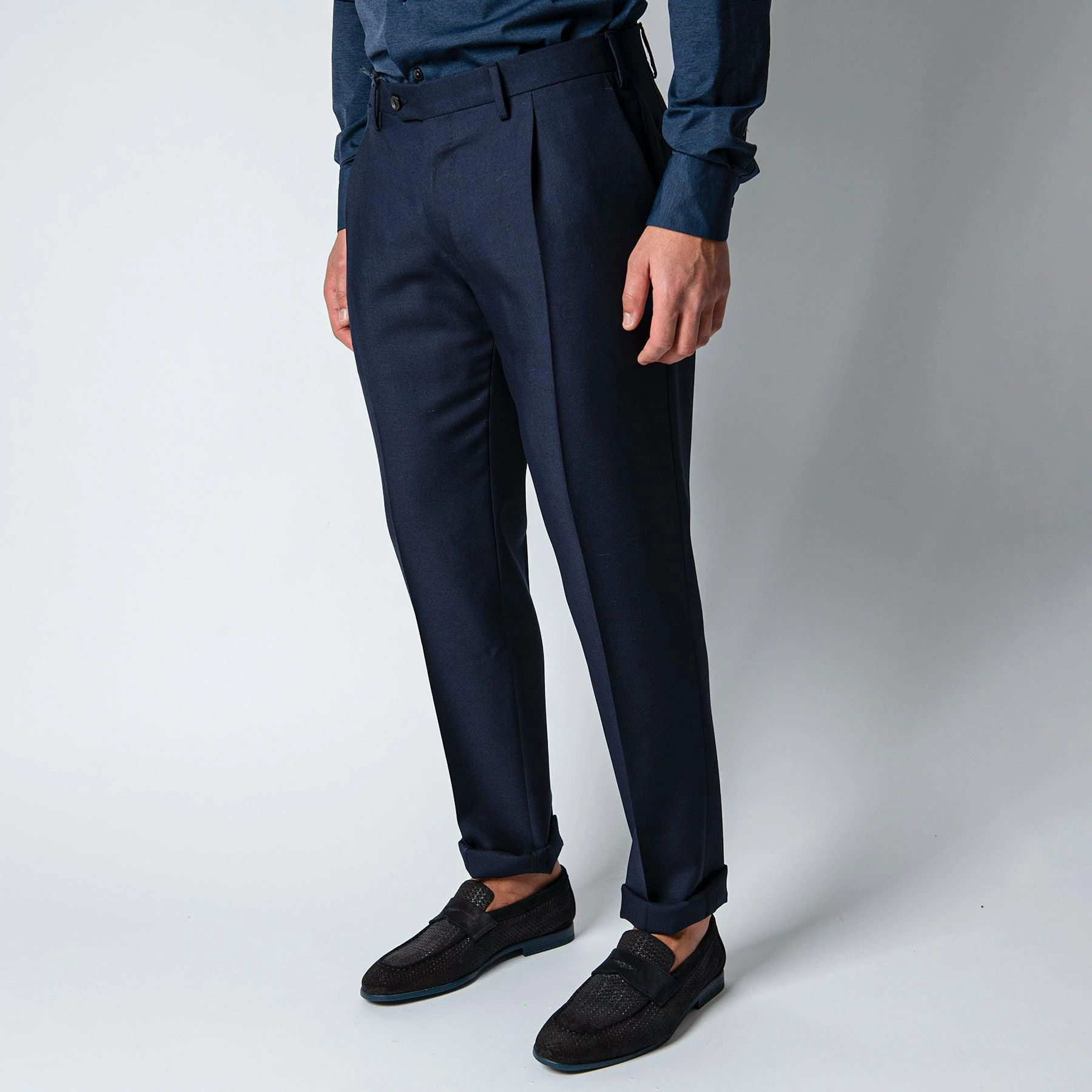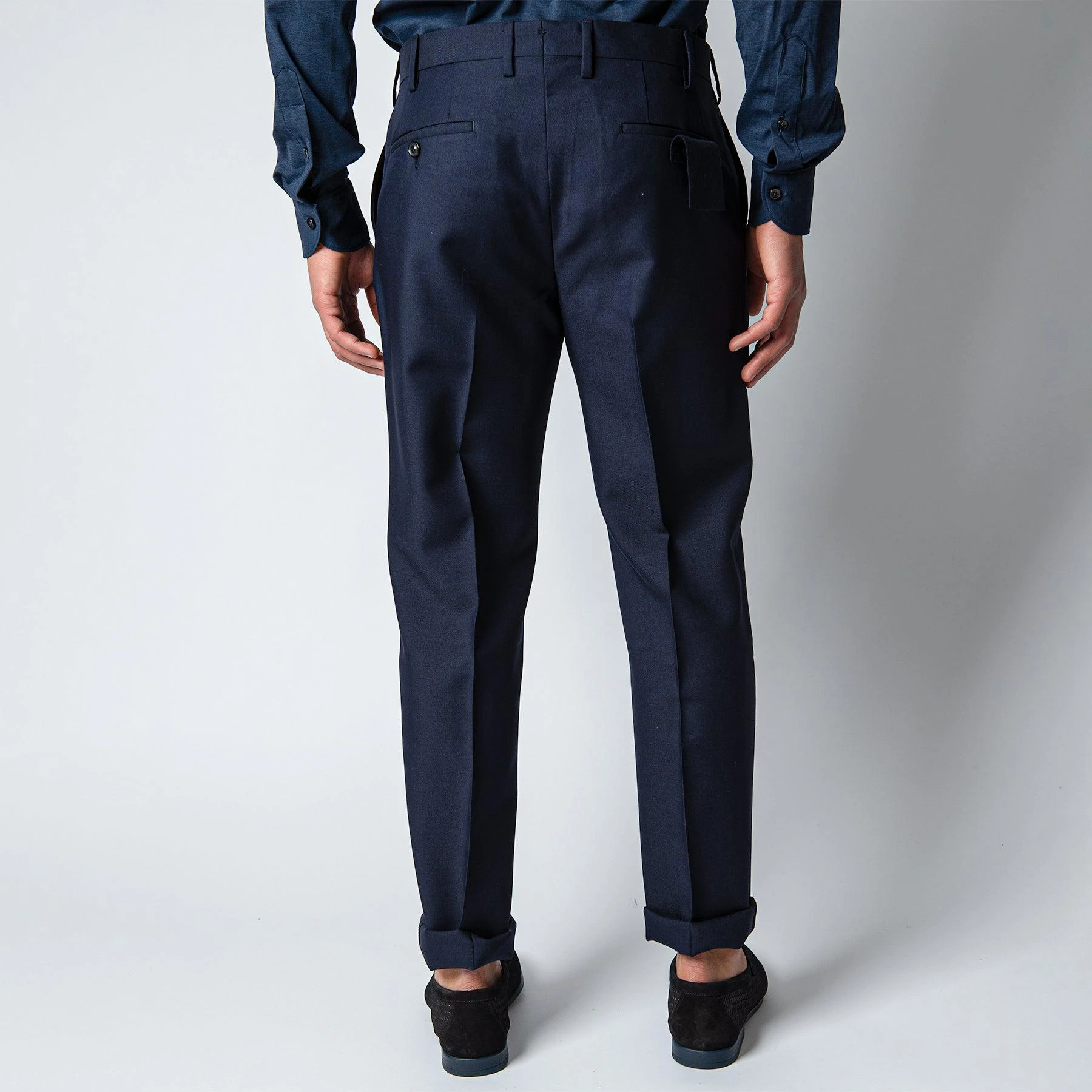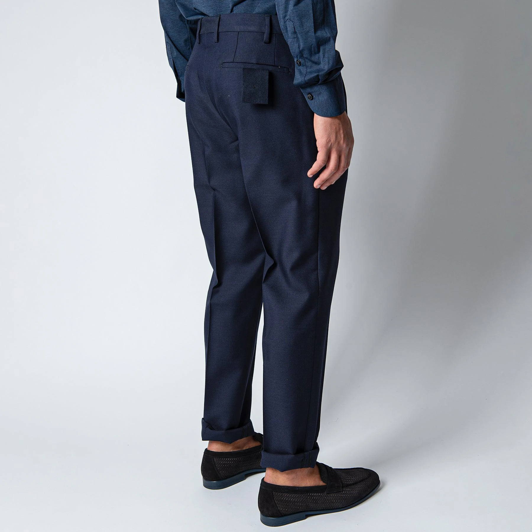 • Byxan är medelhög i midjan och stängs med knappar. Byxan har enkla frontveck och är succesivt avsmalnande ner till ett normalbrett frotslut.