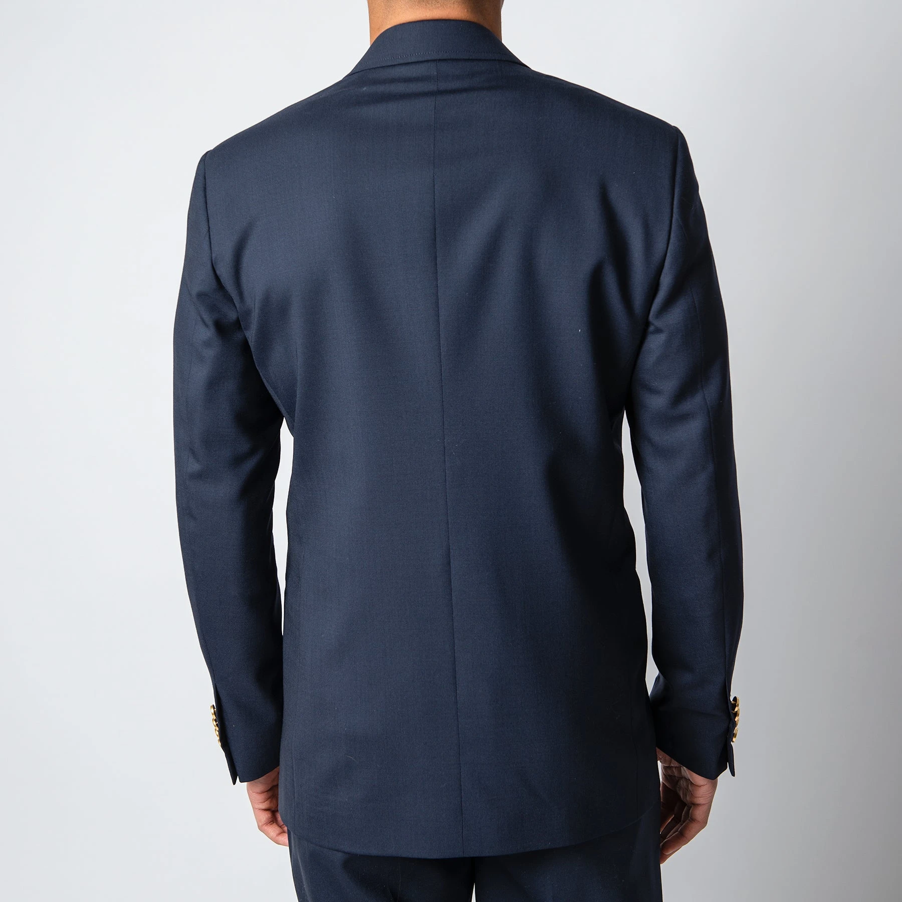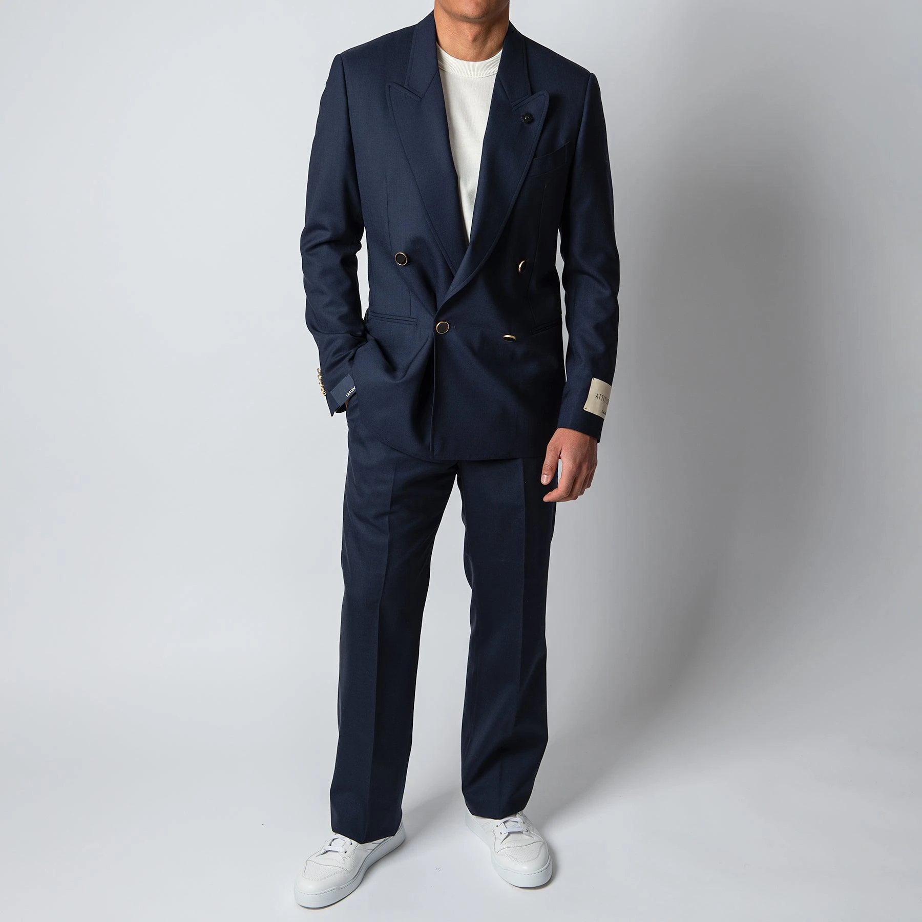 • Kavajen stängs med guldiga knappar och har en bred lapel. Kavajen har en svagt lägre knäppning och är svagt vadderad i axeln.