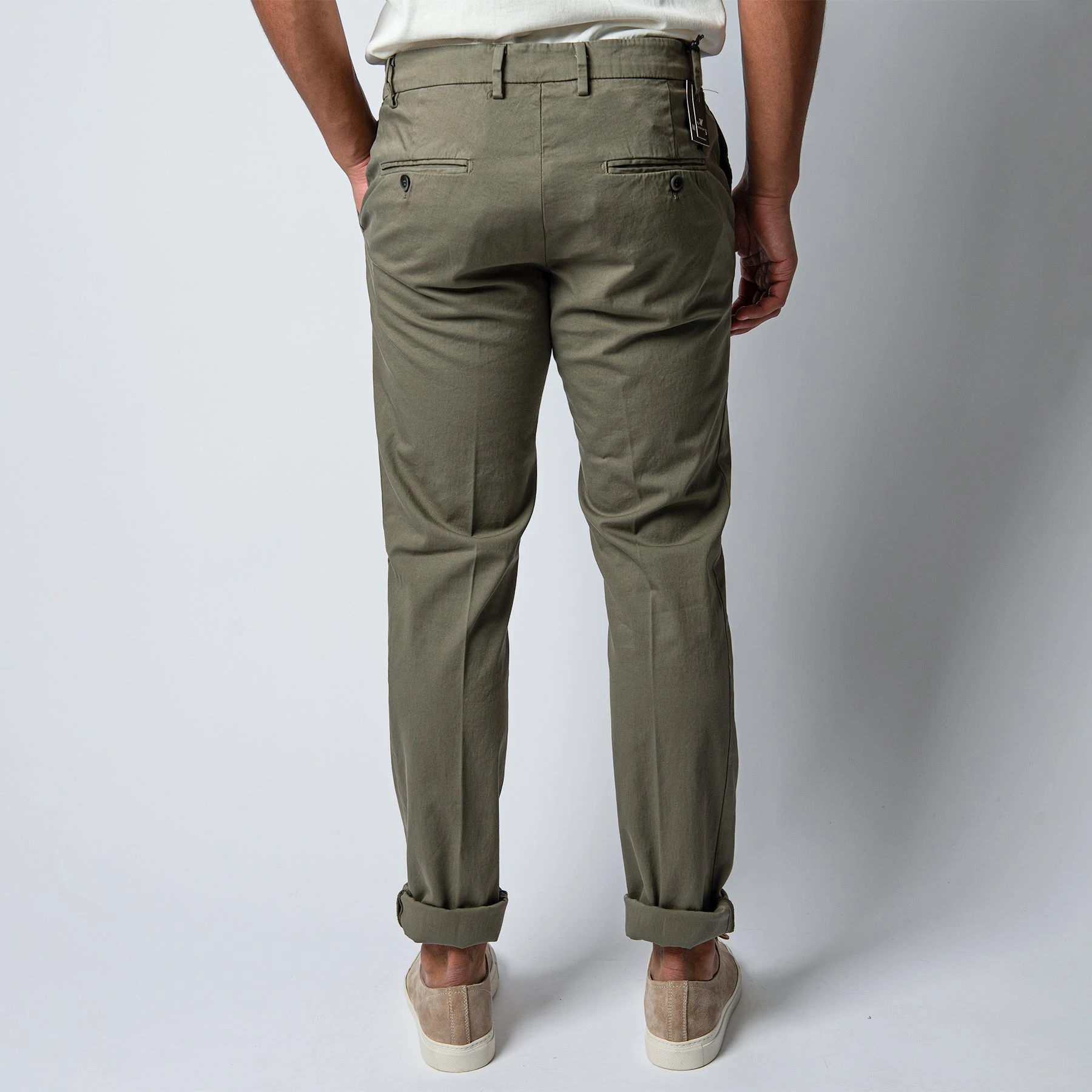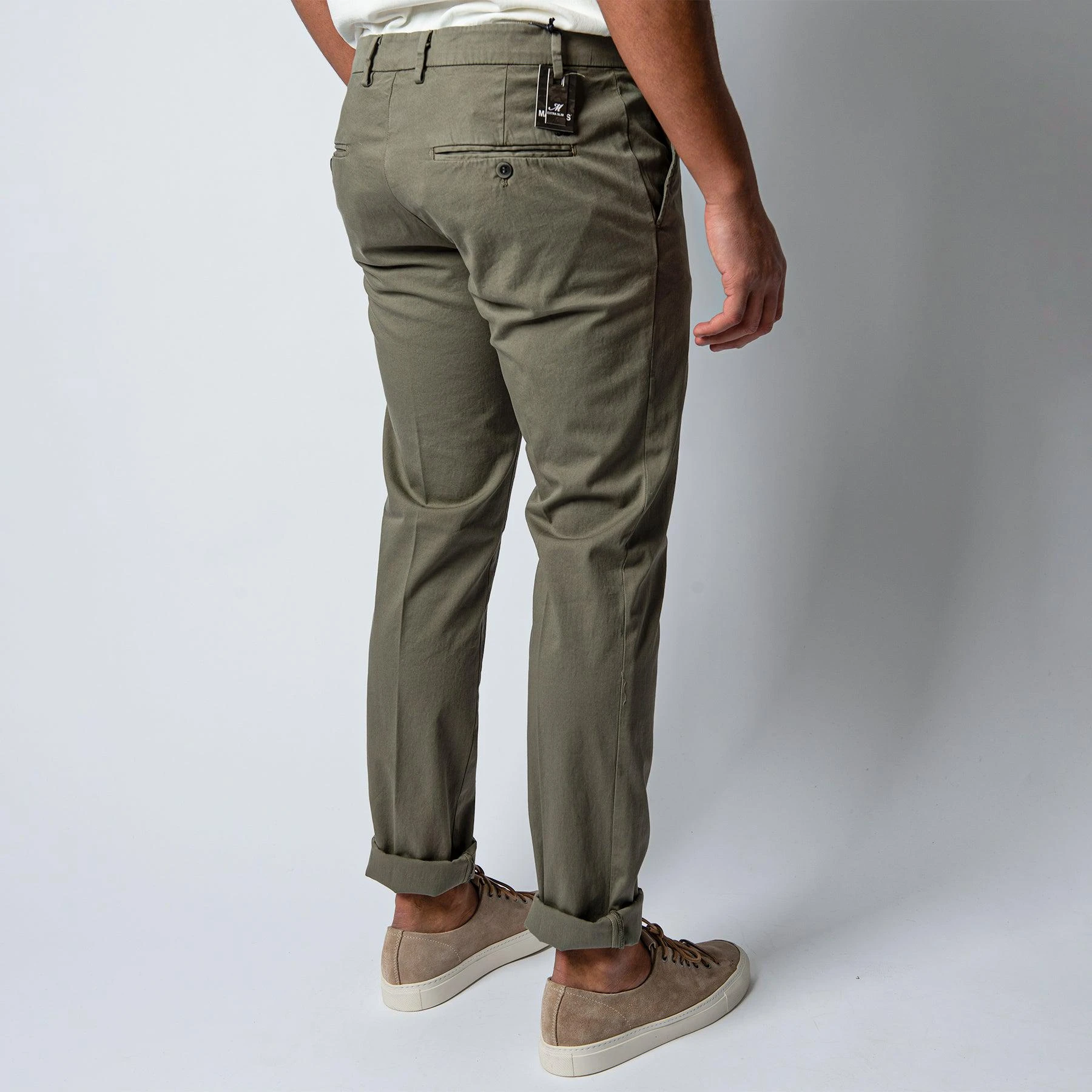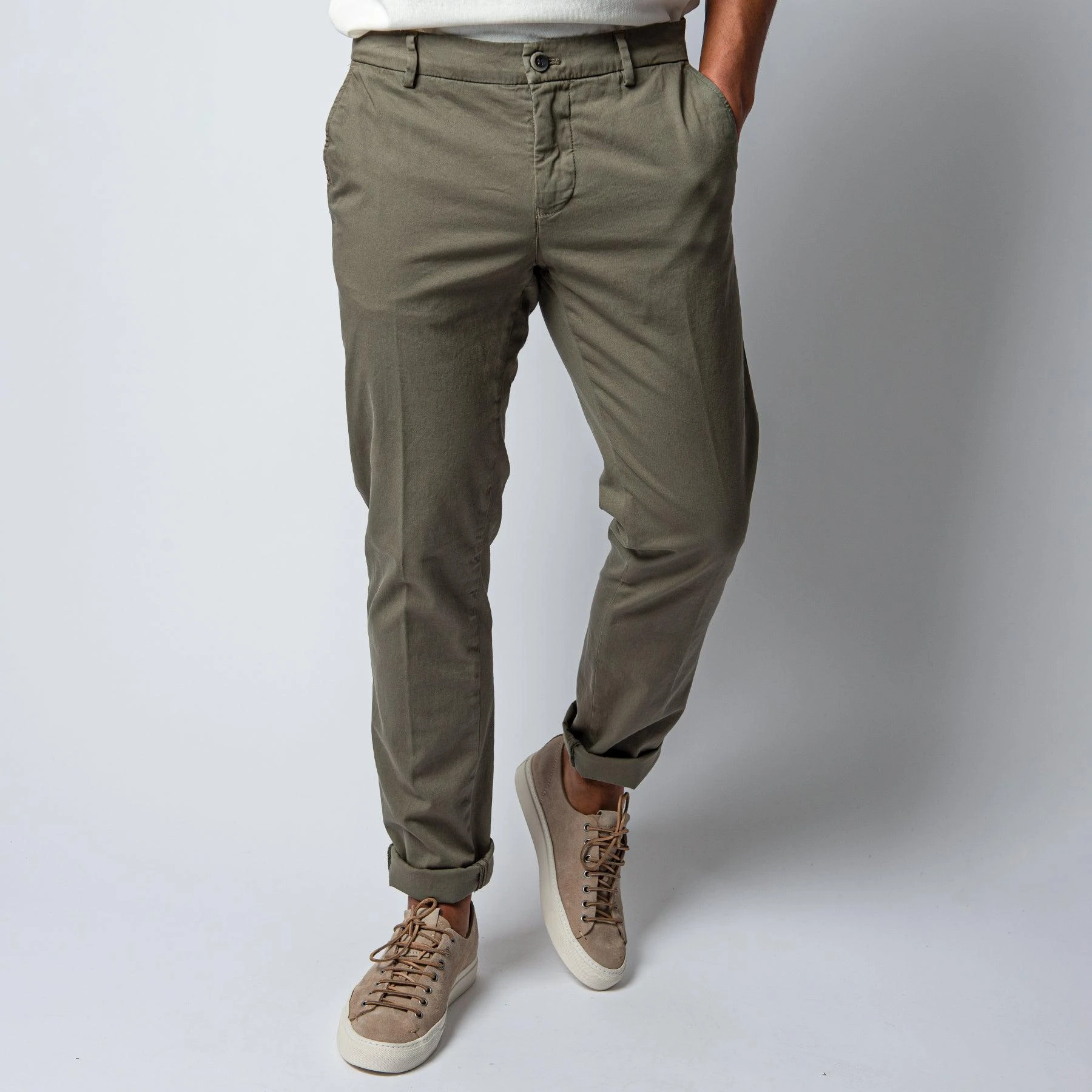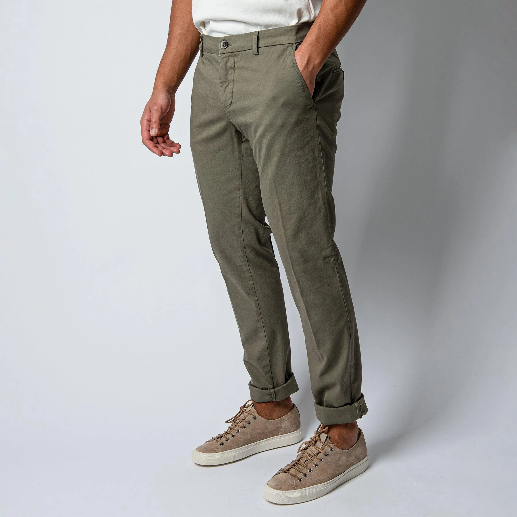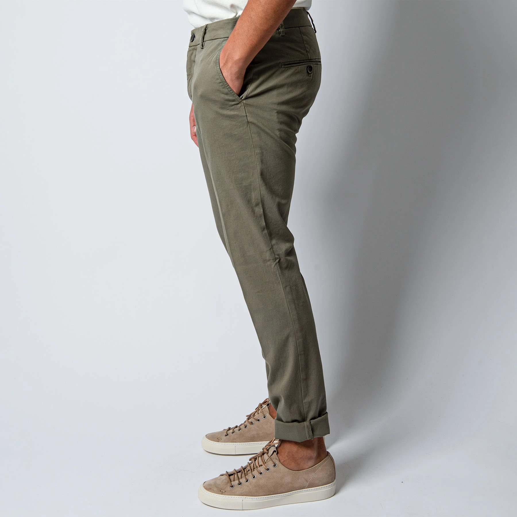 • Chinosbyxan är smal i passformen och medelhög i midjan. Byxan har två stycken snedställda sidofickor och två stycken bakfickor som stängs med knapp.