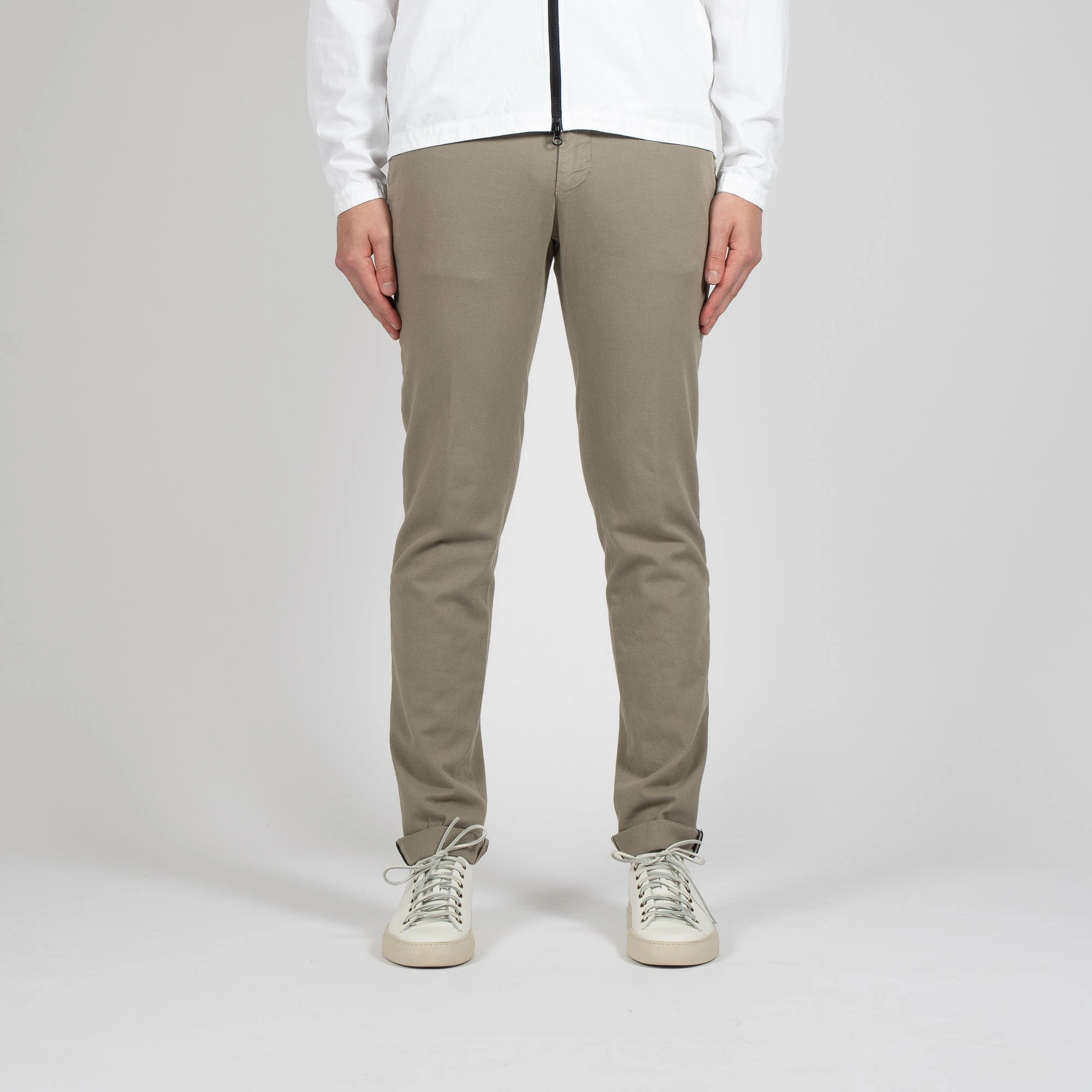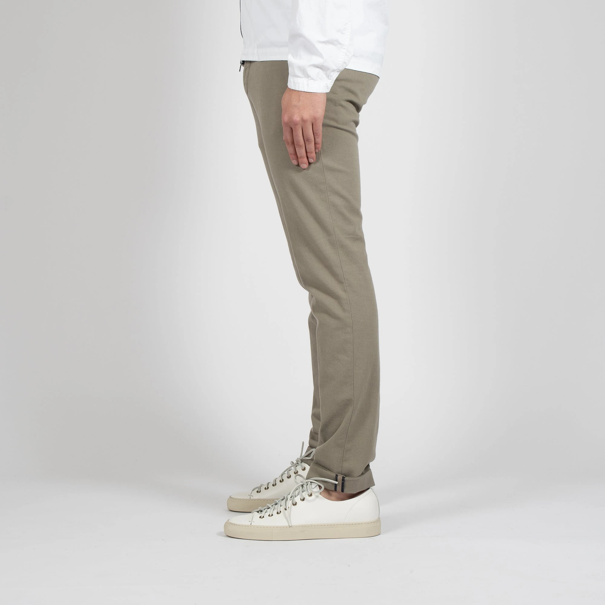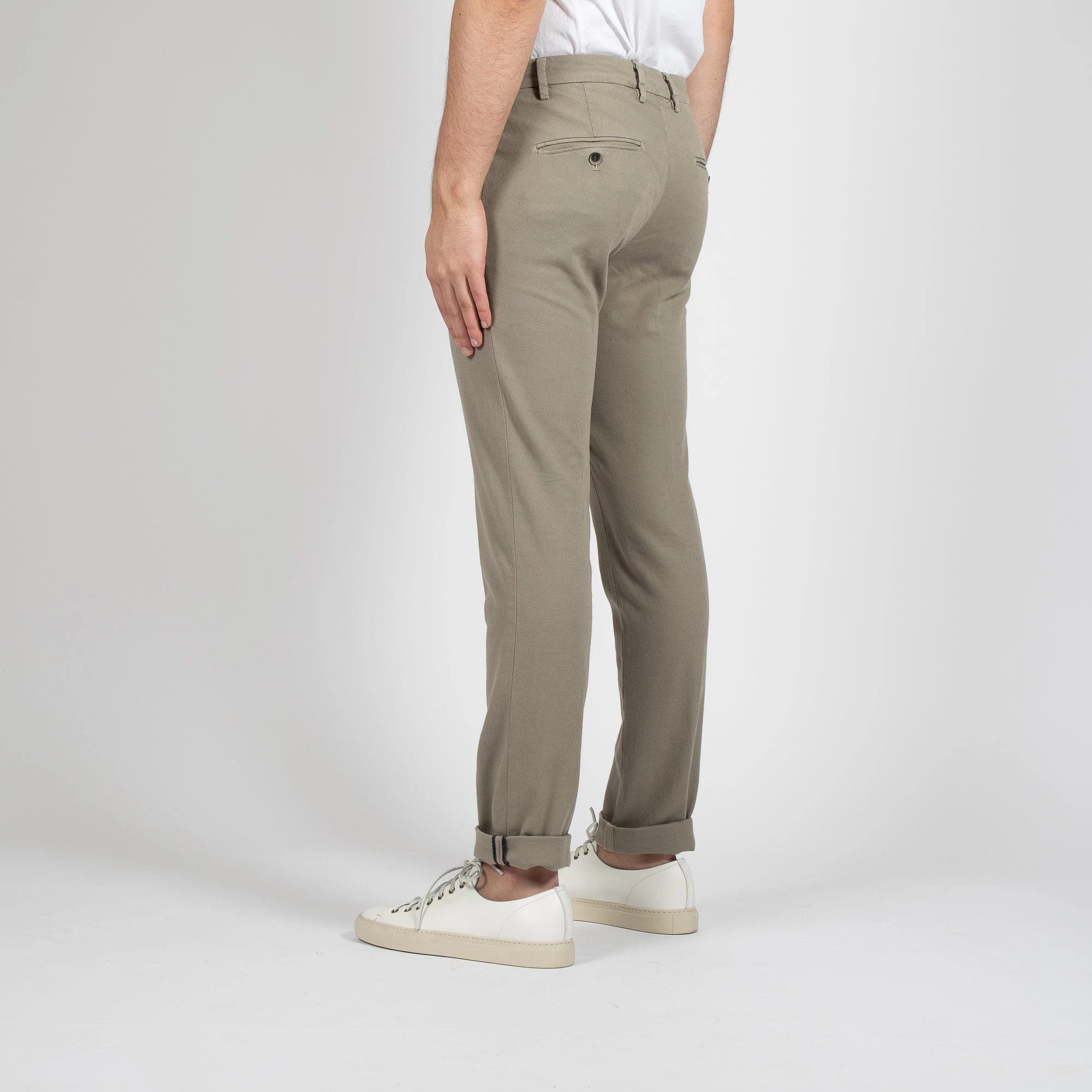 • Chinosbyxan är medelhög i midjan och smal i passformen. Byxan har två stycken snedställda sidofickor samt 2 stycken bakfickor som stängs med knapp.