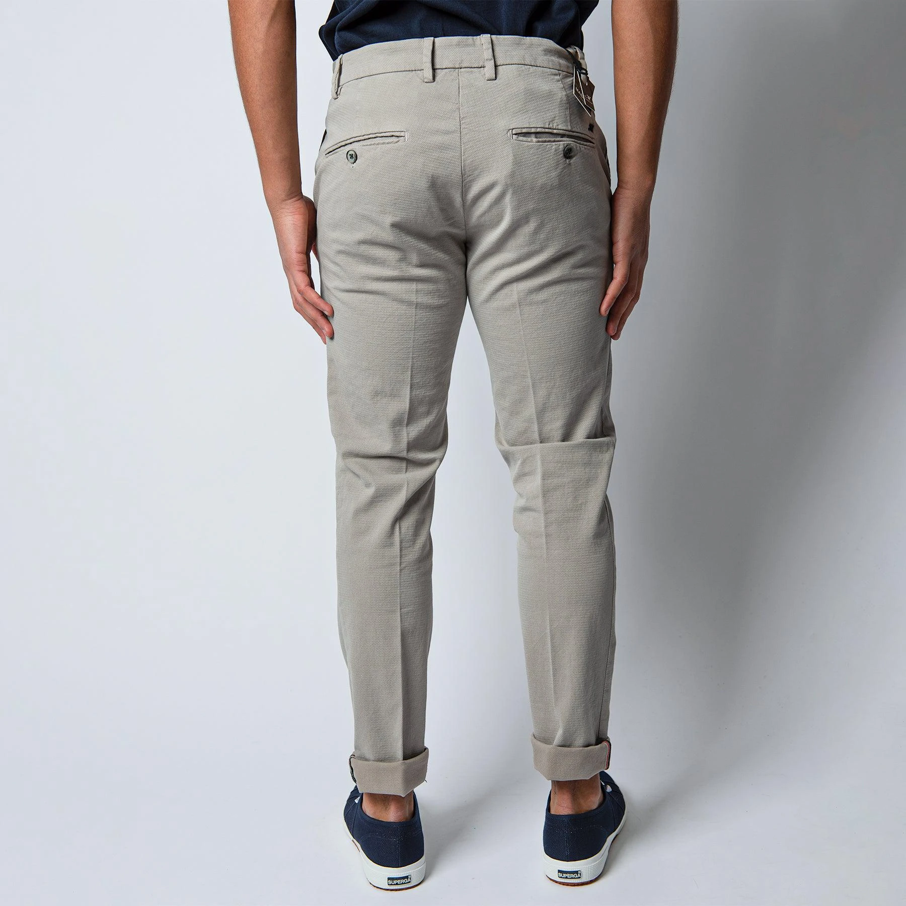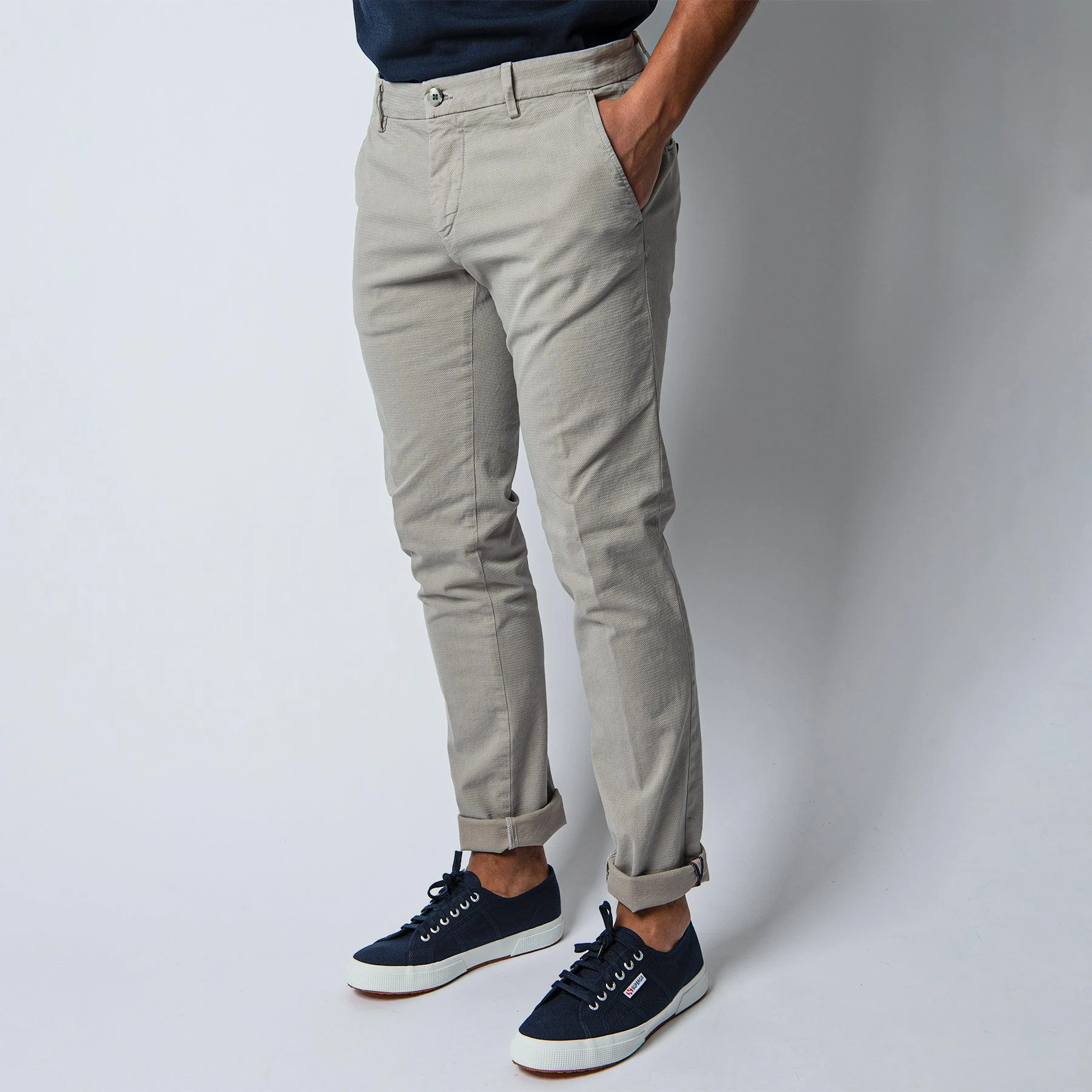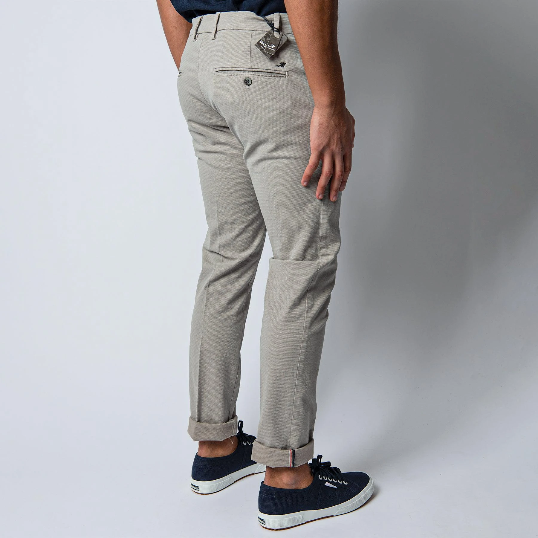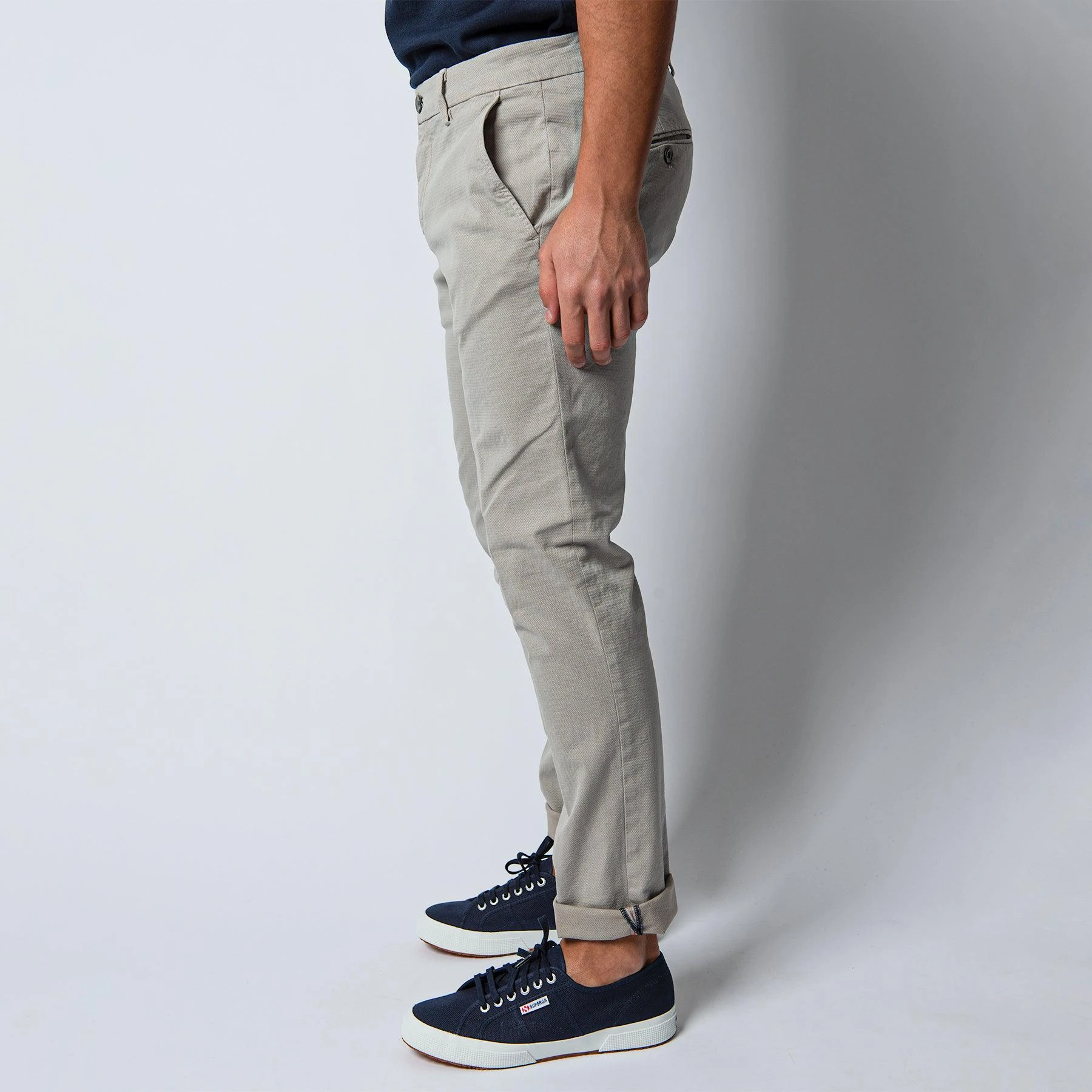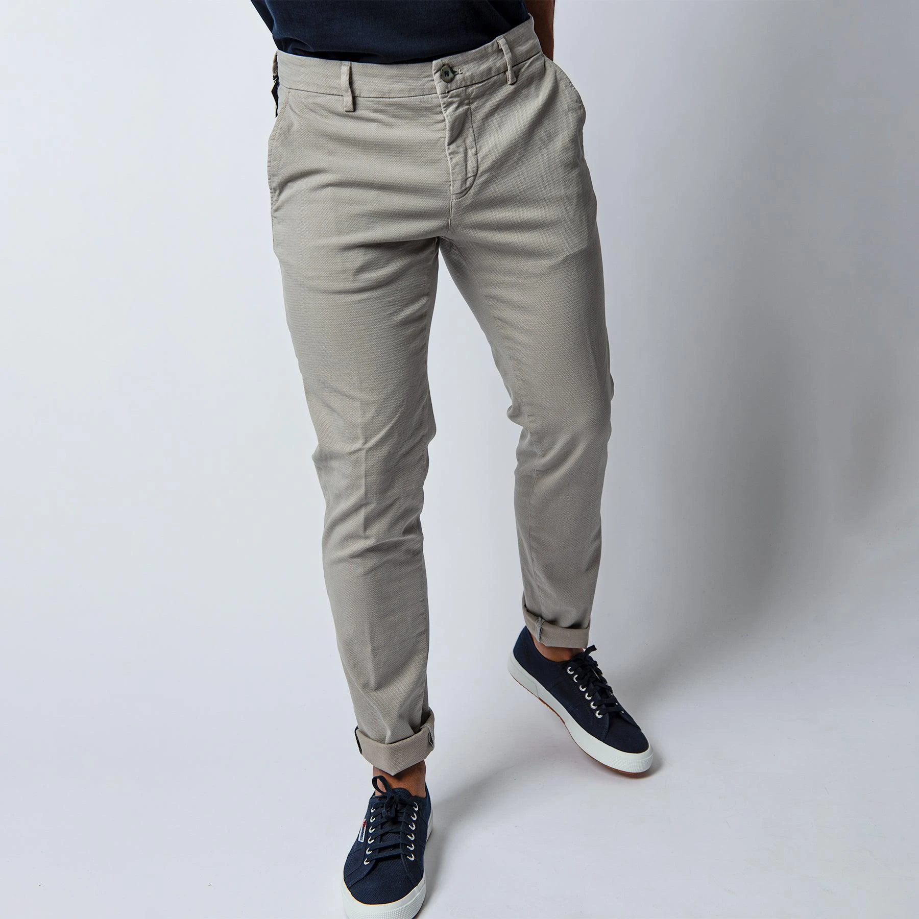 • Byxan är medelhög i midjan och slimmad i modellen. Byxan stängs med knappar och dragkedja och har ett strukturerat tyg. Byxan har två stycken snedställda sidofickor och två bakfickor.
