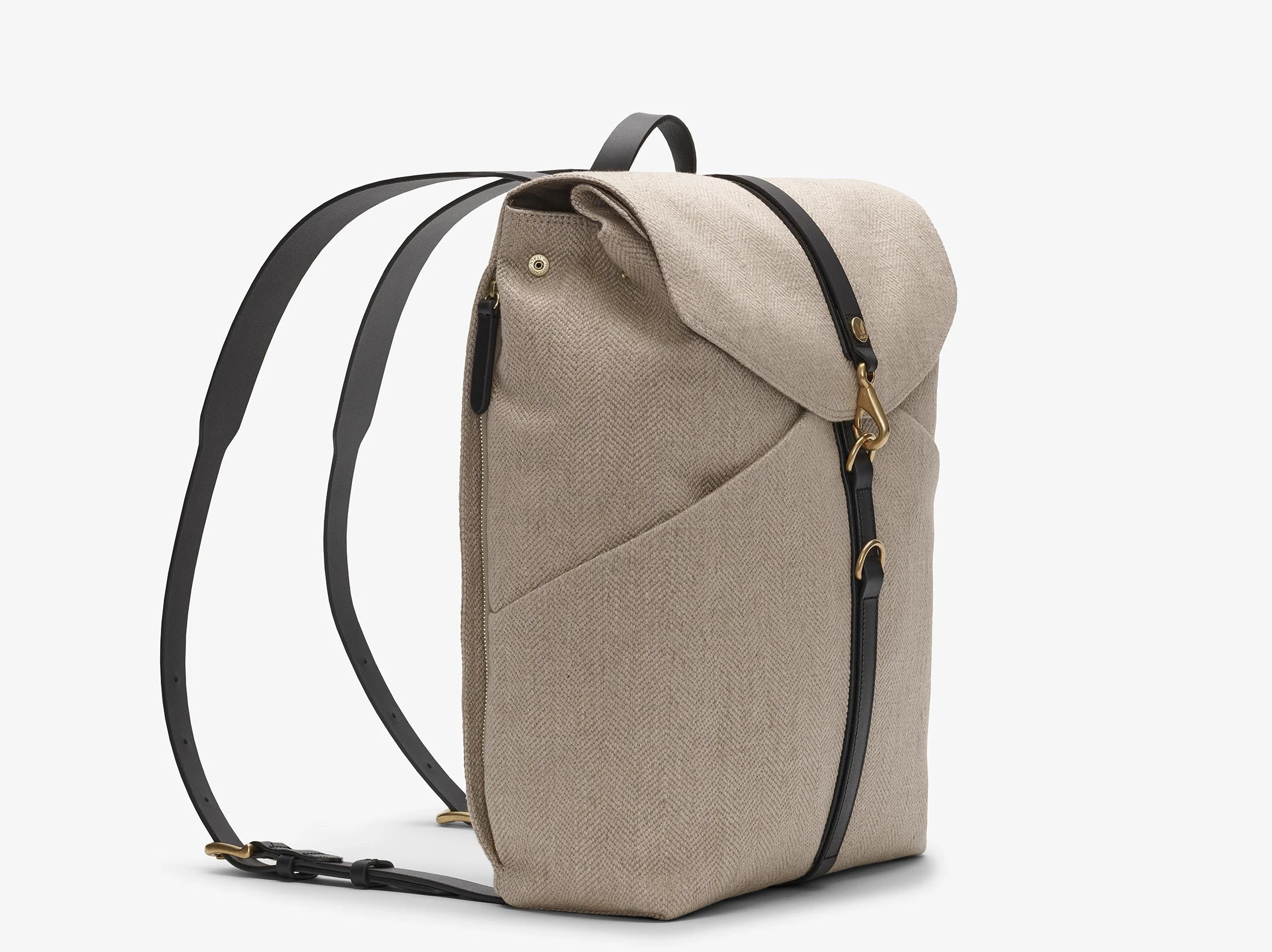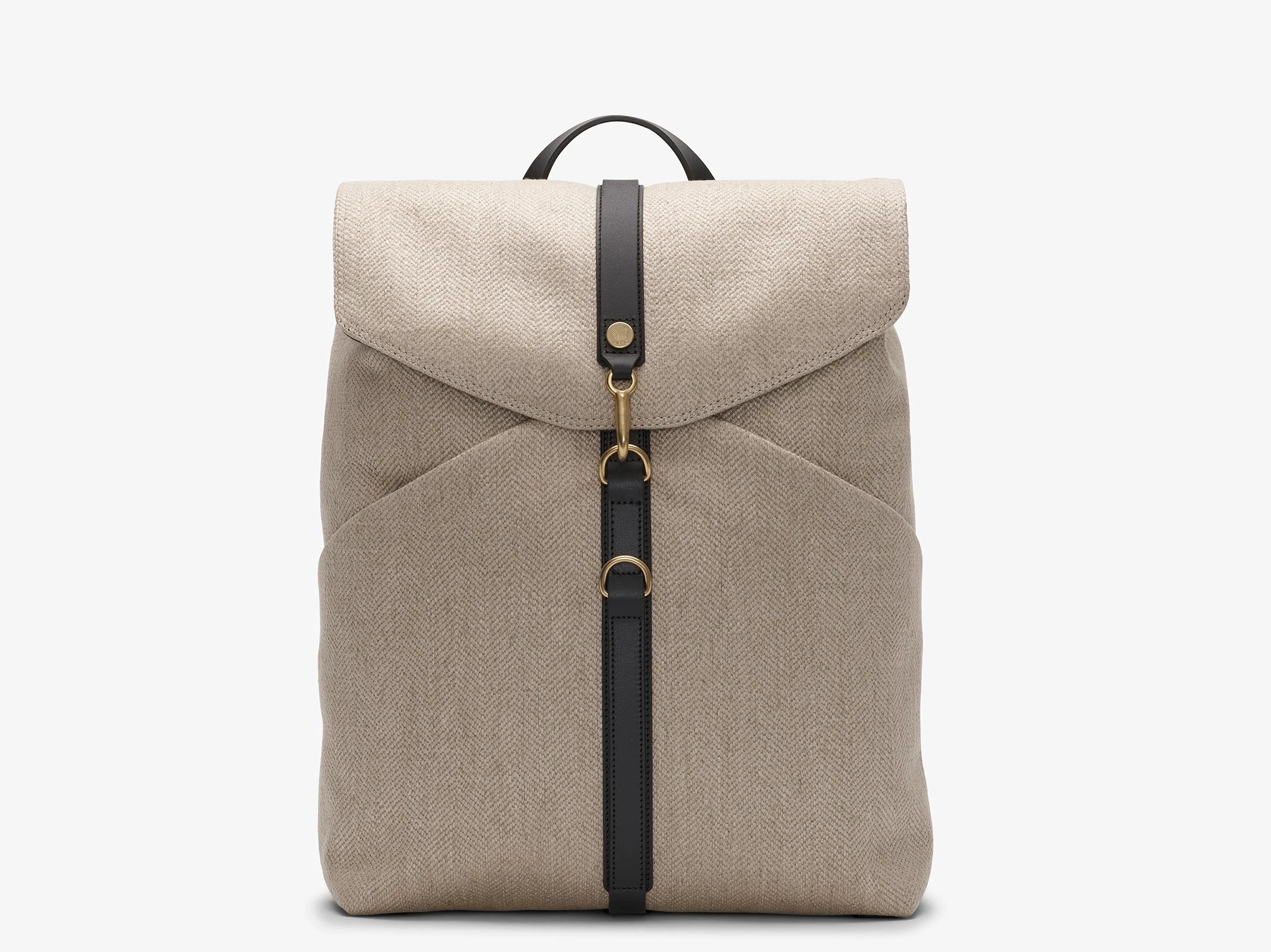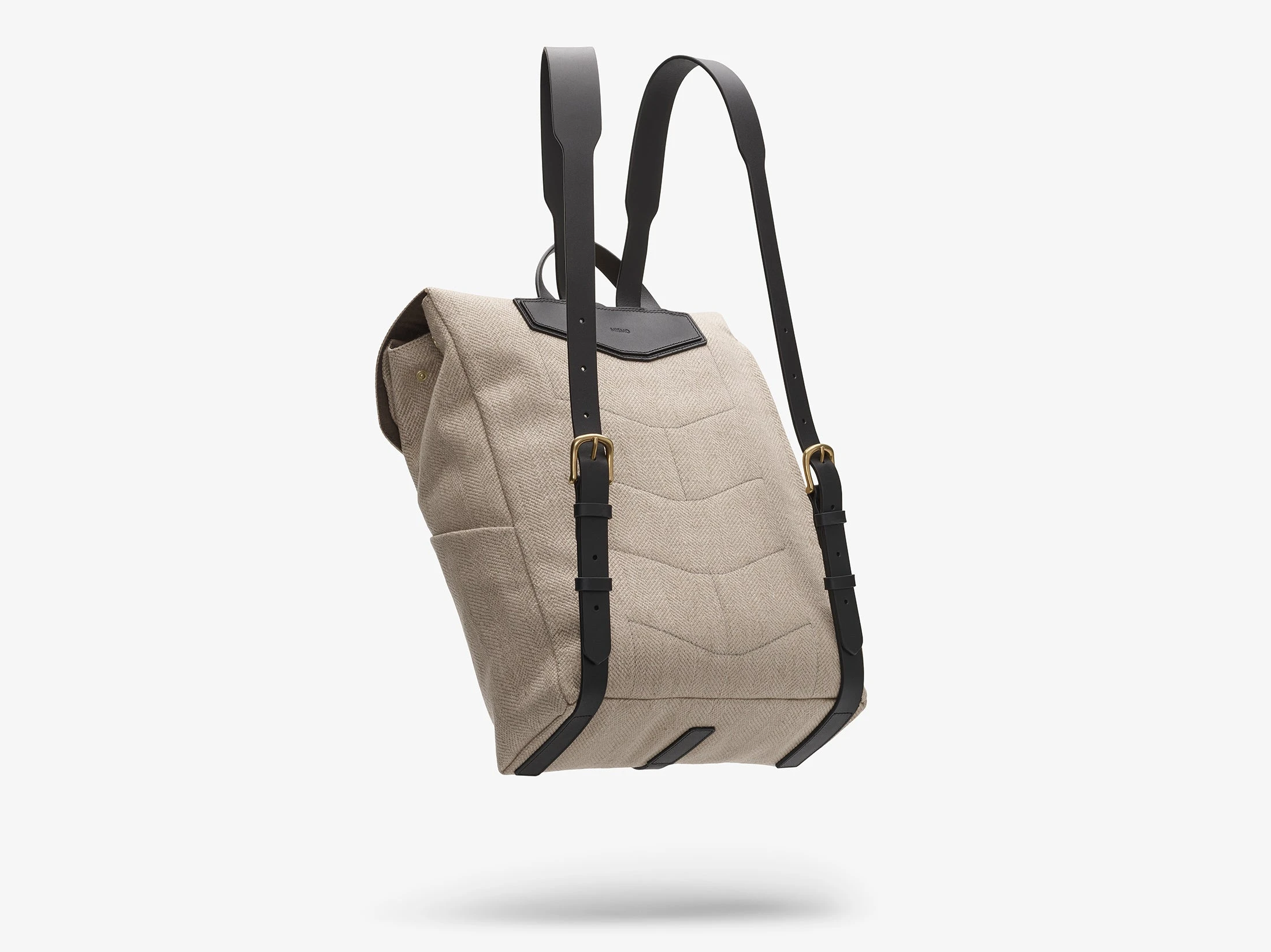 • Ryggsäcken är sydd i en bomulls-kanvas med läder detaljer och har ett fiskbensmönstrat tyg.