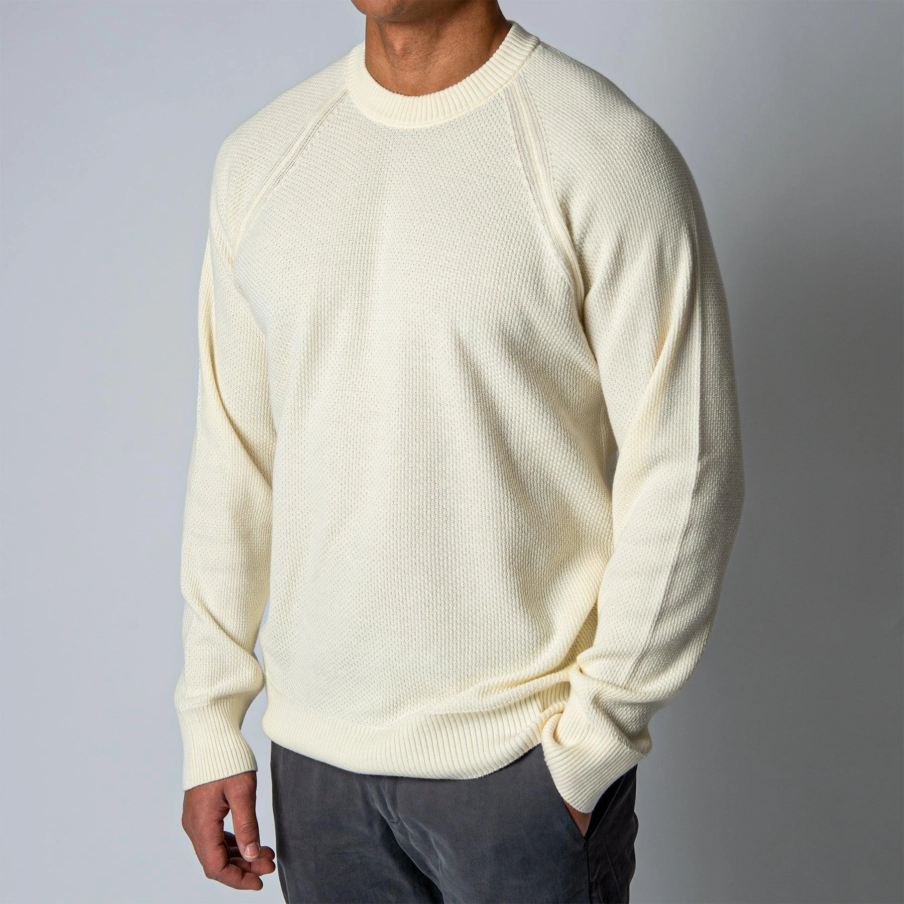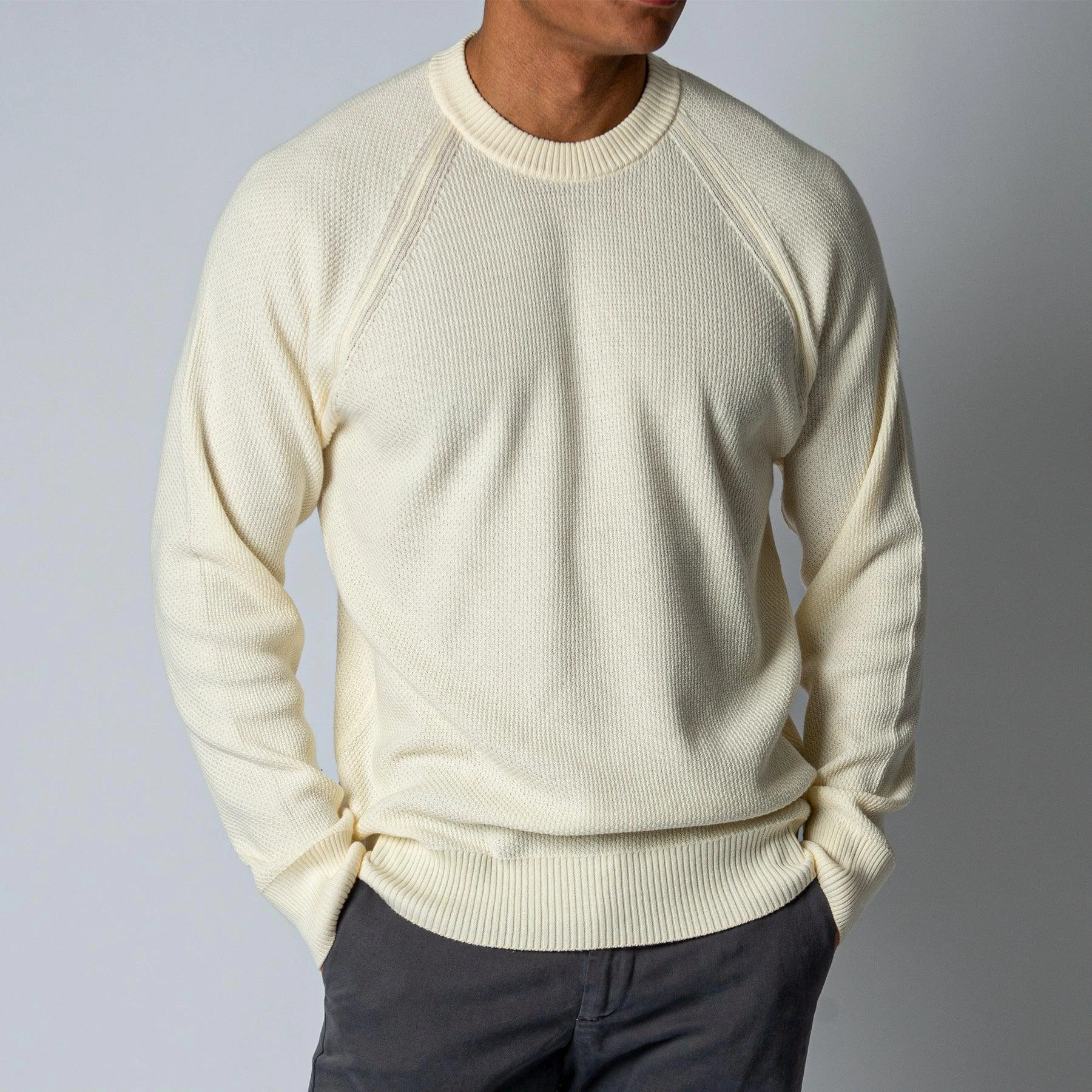 • Tröjan har en klassisk crewneck krage och har normalt åtsittande muddar vid ärm- samt plaggslut. Tröjan har en raglanaxel och är svagt boxig över kroppen.