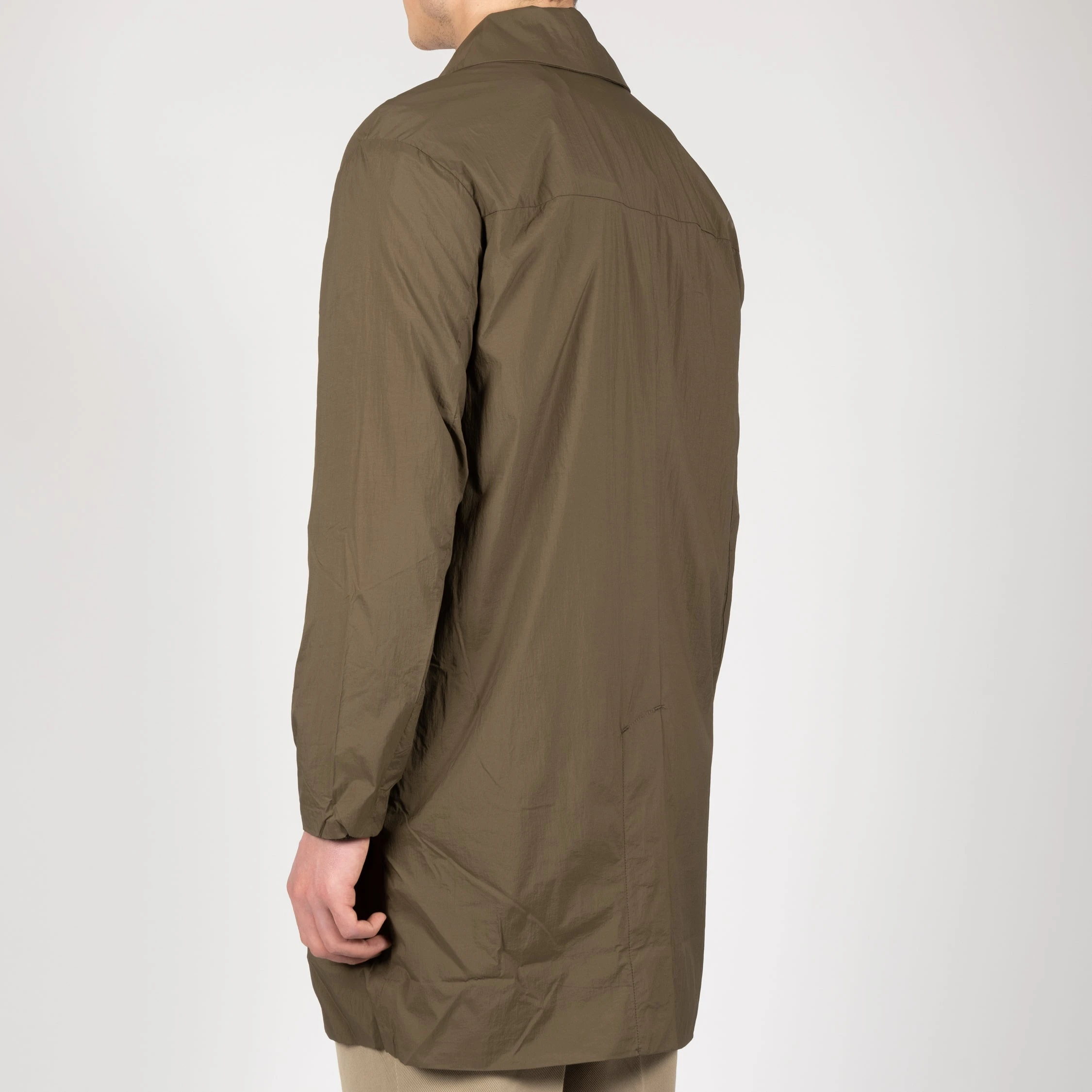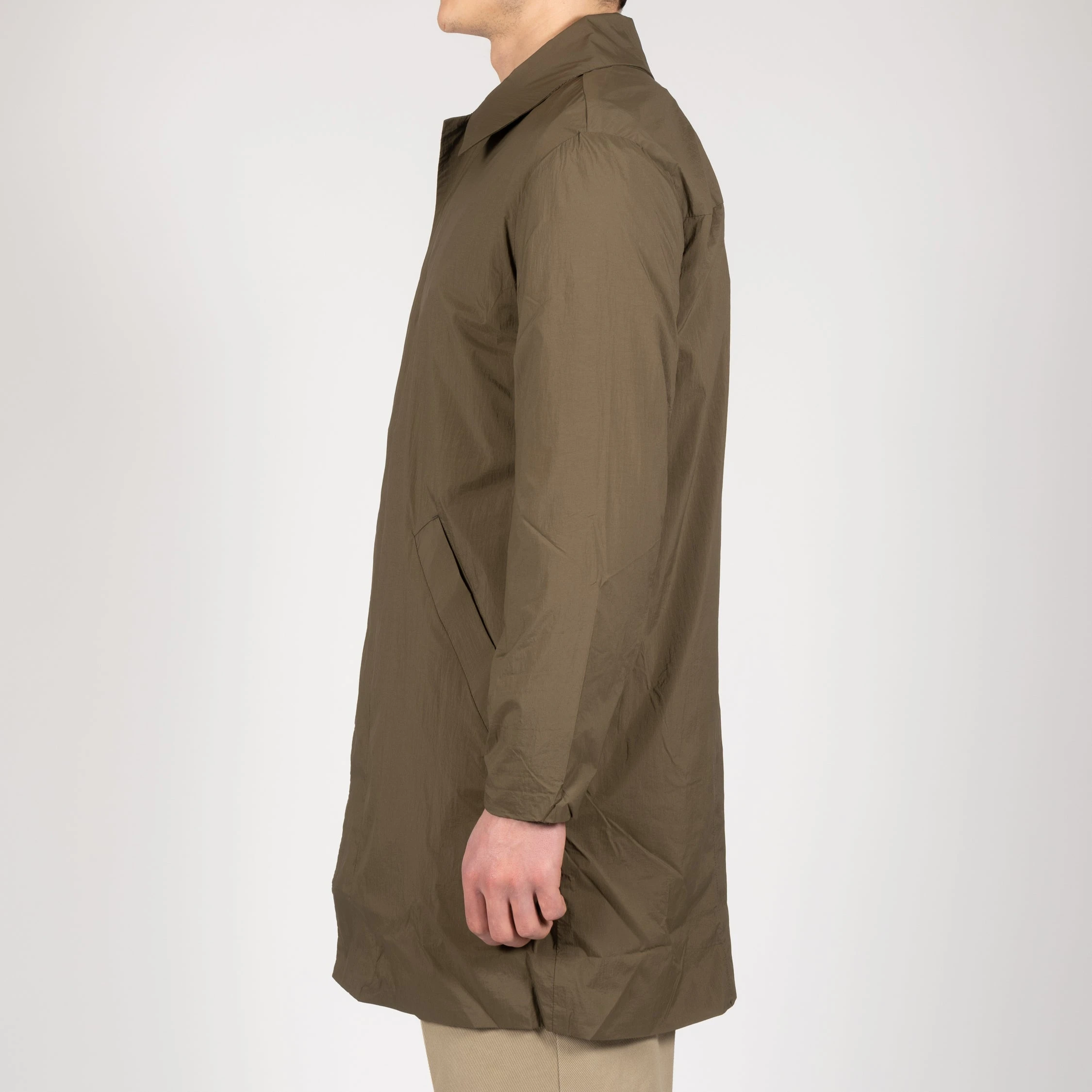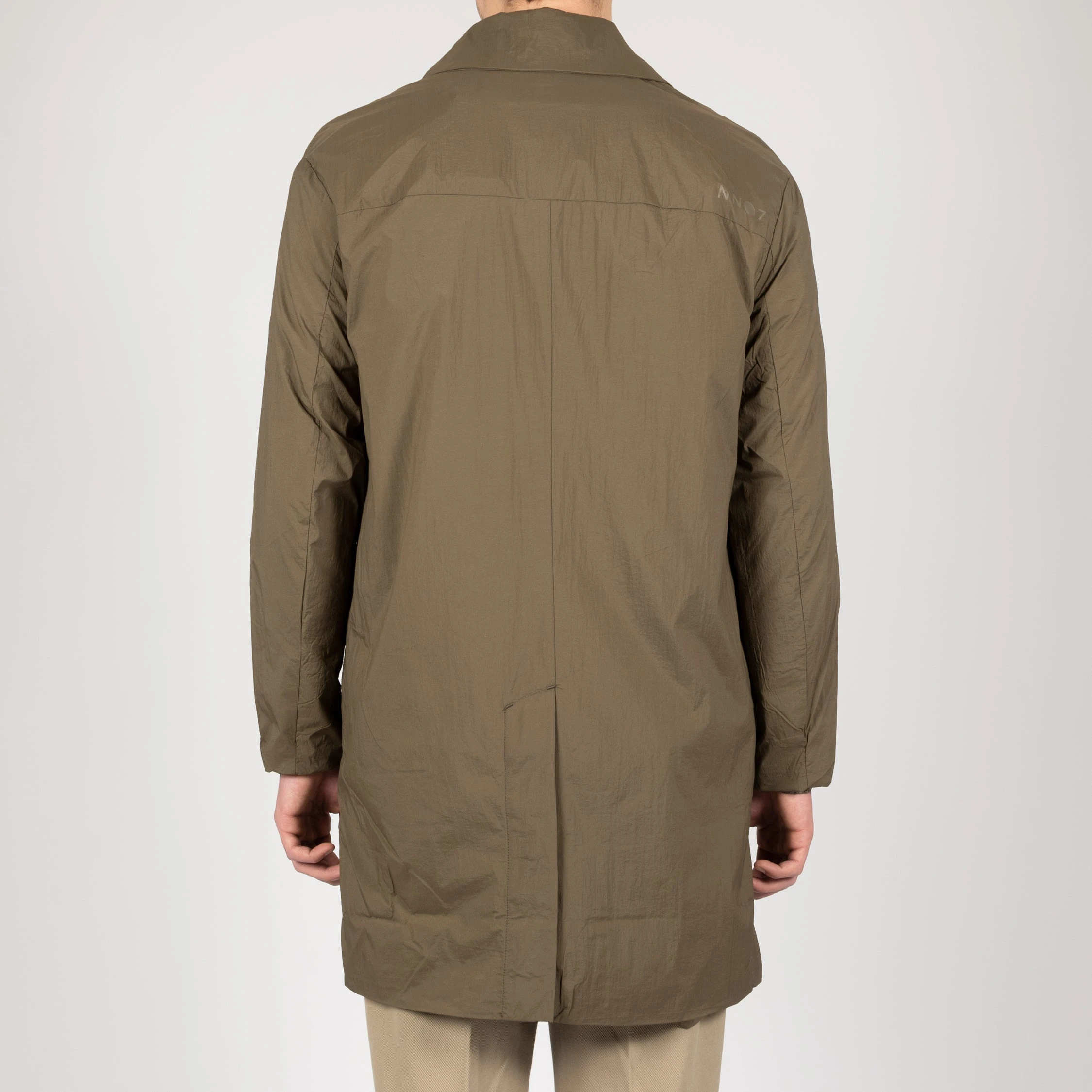 • Rocken stängs med en dold knäppning och har två stycken sidofickor. Rocken har en skjortkrage och märkets logotyp på höger axel. Rocken är lång och svagt skrynklig i tyget för att ge en avslappnad look.
