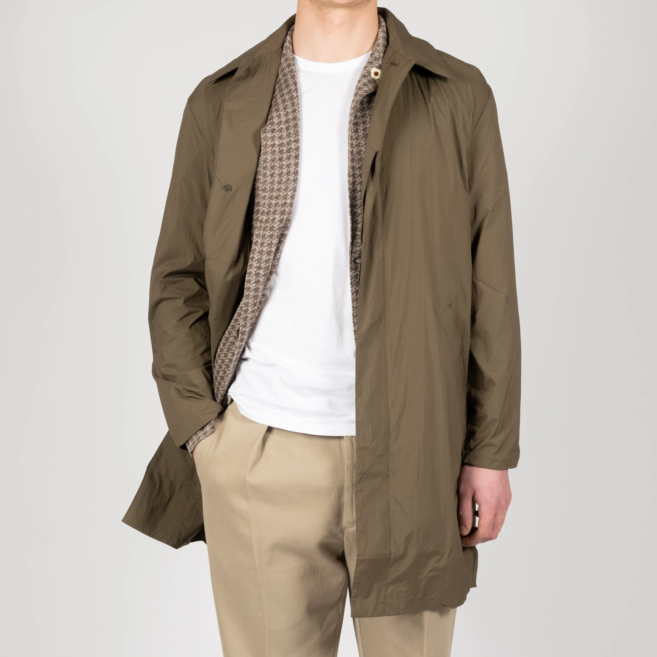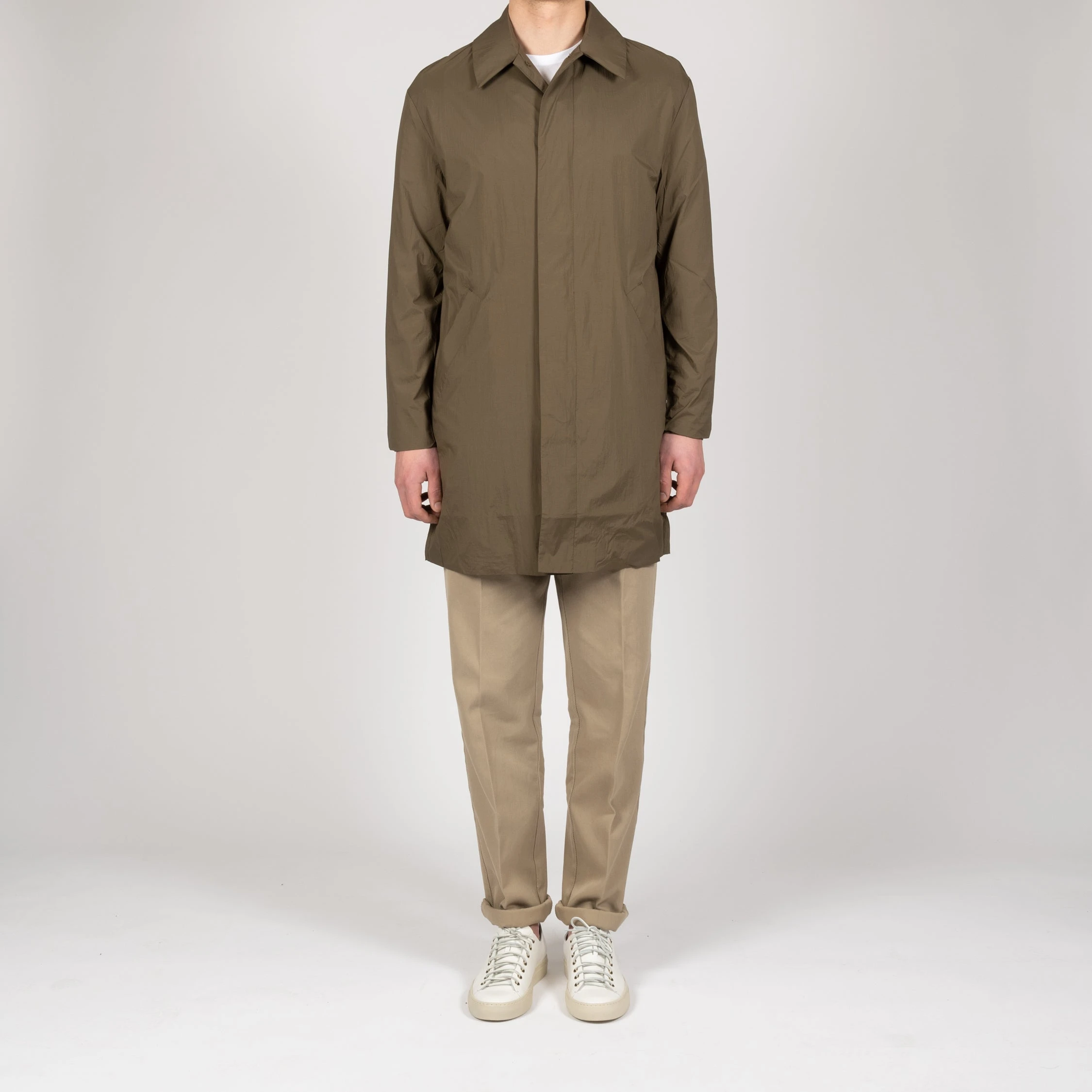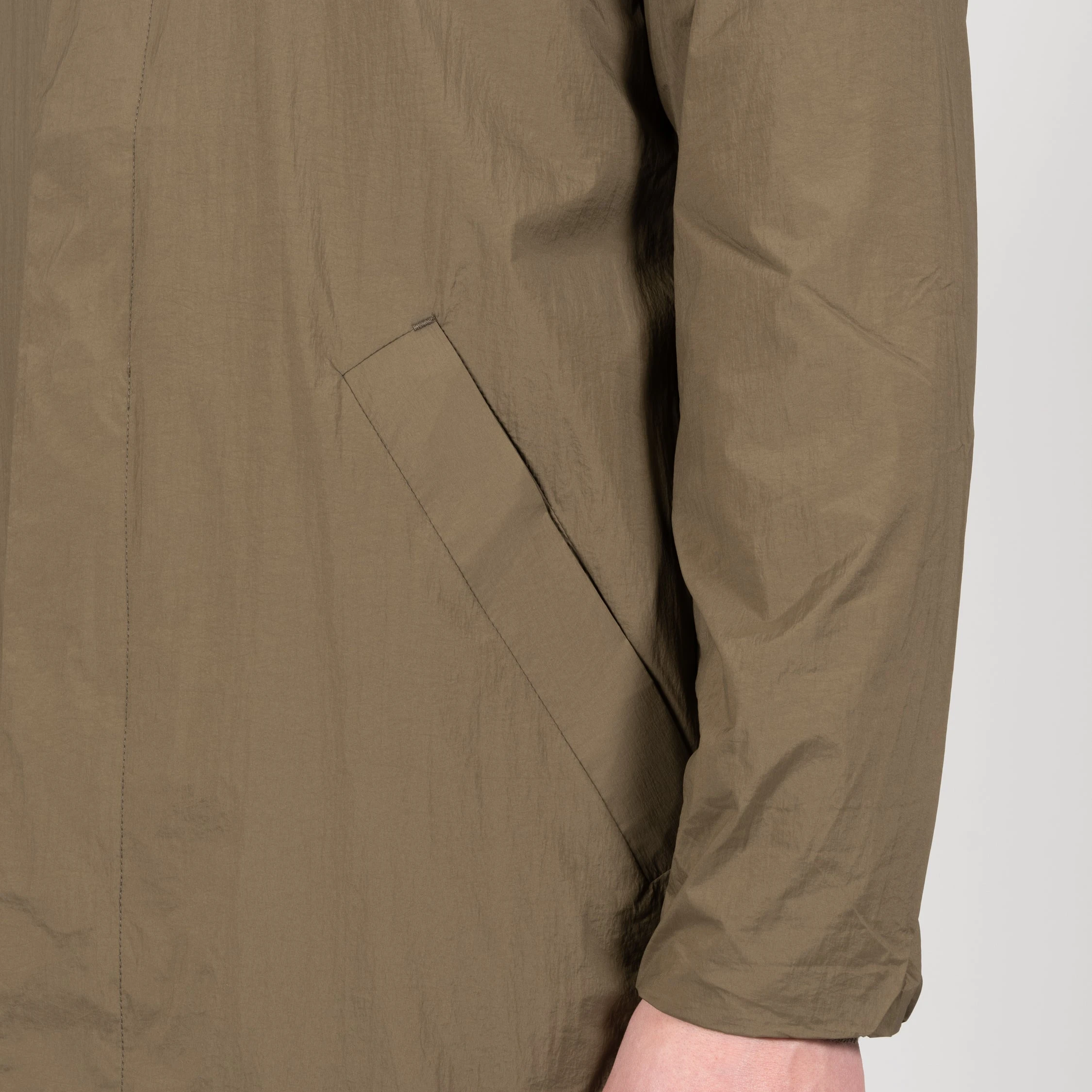 • Rocken stängs med en dold knäppning och har två stycken sidofickor. Rocken har en skjortkrage och märkets logotyp på höger axel. Rocken är lång och svagt skrynklig i tyget för att ge en avslappnad look.