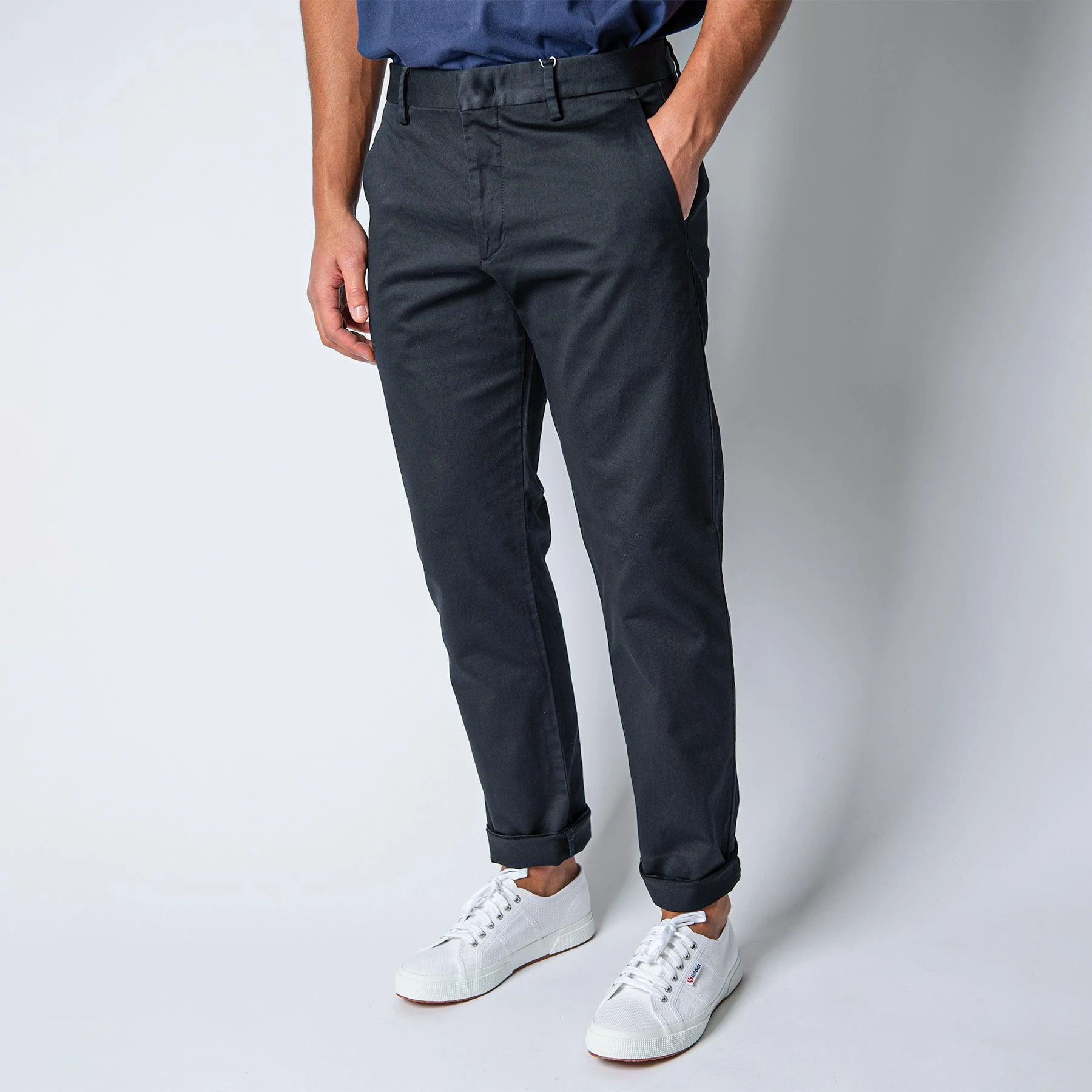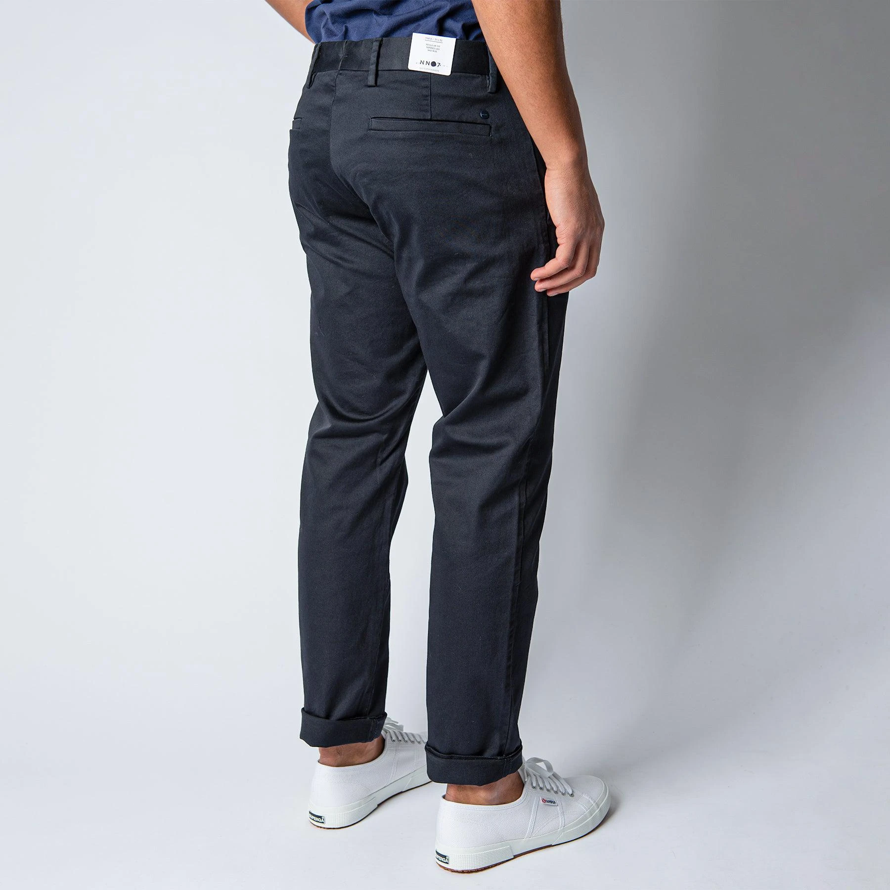 • Byxan är medelhög i midjan och avsmalnande över benen, men rak från knä ner till fotslut. Byxan stängs med en dold knäppning och dragkedja.