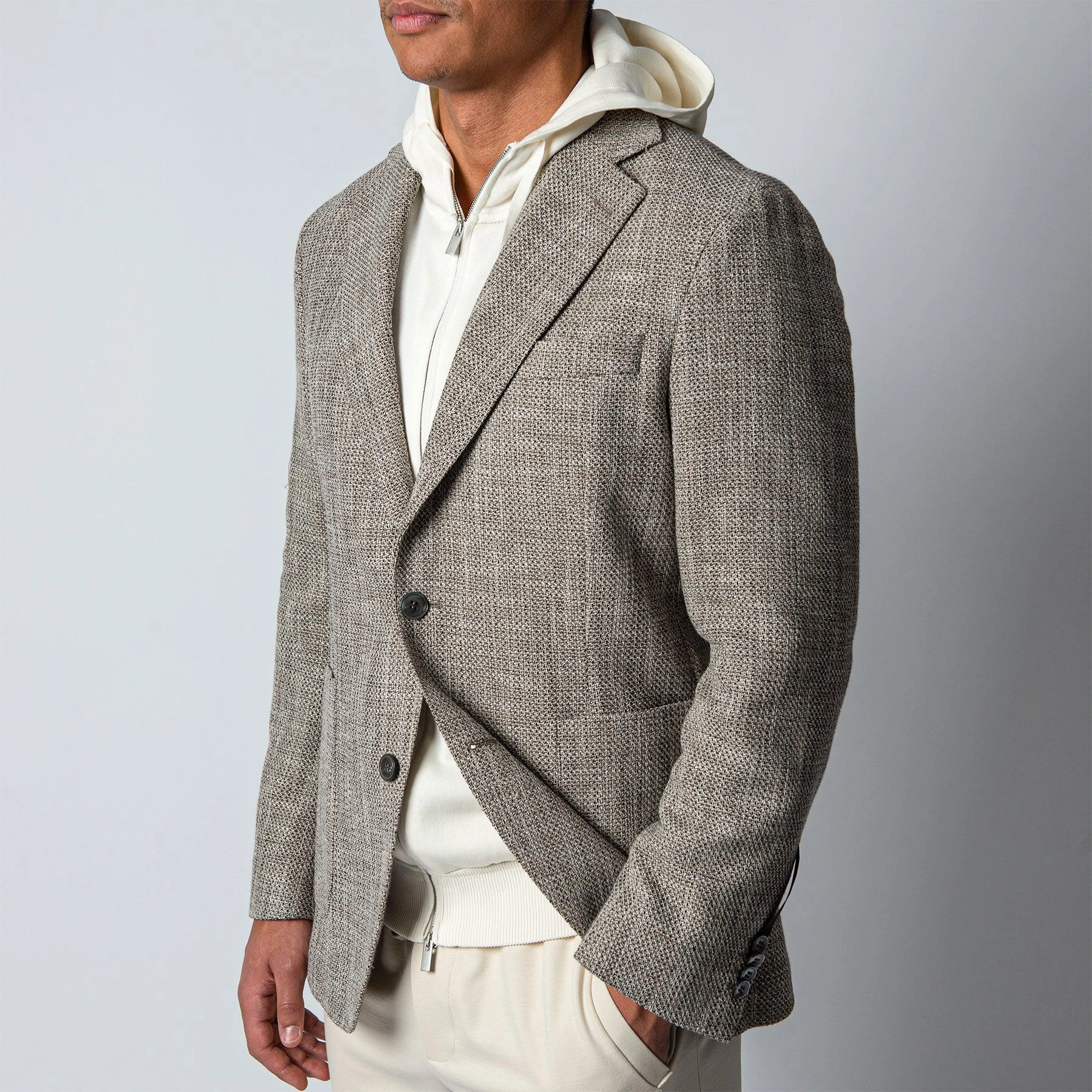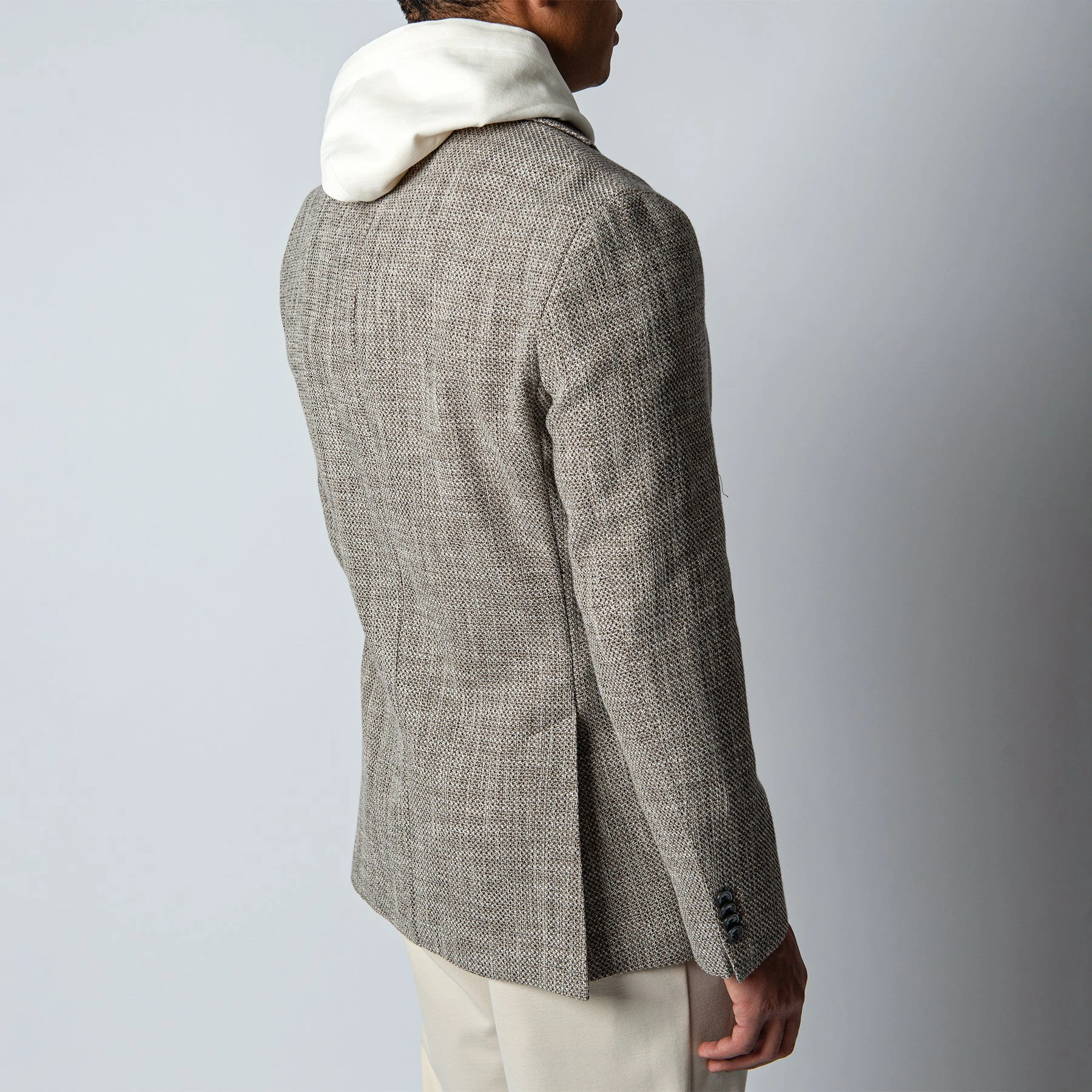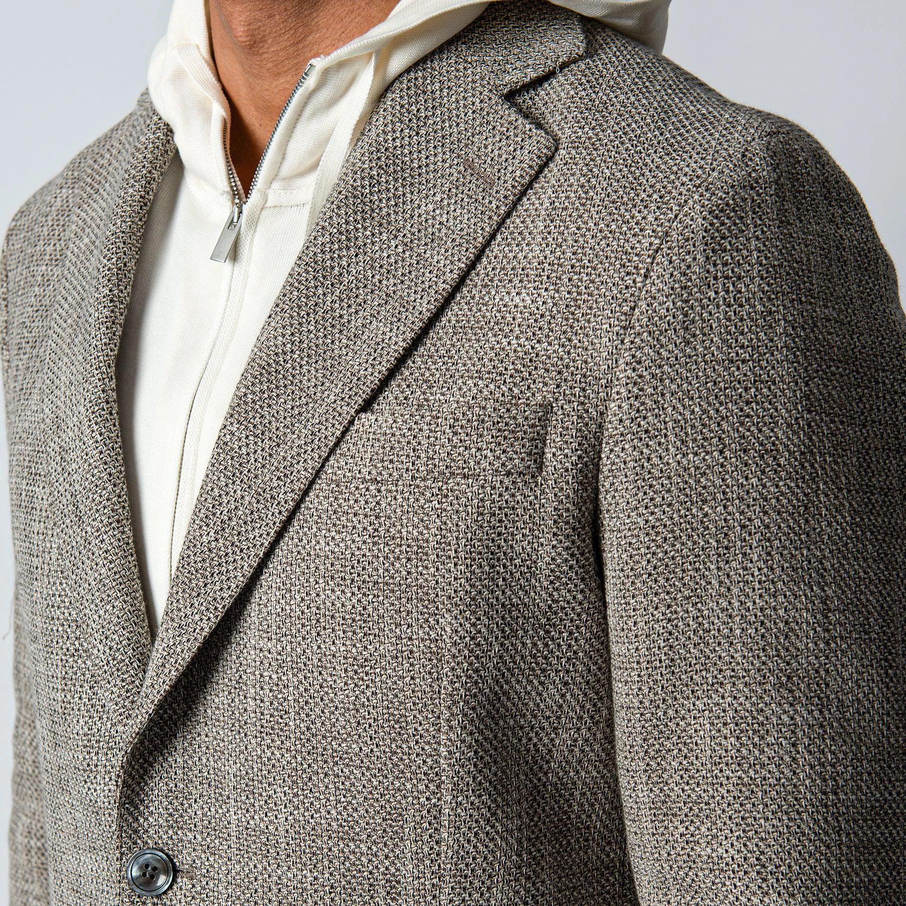 • Kavajen stängs med gråa pärlemoknappar och har breda slag. Kavajen har lappade sidfickor samt en bröstficka på vänster bröst. Kavajen är ofodrad på fram- samt baksida och är avslappnad i passformen.