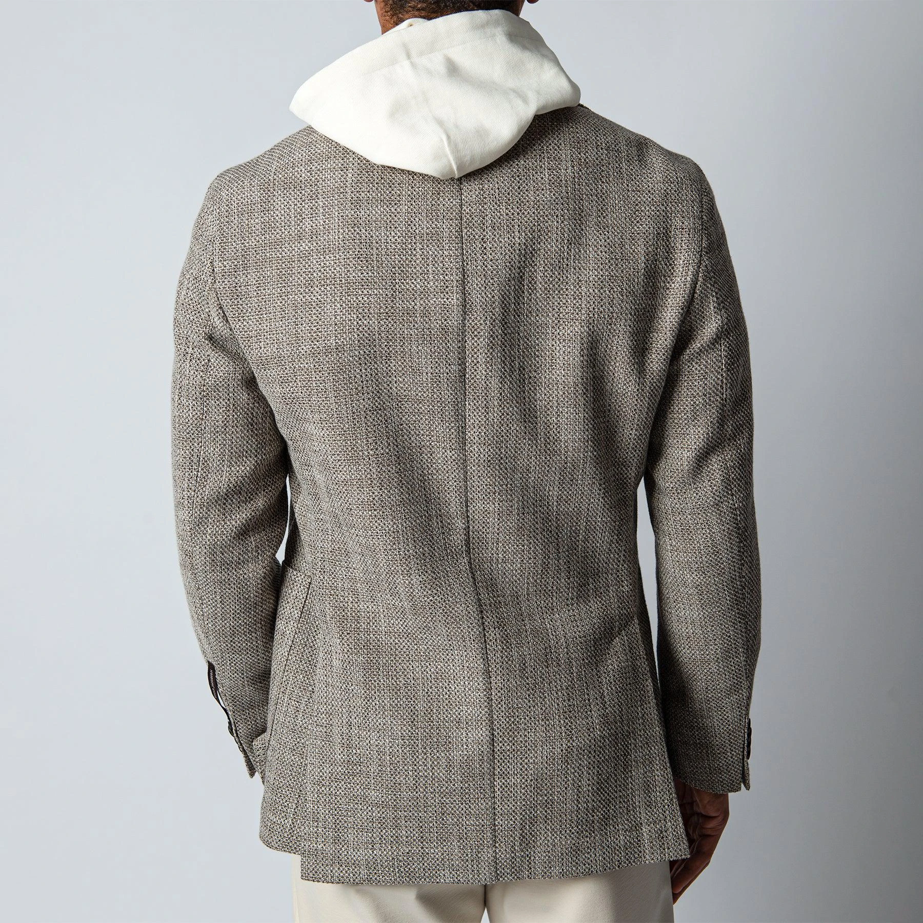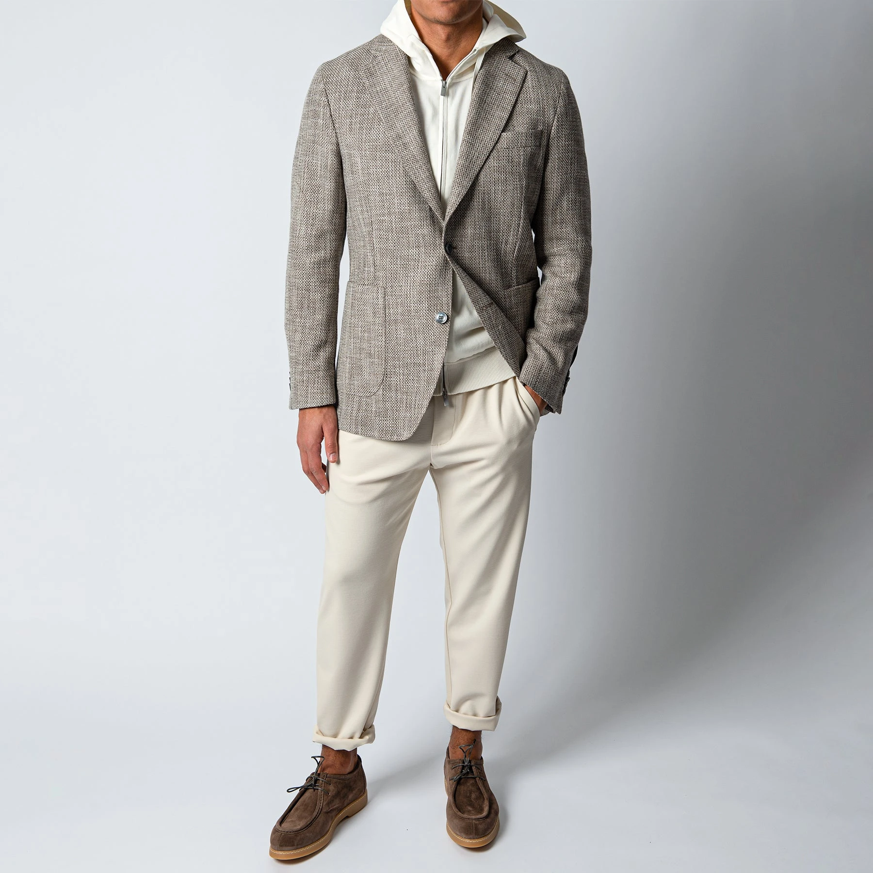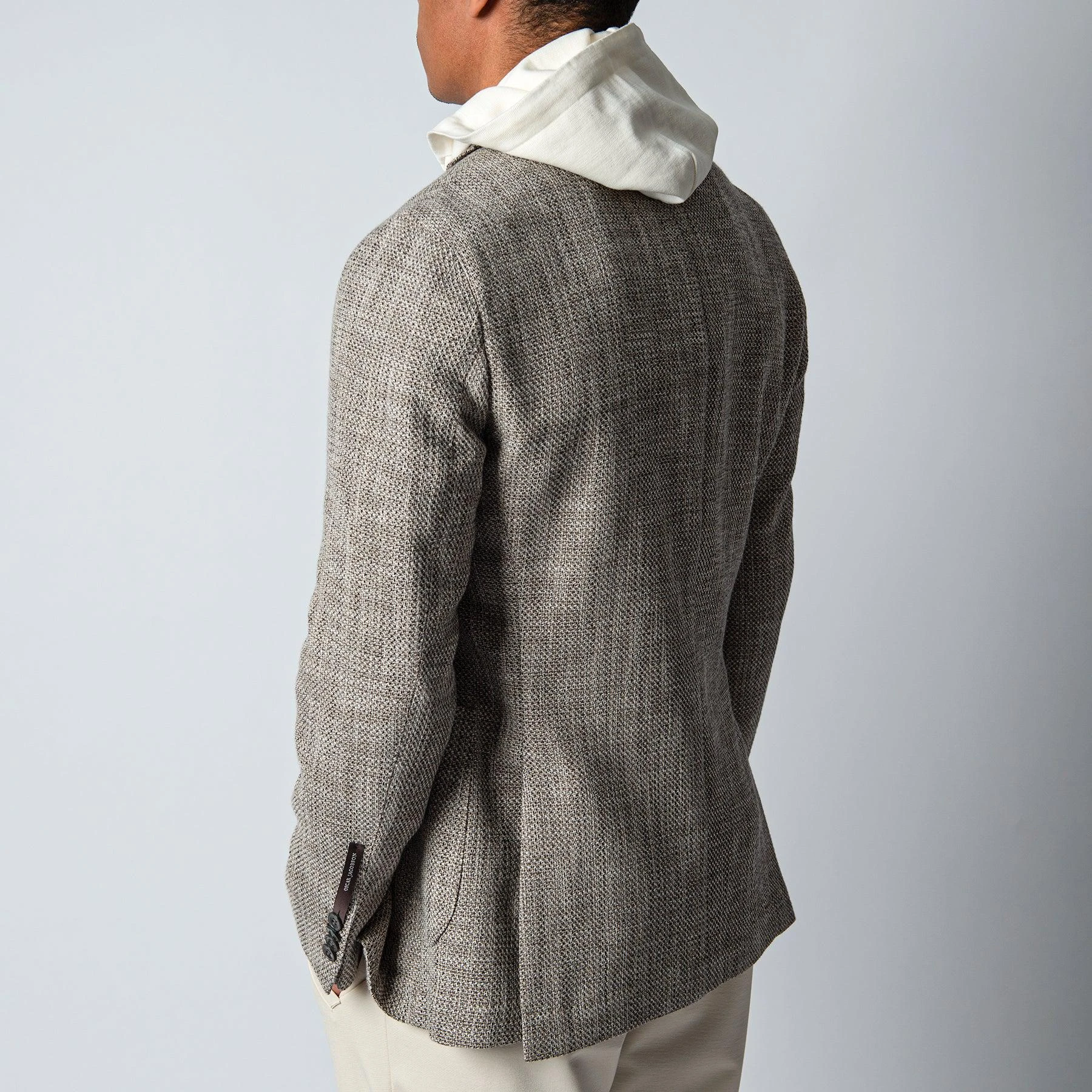 • Kavajen stängs med gråa pärlemoknappar och har breda slag. Kavajen har lappade sidfickor samt en bröstficka på vänster bröst. Kavajen är ofodrad på fram- samt baksida och är avslappnad i passformen.