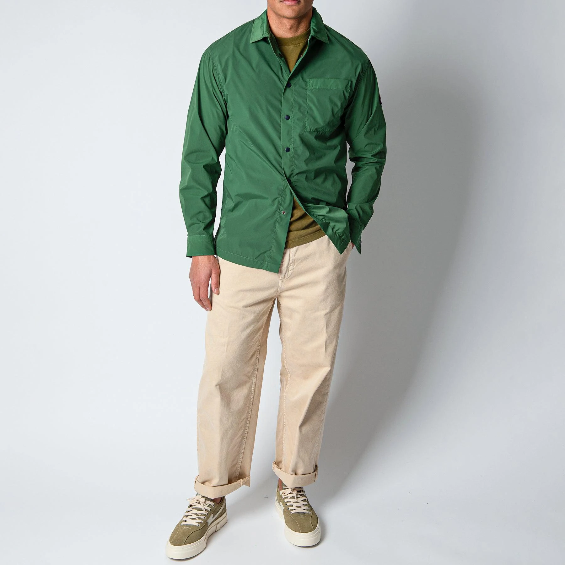 • Overshirten stängs med tryckknappar och har ten lappad bröstficka på vänster bröst.
