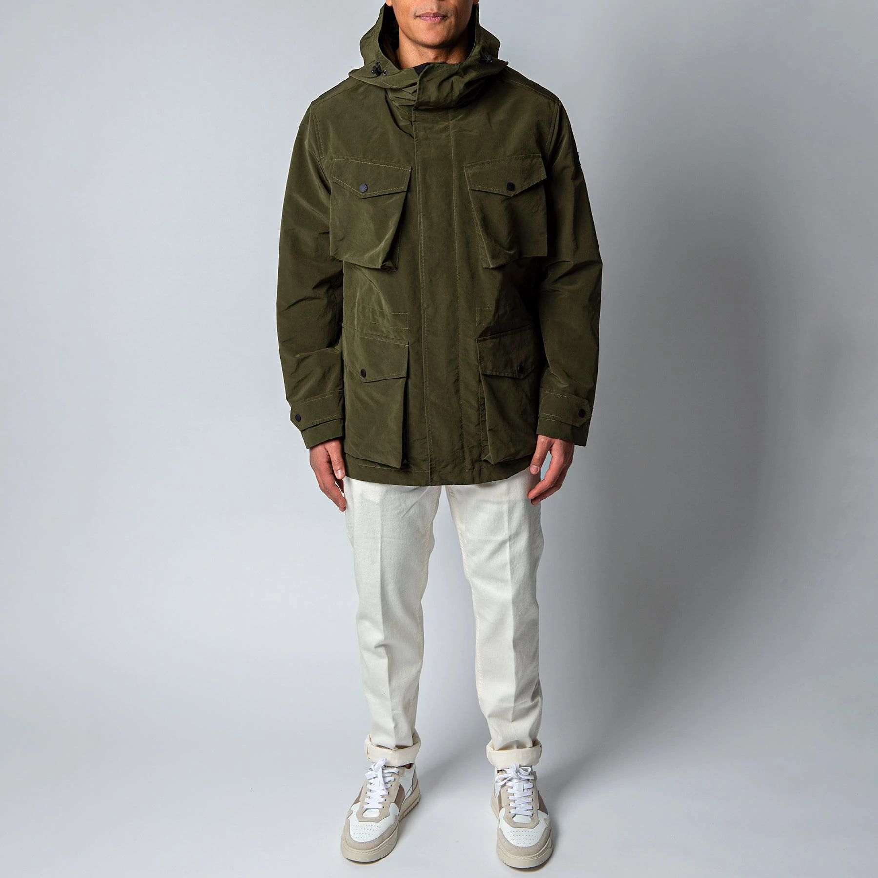 • Jackan har dubbla bröstfickor samt sidfickor som stängs med ficklock och knapp samt stängs med dragkedja som täcks med knappar. Jackan har en rymlig luva och en dragsko i midjan. Jackan går nedanför midjan ochär boxig i modellen.