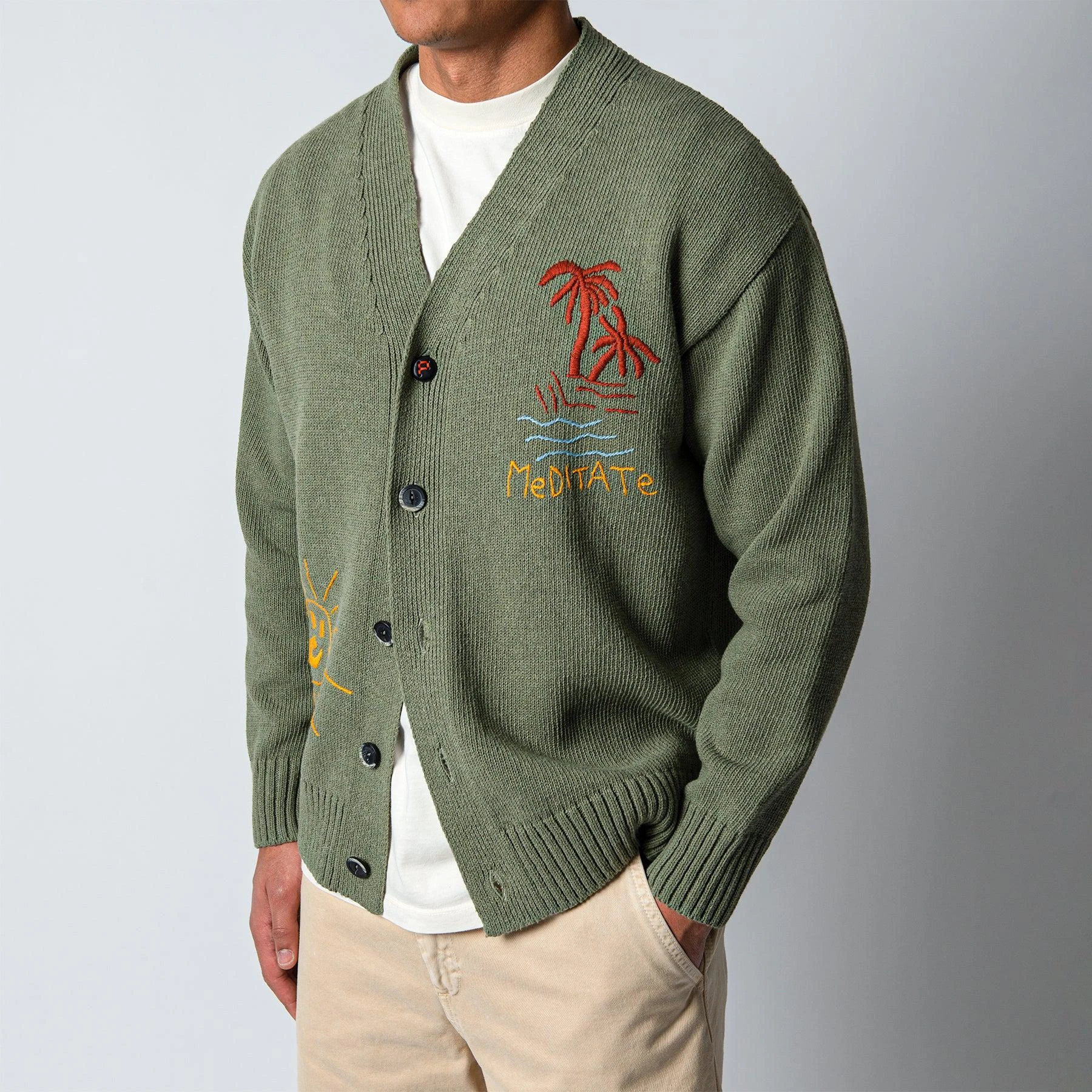 • Tröjan har palmer, en sol och ”Meditate” broderat på framsidan och är sydd i en skön bomullskvalité.