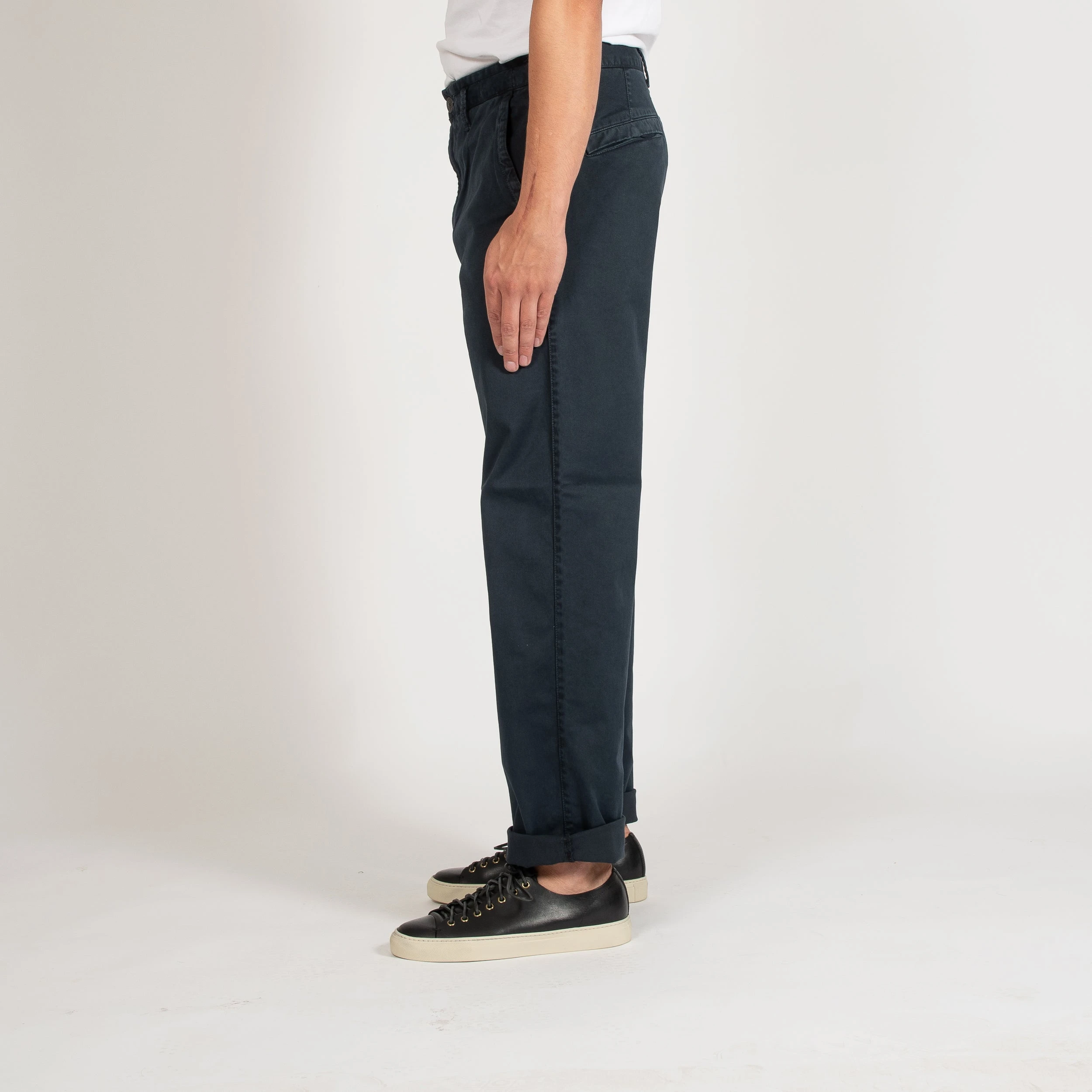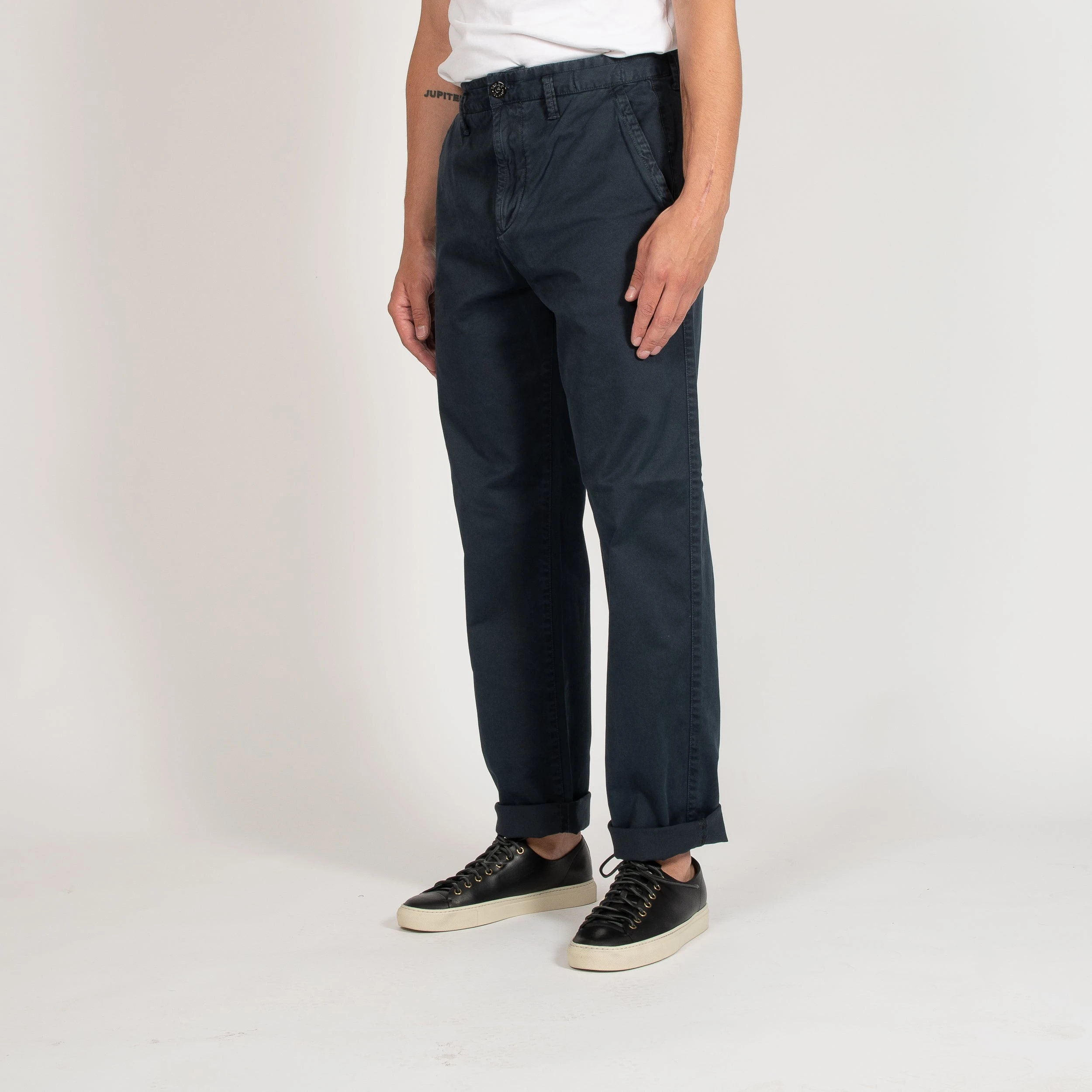 • Byxorna är höga i midjan och breda över låren med ett brett fotslut. Chinosen har två stycken snedställda sidofickor samt två stycken bakfickor och märkets logotyp baktill.