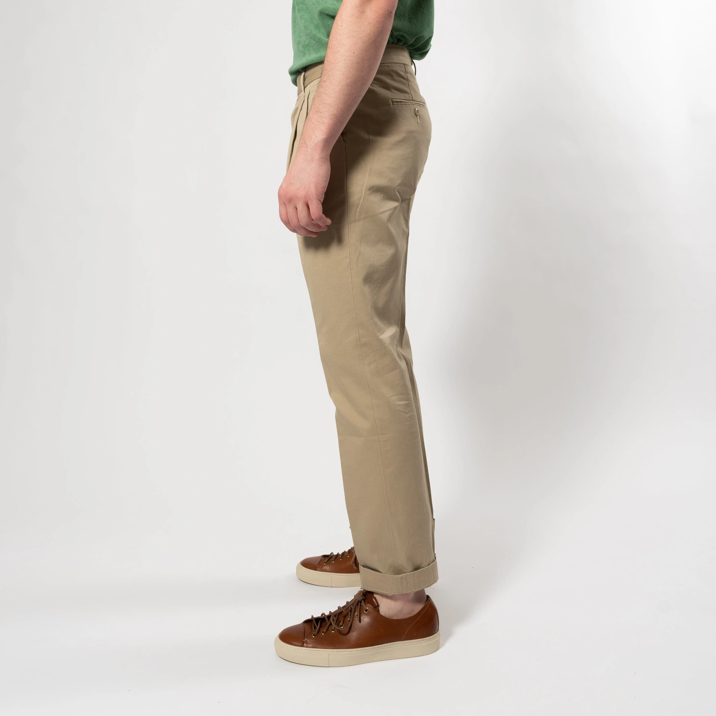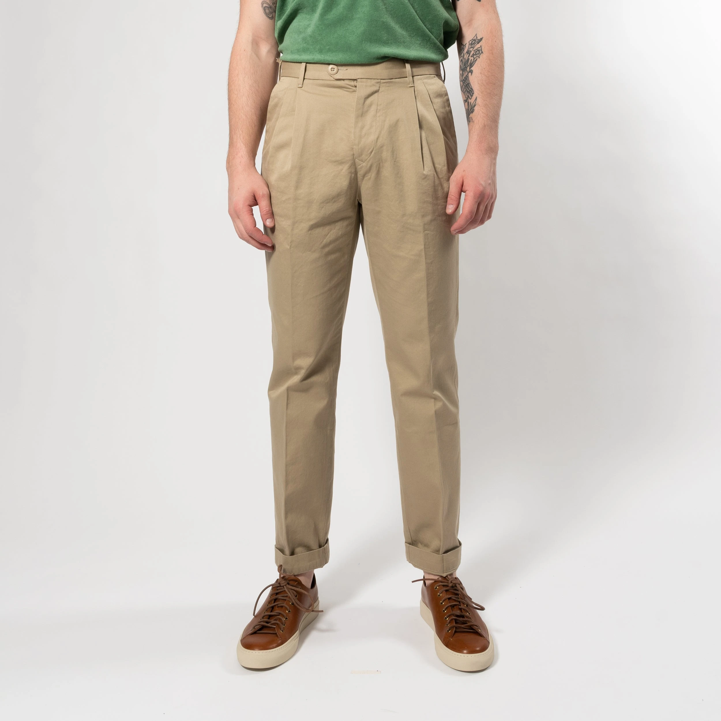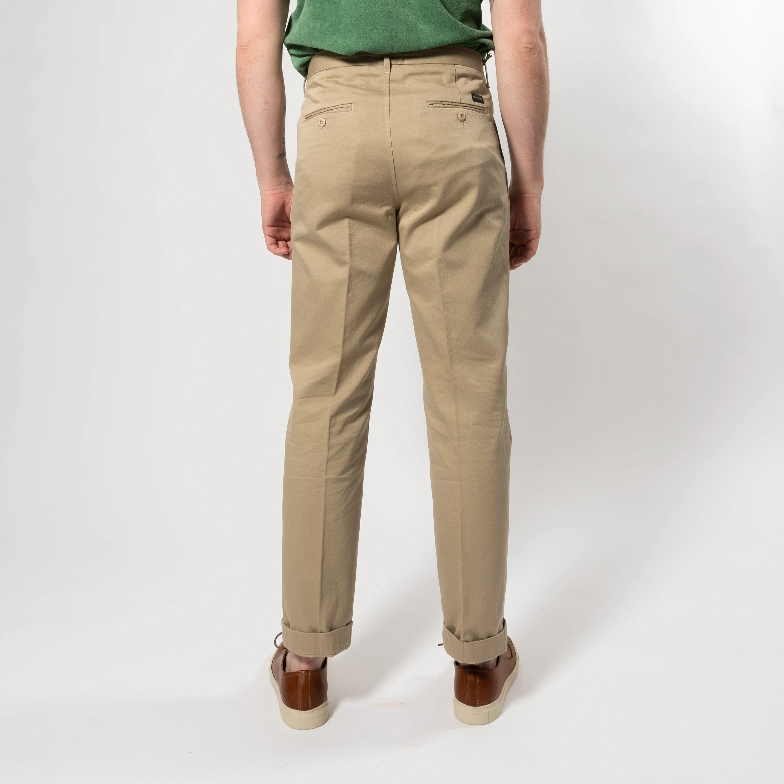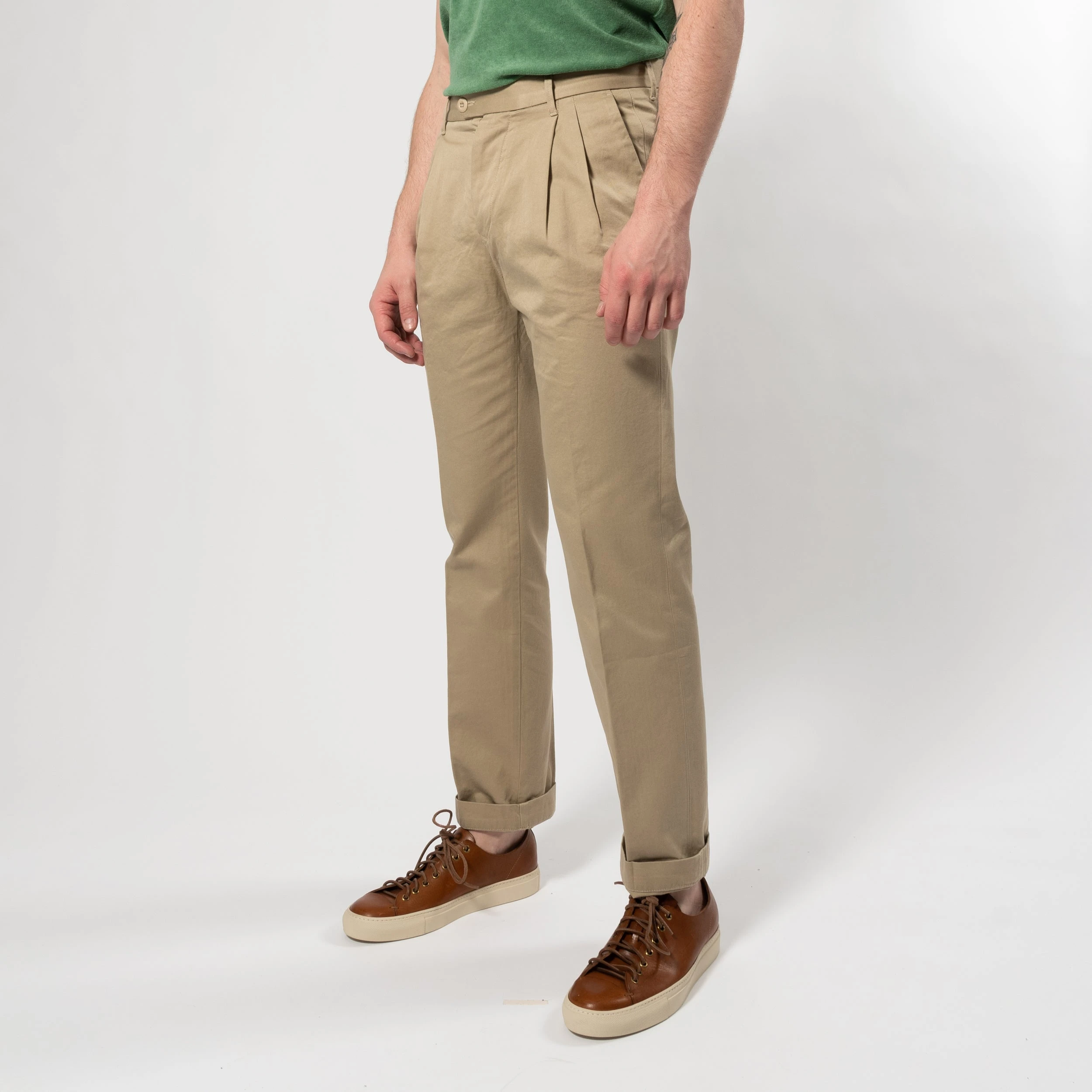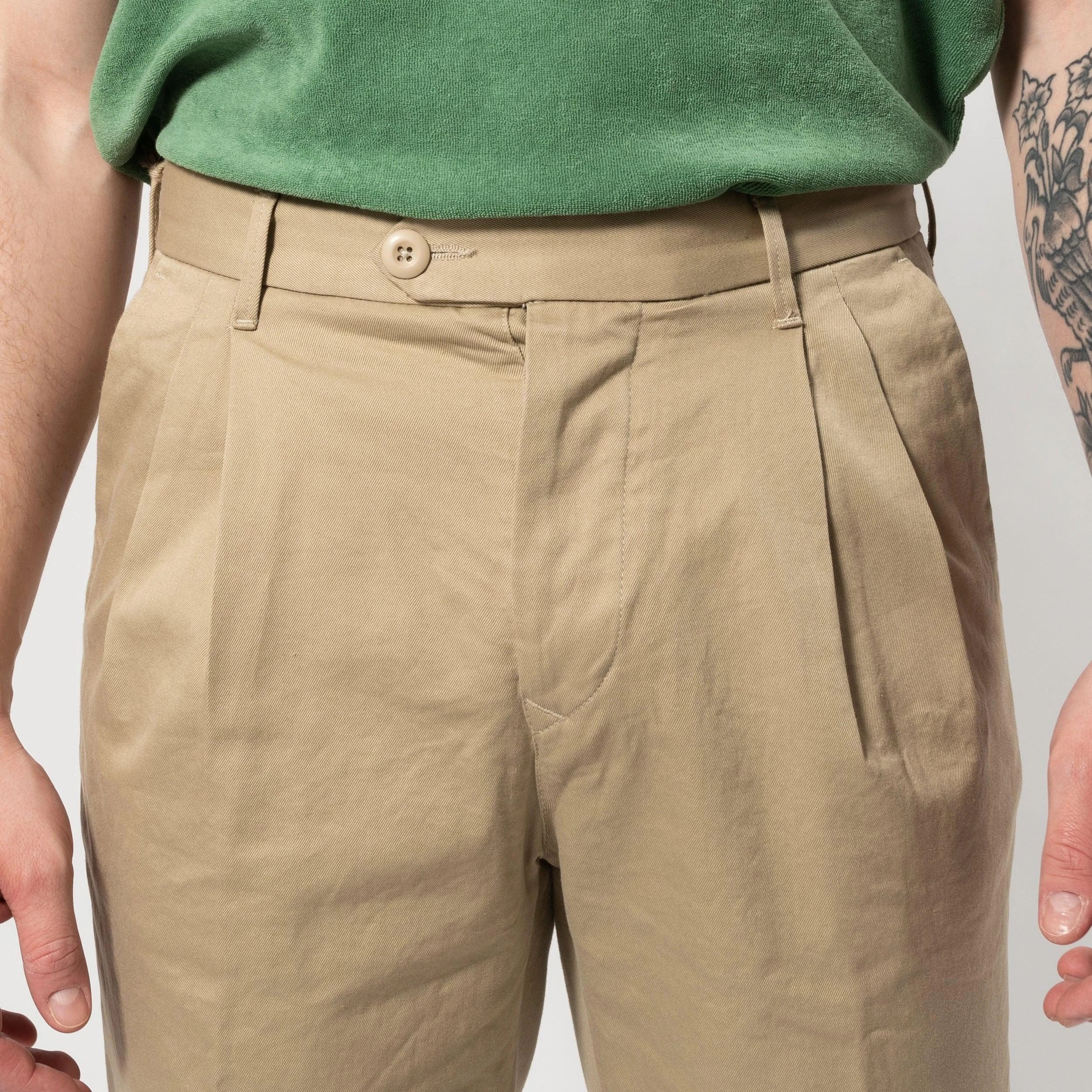 • Byxan är hög i midjan och vid över låren med ett normal-brett fotslut. Byxan stängs med knappar och har dubbla frontveck. Byxan har snedställda framfickor och två bakfickor med knapp.