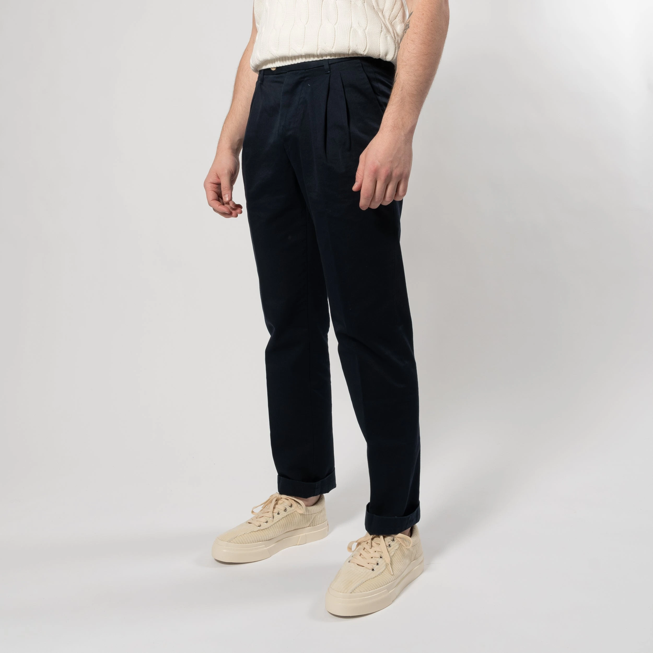 • Byxan är hög i midjan och vid över låren med ett normal-brett fotslut. Byxan stängs med knappar och har dubbla frontveck. Byxan har snedställda framfickor och två bakfickor med knapp.
