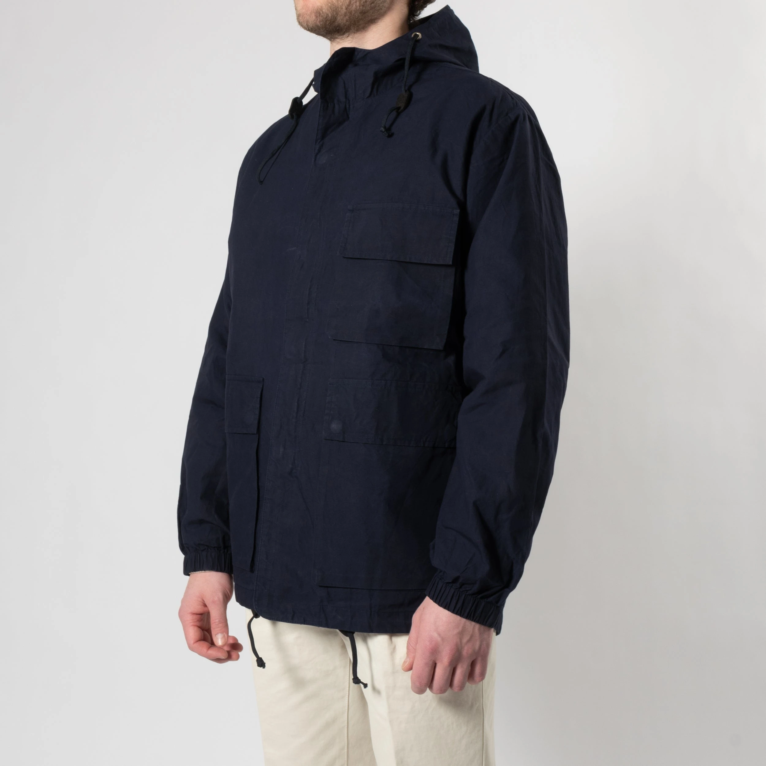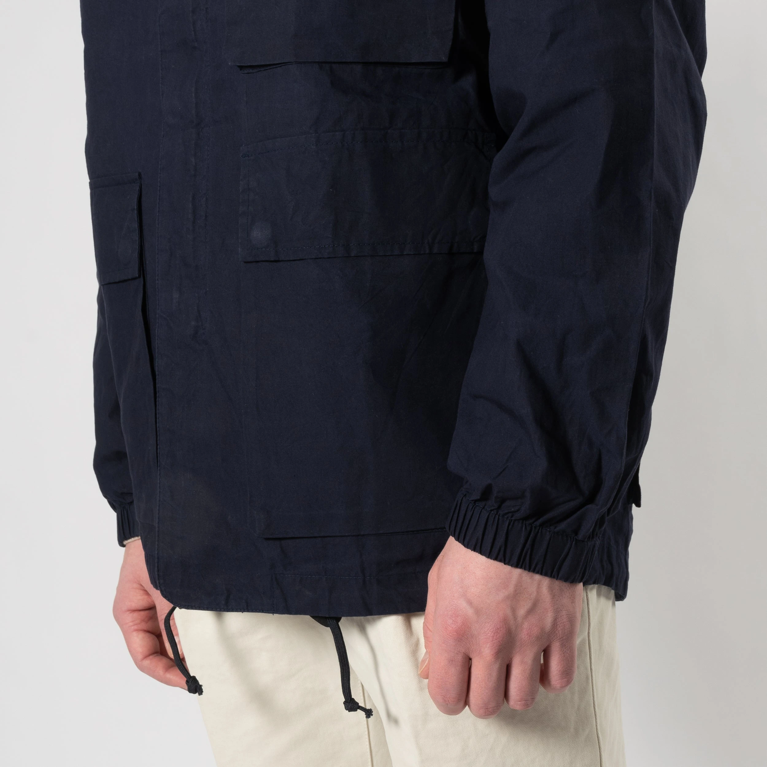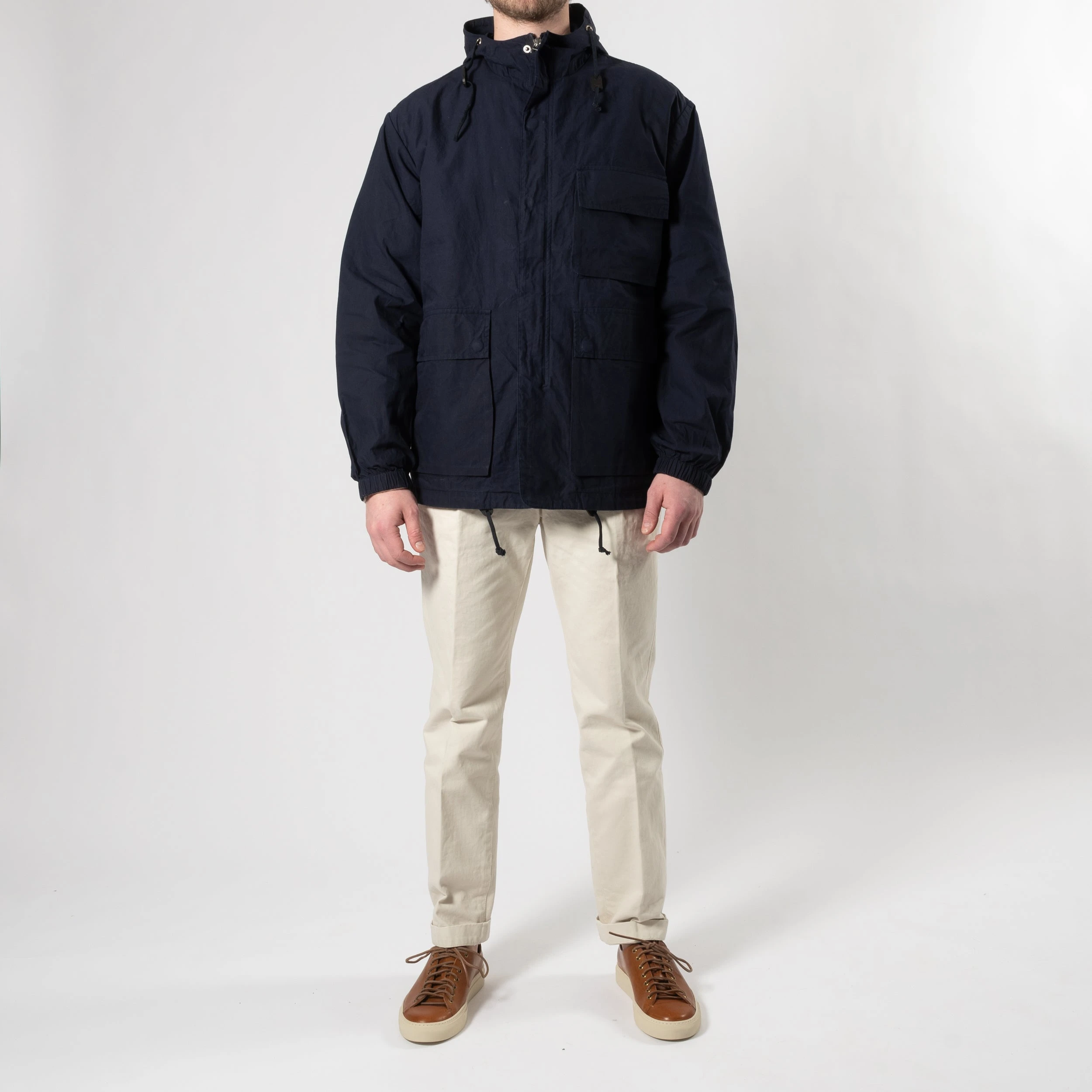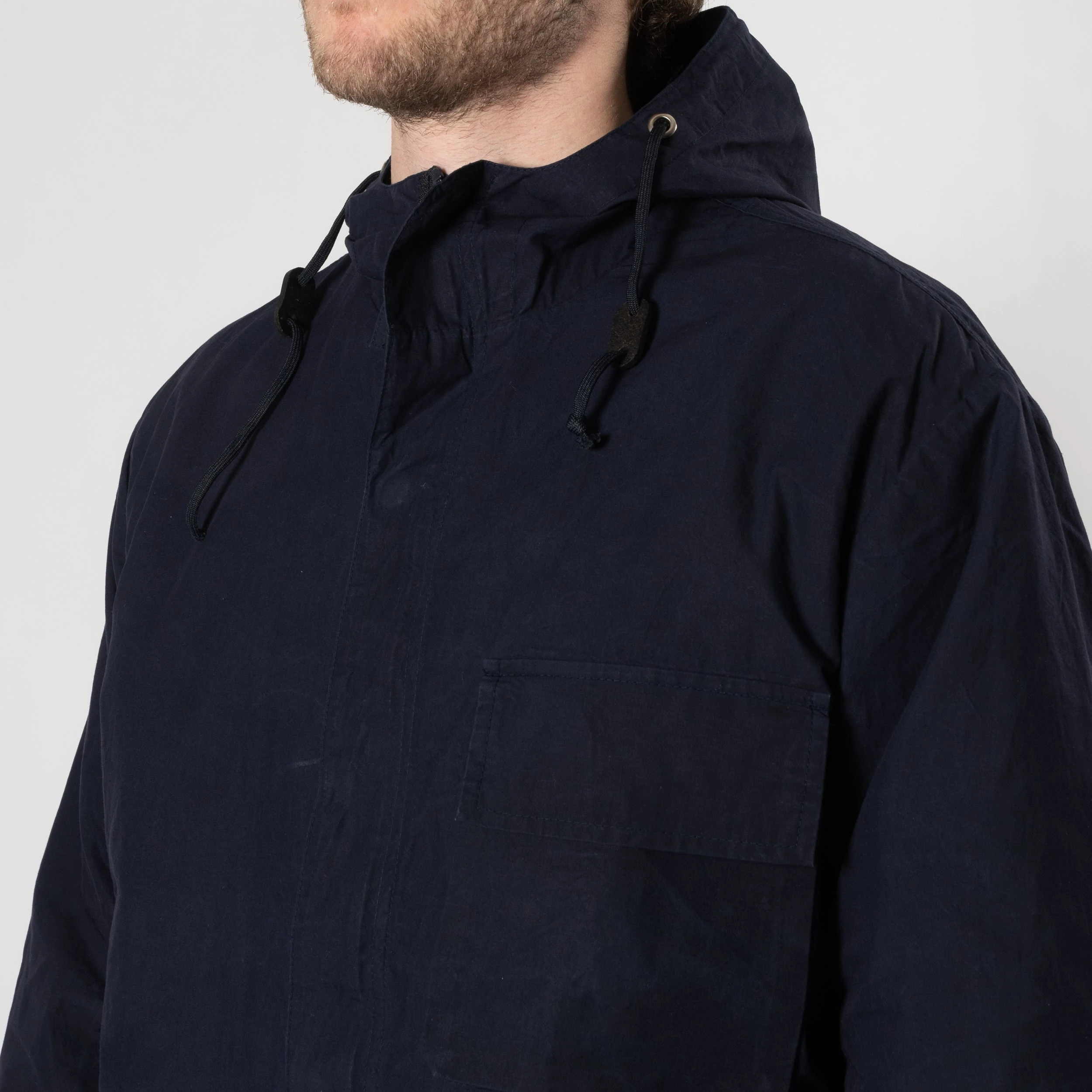 • Jackan är gjord i en behandlad bomullskvalitét för att avvisa regn. Jackan är boxig i modellen.