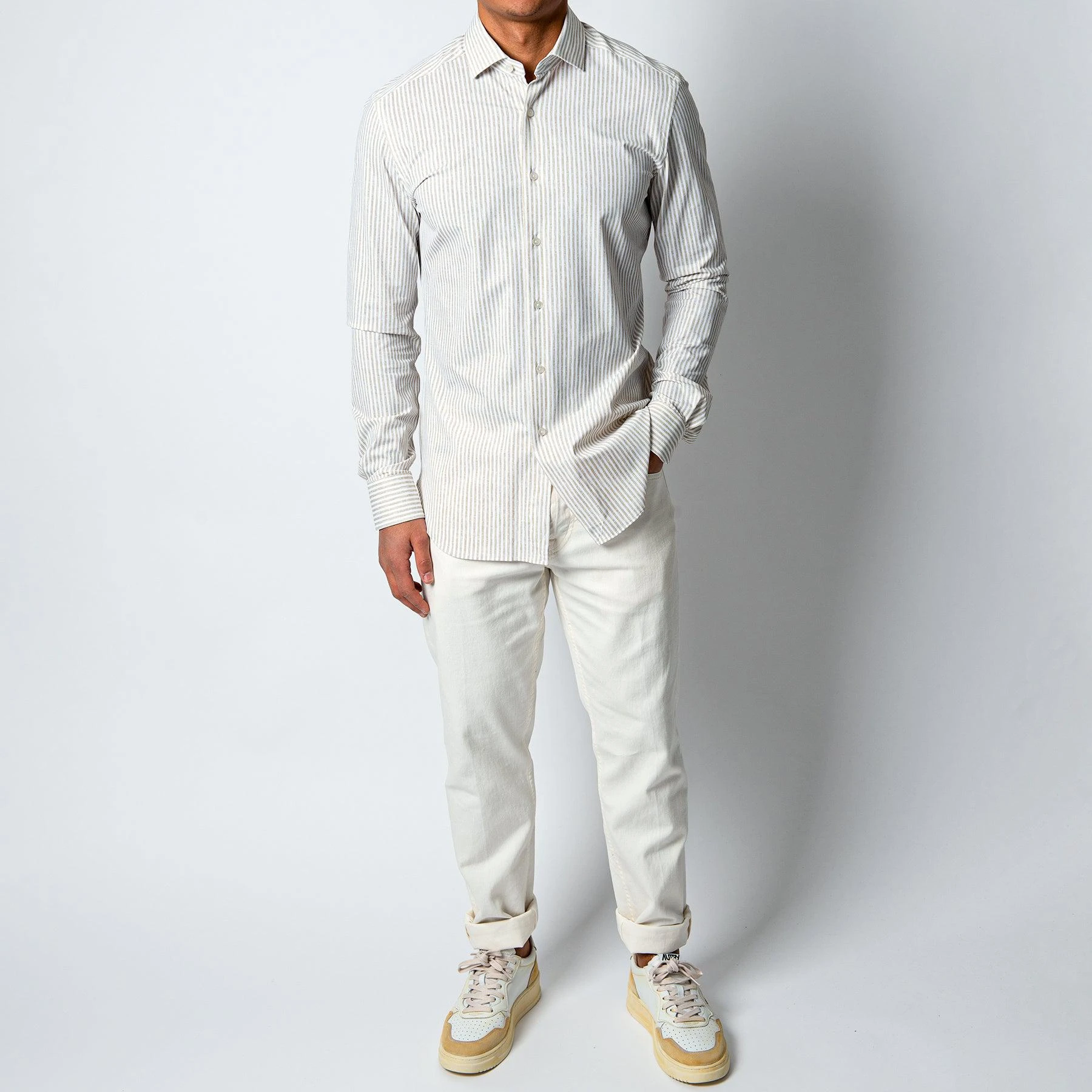 • Skjortan stängs med matchande pärlemoknappar och har en klassisk krage. Skjortan är svagt slimmad i modellen.