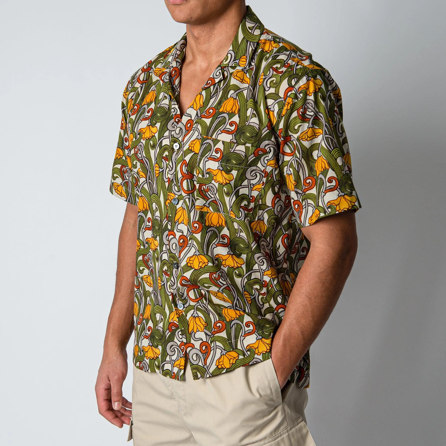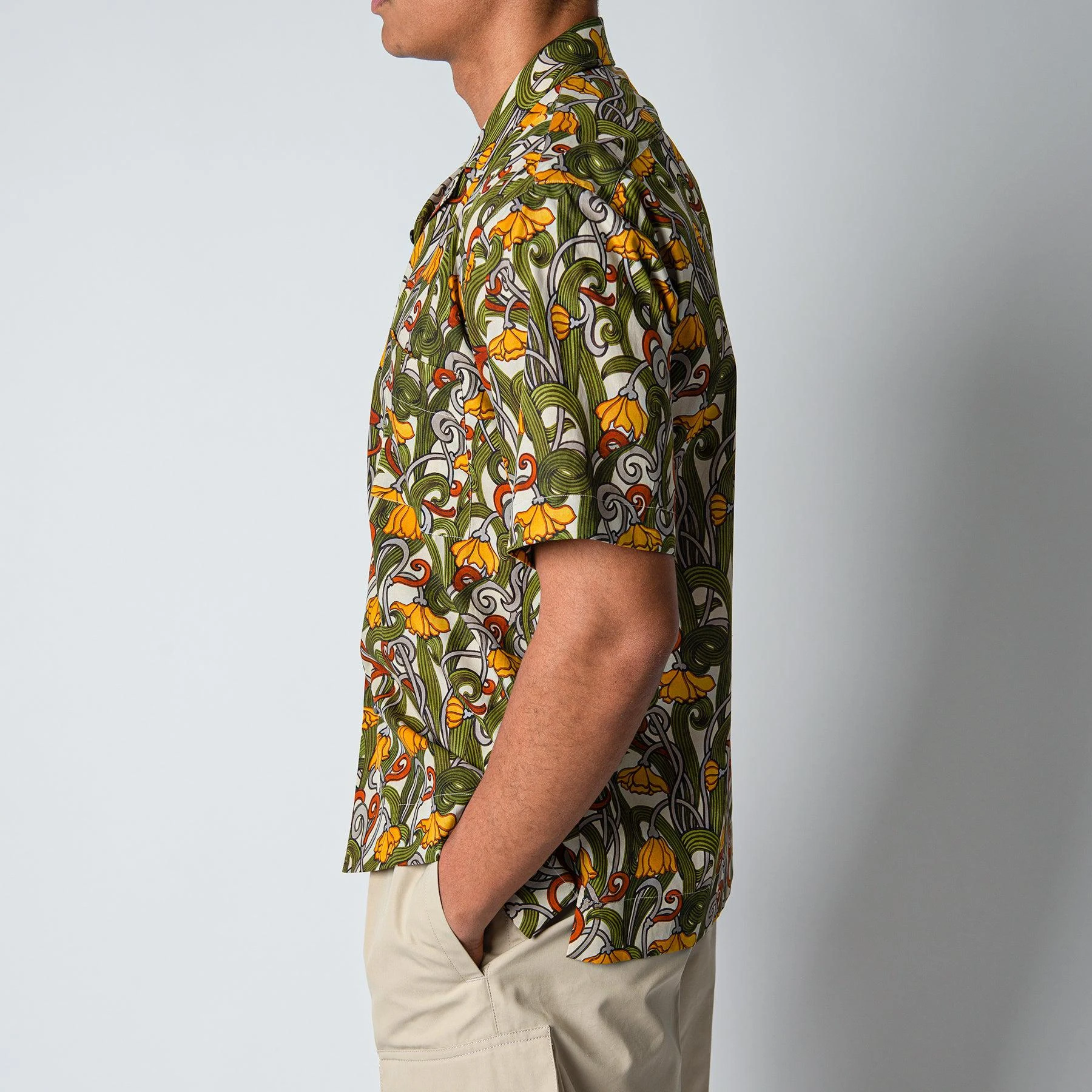 • Skjortan stängs med matchande pärlemoknappar och har en vikt ”bowling-krage”. Skjortan är svagt slimmad i passformen och har en enkel patchad bröstficka på vänster bröst.